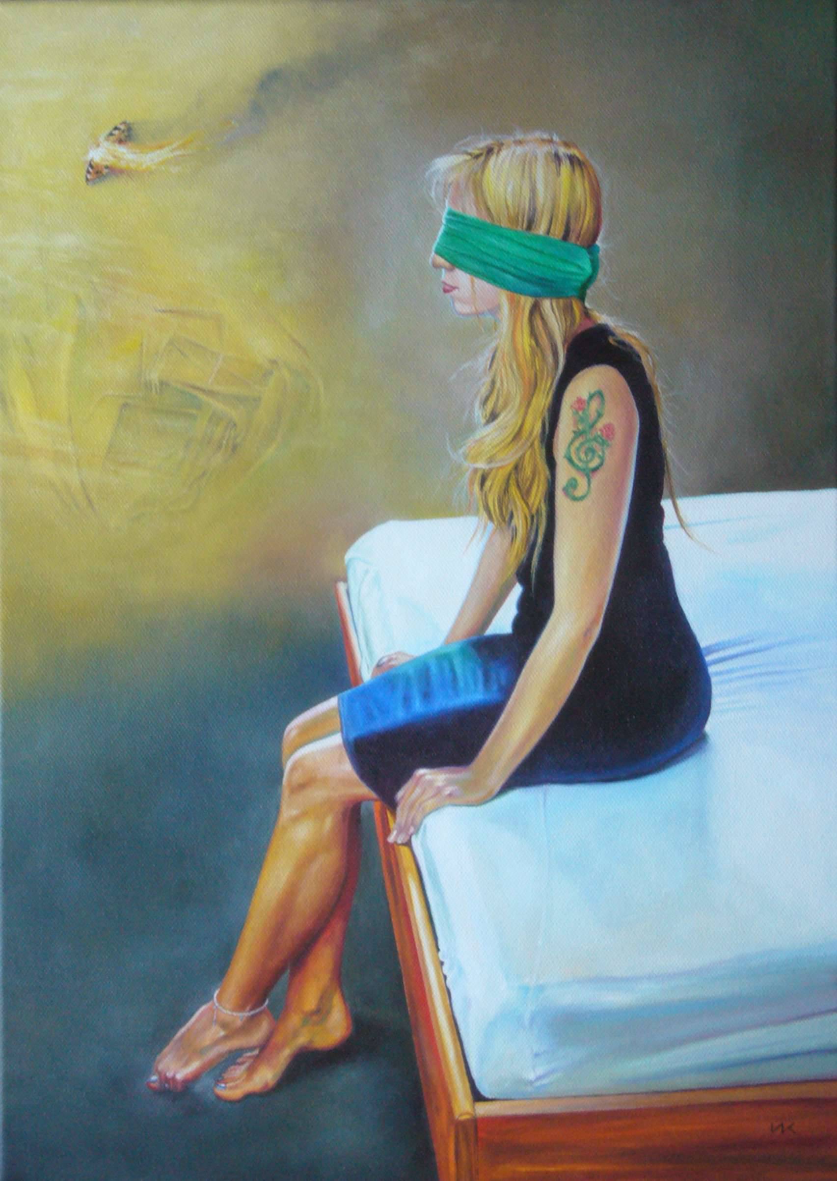 Obraz przyciąga wzrok dzięki swojej intrygującej kompozycji. Dominują tu stonowane kolory: miękkie zielenie, brązy i odcienie błękitu, które delikatnie mieszają się ze sobą, tworząc spokojne, lecz nieco tajemnicze tło. Na jego pierwszym planie widzimy kobietę siedzącą na łóżku. Ma długie, złote włosy, spływające po plecach i zieloną opaskę na oczach, co przyciąga uwagę i wywołuje niepewność. A co tam się dzieje? To jak zagadka. Atmosfera dzieła jest nieco enigmatyczna. To, że kobieta jest z zawiązanymi oczami, nadaje obrazowi uczucie zamyślenia i introspekcji. Mamy wrażenie, że artysta celowo użył techniki łagodnych pociągnięć pędzla, aby stworzyć tę delikatność i dodać soft touch. Obserwator może poczuć zarówno spokój, jak i subtelne napięcie. Obraz może wywoływać uczucie ciekawości i chęci odkrycia, co kryje się za tą zasłoną na oczach. Mówi się: "ciekawość to pierwszy stopień do piekła", ale tu ciekawość inspiruje. Można zastanawiać się, co ten obraz chce nam powiedzieć - może to refleksja nad wewnętrzną więzią z samym sobą? Albo próbą znalezienia sensu w chaosie codzienności? Z drugiej strony mamy też pewną melancholię. Jakby jednak było jej troszkę trudno. Ten motyl na horyzoncie to jak zapowiedź zmiany, nadziei. To wszystko sprawia, że obraz staje się emocjonalnym journey dla każdego, kto na niego spojrzy.