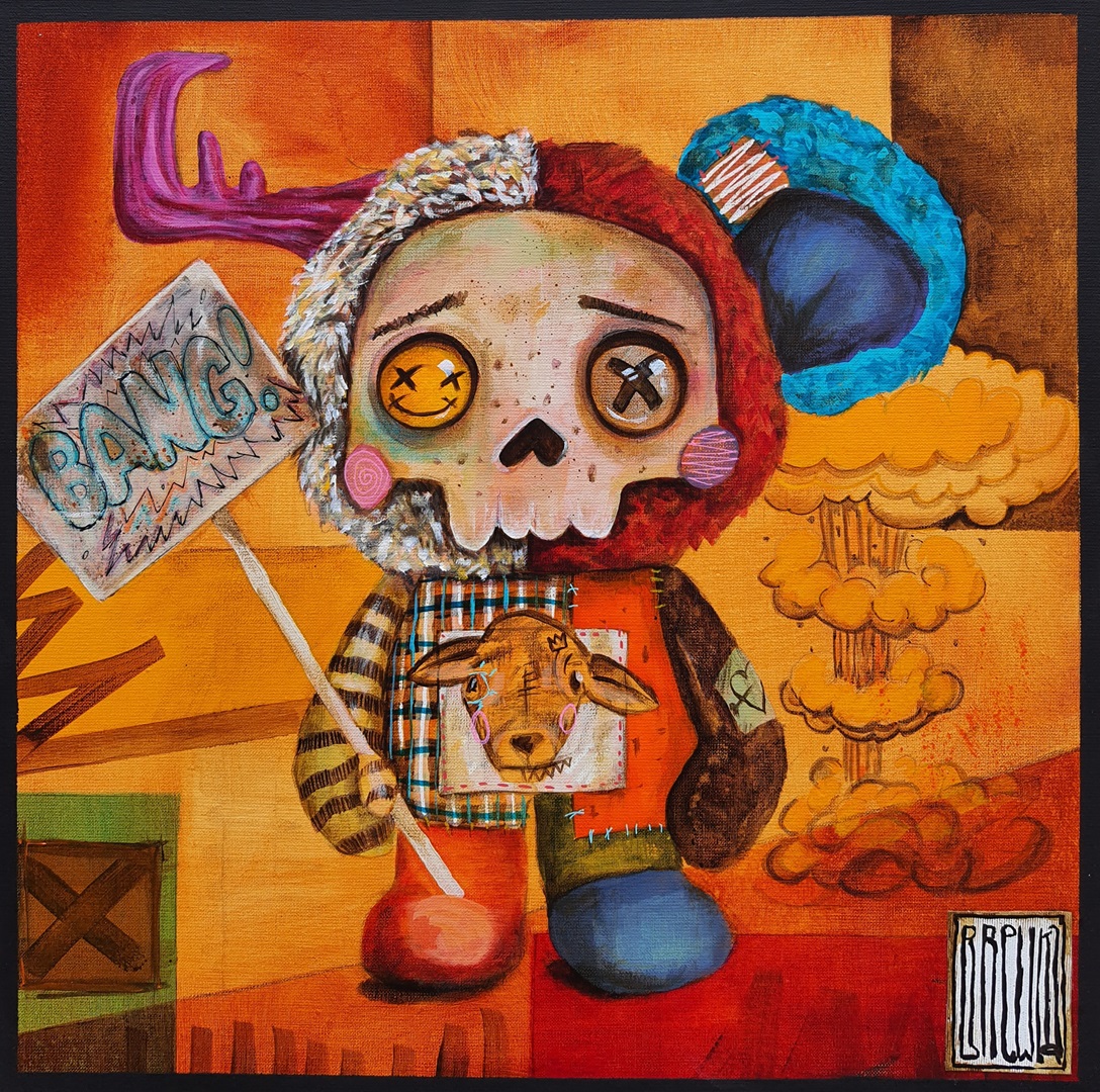 Obraz emanuje unikalnym stylem pełnym surrealistycznych detali. Na pierwszy plan wysuwa się postać przypominająca lalkę, z czaszką zamiast twarzy. Jej oczy, zastąpione guzikami, nadają całości lekko groteskowy wyraz. Kolory są żywe i kontrastują ze sobą - od ciepłych odcieni pomarańczu i czerwieni, po chłodne błękity i fiolety. Kompozycja jest chaotyczna, ale jednocześnie harmonijna. Patrząc na to, można się poczuć jak w innej rzeczywistości. Artysta zastosował mieszankę technik malarskich z kolażowymi elementami. Jest coś z playful spirit tego dzieła, jakby zapraszało do zabawy i refleksji. Jest pomysłowo i z przymrużeniem oka. Tim Burton spotyka warunki świata dziecięcej wyobraźni? Możliwe. Fascynuje mnie sposób, w jaki artysta przedstawia emocje. Ta praca może wywołać u odbiorcy zarówno śmiech, jak i pewien niepokój. „To jest dziwne, ale fajne!” - mogłoby powiedzieć dziecko, zauważając niezwykłość postaci. Ten obraz jest jak zagadka, którą chce się odkrywać.