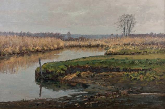 Obraz przedstawia spokojny krajobraz z harmonijną kompozycją pełną zieleni, brązów i szarości, co nadaje mu nieco melancholijny i zimowy charakter. Szeroki horyzont o miękkich, rozmytych tonacjach przywodzi na myśl późne popołudnie. Dominująca rzeka łagodnie wije się przez środek płótna, odbijając matowe niebo. Po prawej stronie samotne drzewo wzbogaca krajobraz, podkreślając jego prostotę i naturalność. A trawy i zarośla otaczająca rzekę dodają tekstury i głębi. Atmosfera obrazu jest spokojna, cicha, jakby nawet czas się zatrzymał. Hawk! Czujesz ten chill? Światło wpada miękko, nie oświetlając ostro, raczej delikatnie modelując kształty. Artystyczny styl realistyczny, z detalem widocznym w każdej kępce trawy, sprawia, że obraz wygląda jak zatrzymana w czasie fotografia. Technika olejna daje mu głębię i pozwala uzyskać subtelne przejścia kolorów, które wpływają na spokojny odbiór całości. To jak widok z okna, gdy patrzysz na rzekę po deszczowym dniu. Może skłaniać do refleksji o przemijaniu, spokoju natury i własnym miejscu w świecie. Obraz jest jak magiczne picture - wywołuje w człowieku poczucie nostalgia i tęsknoty za chwilą oddechu. Moim zdaniem, patrząc na tę scenę, można wręcz poczuć zapach mokrej ziemi i usłyszeć szum wody. Myślę, że lubię ten obraz, bo przypomina mi wycieczki na wieś, gdzie czas płynie wolniej. Czyż to nie jest właśnie to magiczne połączenie człowieka z naturą?
