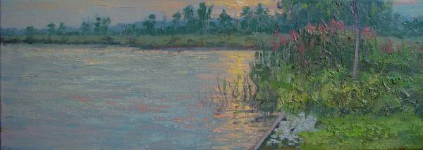 Na obrazie widzimy spokojne jezioro otoczone bujną roślinnością. Woda mieni się odcieniami błękitu i szarości, a delikatne fale odbijają ciepłe światło zachodzącego słońca. Kontrastujące z wodą, ciemnozielone i czerwonawe krzewy rozkładają się malowniczo na linii brzegowej. Drzewa w oddali tworzą rozmytą linię horyzontu. Atmosfera jest wręcz dreamlike, emanuje spokojem i nostalgią. Artysta zastosował technikę impasto, nakładając grubą warstwę farby, co nadaje tekstury i głębi temu idyllicznemu krajobrazowi. Można niemal poczuć lekki powiew wiatru na twarzy i usłyszeć subtelne dźwięki natury. Obraz może budzić uczucia wyciszenia i tęsknoty za chwilą zatrzymaną w czasie. Ktoś mógłby pomyśleć: "Wow, chciałbym tam być!" Dla mnie, jako odbiorcy, ten widok jest jak ucieczka od codzienności, miejsce, gdzie czas przestaje mieć znaczenie. Obraz wydaje się mówić: żyj tu i teraz, doceniaj piękno natury. To miejsce to magiczny świat zamknięty w obrębie ram.