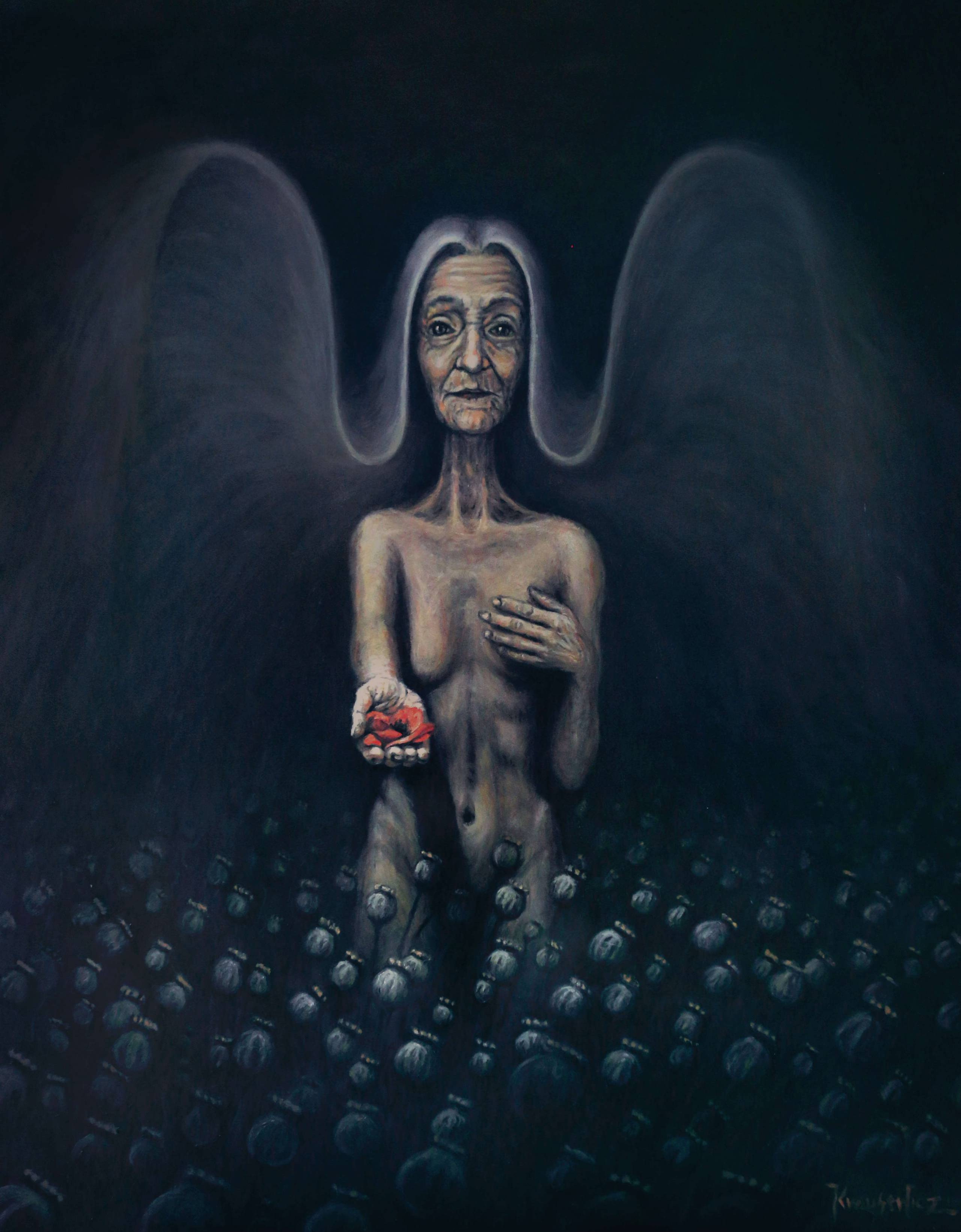 Na obrazie widzimy postać staruszki wznoszącej nagą dłoń z jasnoczerwoną różą, co stanowi kontrast wobec ciemnego, mrocznego tła. Jej siwe włosy tworzą skrzydła, co dodaje nadnaturalnego elementu tej scenie. Dominują chłodne odcienie szarości i granatu, budując atmosferę tajemnicy i refleksji. Obraz emanuje uczuciem zagubienia, a może nawet smutkiem. Technika jest subtelna, warstwy farby nakładane są wygładzonymi ruchami, tworząc niemal eteryczny efekt. Dzieło wydaje się balansować między realizmem a mistycyzmem, co skłania widza do introspekcji. Symbolika czerwonej róży jest intrygująca — być może to znak nadziei lub miłości w surowym otoczeniu. "It's haunting," można by powiedzieć, chłonąc tę wizję. Dla dziecka, to cudowne bajkowe stworzenie z wielkimi skrzydłami. Zastanawiając się nad emocjami, jakie obraz wywołuje, można odczuć pewien niepokój, pytając: co ta postać czyni w tak ciemnym miejscu? Wszystko razem składa się na głęboki, niemal egzystencjalny przekaz, który każdy interpretuje na swój sposób.