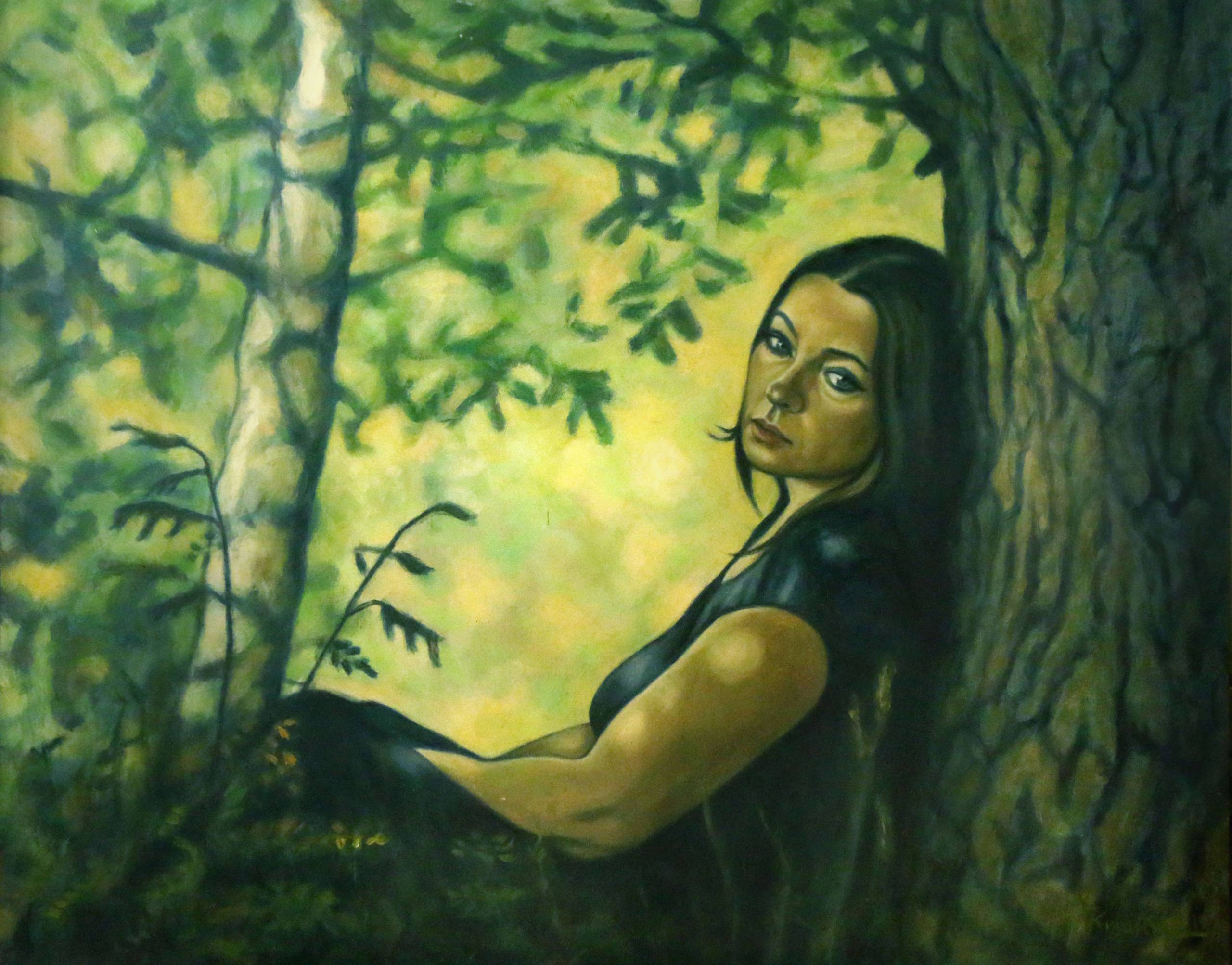 Na obrazie widzimy kobietę opartą o potężne drzewo w gęstym lesie. Dominują zielone i żółtawe odcienie, które rozświetlają scenę i nadają jej naturalną aurę. Liście drzewa tworzą delikatne cienie, które zdają się tańczyć na kobiecie, a jej spojrzenie jest pełne nostalgii. Atmosfera obrazu przywodzi na myśl spokój i pewną tajemniczość, jakby zaraz miał się zacząć magiczny moment. Styl artysty jest realistyczny z nutką impresjonizmu – lekkie, miękkie pociągnięcia pędzla tworzą efekt dreamlike. Kobieta emanuje ciszą i refleksją, a obraz może wywoływać uczucie zadumy i spokoju w oglądającym. Można poczuć, jak gdyby szum liści otaczał nas wokół, a czas płynął wolniej. Jest w tym coś intrygującego, jakby artysta chciał nas zatrzymać na chwilę w tym idyllicznym "moment". Patrząc na tę scenę, czuję pewne połączenie z naturą, które zwykle umyka w codziennym zgiełku miasta. To taki "escape". Dzieci też mogą dostrzec coś prostego tu - dziewczynka patrzy na drzewo, myśląc o przyjaźni z naturą. Artysta zaskakuje, dając nam przestrzeń do interpretacji, pozwalając każdemu odbiorcy znaleźć w tym obrazie własny moment odkrycia.