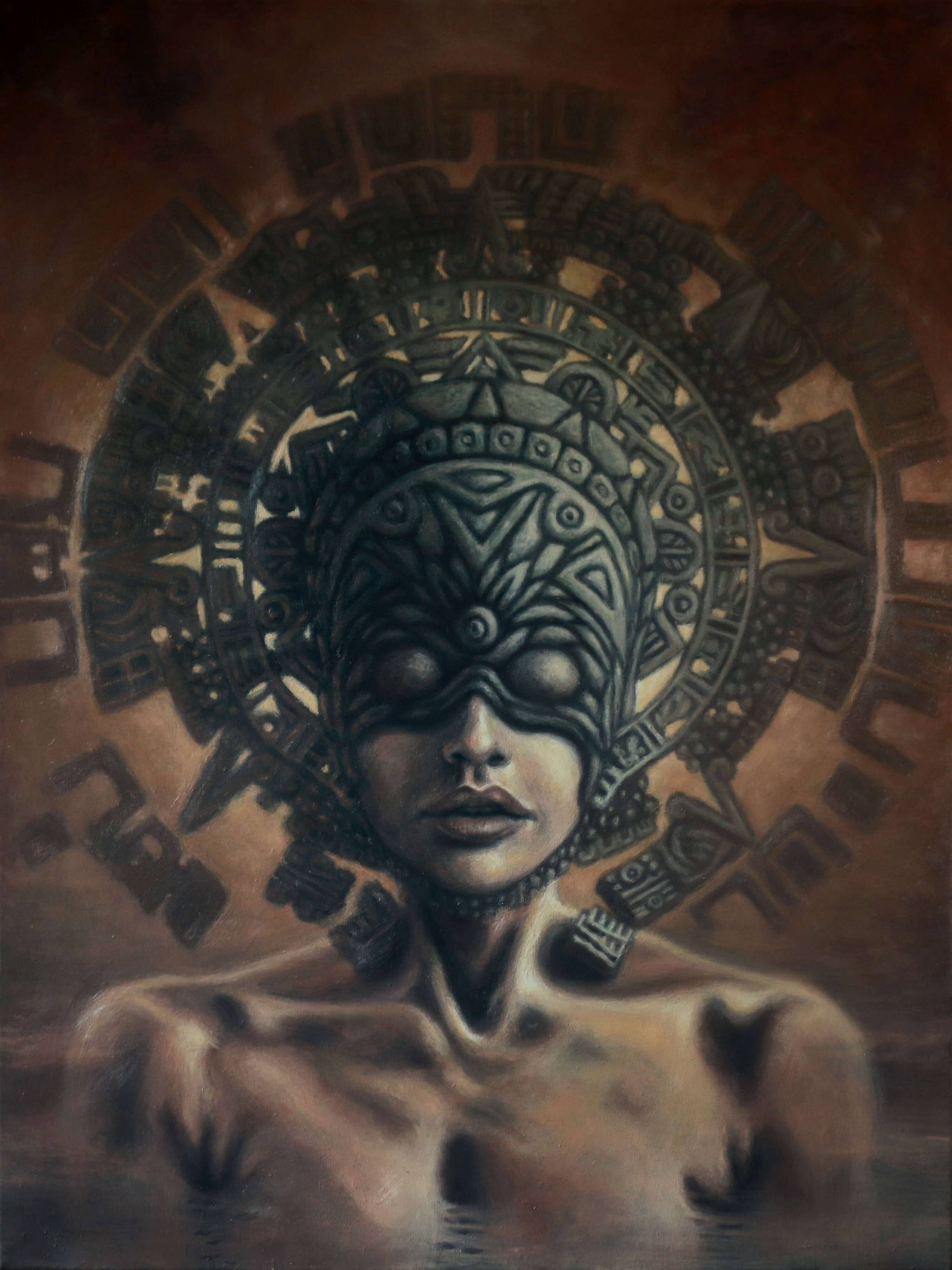 Obraz emanuje tajemniczą i nieco mistyczną atmosferą. Dominuje ciemna paleta barw: głębokie brązy, ciemne zielenie i cienie, które potęgują uczucie niepokoju i głębokiej refleksji. Centralnym punktem jest postać z maską, której twarz wygląda, jakby była wyrzeźbiona z kamienia. W tle widnieje okrągły, skomplikowany wzór przypominający starożytny kalendarz. Styl artysy jest bardzo realistyczny, skupiony na detalach, ale jednocześnie zachowuje on pewną abstrakcyjność przez symboliczne elementy. Nastrój obrazu jest enigmatyczny, jakbyśmy spoglądali na fragment zapomnianej historii świata. Czuć, jak cisza unosi się w powietrzu, a każdy szczegół kryje w sobie głębsze znaczenie. Technika malarska obejmuje precyzyjne pociągnięcia pędzla, które nadają kompozycji trójwymiarowości. Uwagę przykuwa sposób, w jaki światło pada na twarz, podkreślając jej kontury i nadając całości nieco surrealistyczny wydźwięk. Obraz wywołuje silne emocje. Może skłaniać do myślenia o przeszłości, ukrytych tajemnicach czy ludzkiej tożsamości. Kto to jest? - pyta mój siedmioletni brat. Sztuka ta porusza, wywołuje uczucie zagubienia, ale i fascynacji. Jeden z elementów, który można nazwać 'hypnotic', to wzór w tle, który zdaje się obracać w nieskończoność. Wzbudza to w odbiorcy uczucie zagubienia w czasie i przestrzeni, jakbyśmy stali u progu innego świata. To jak okno do wieczności, które otwiera się przed nami, zapraszając do odkrycia tego, co kryje się za zasłoną codzienności.