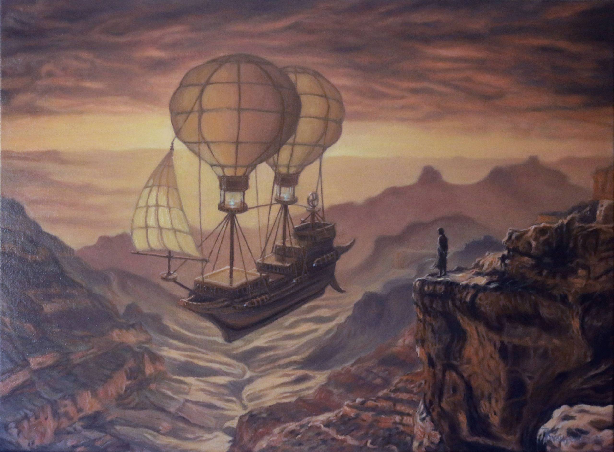 Na obrazie widzimy mistyczny krajobraz o barwach ciepłego zachodu słońca, gdzie dominują odcienie pomarańczu, złotego i miękkiego brązu. Na pierwszym planie, samotny człowiek stoi na krawędzi skalistego urwiska, wpatrując się w majestatyczny, powietrzny statek. Ten niesamowity pojazd, przypominający dawny żaglowiec, unosi się na ogromnych balonach wypełnionych powietrzem. W powietrzu unosi się atmosfera tajemnicy i przygody. Czujesz, jakbyś mógł tam być, czując wiatr we włosach. Artysta zastosował technikę oleju na płótnie, z delikatnymi przejściami kolorów i realistycznymi detalami. Kolory wydają się prawie magiczne, jakbyś patrzył na spełnienie marzeń o lataniu. Dzieło emanuje spokojem i dziwnym poczuciem wolności. „Chciałbym polecieć takim statkiem” – powiedziałby siedmiolatek. Patrząc na ten obraz, możesz poczuć falę optymizmu i ciekawości. Otwiera się przed tobą świat niekończących się możliwości. To prawdziwy "dreamlike" sen w kolorach. Coś w tym obrazie przyciąga, oddziałując na wyobraźnię i serce. Zastanawiam się, jakie historie kryją się za tym tajemniczym statkiem i gdzie może on nas unieść. Cudo pejzażu i wyobraźni.