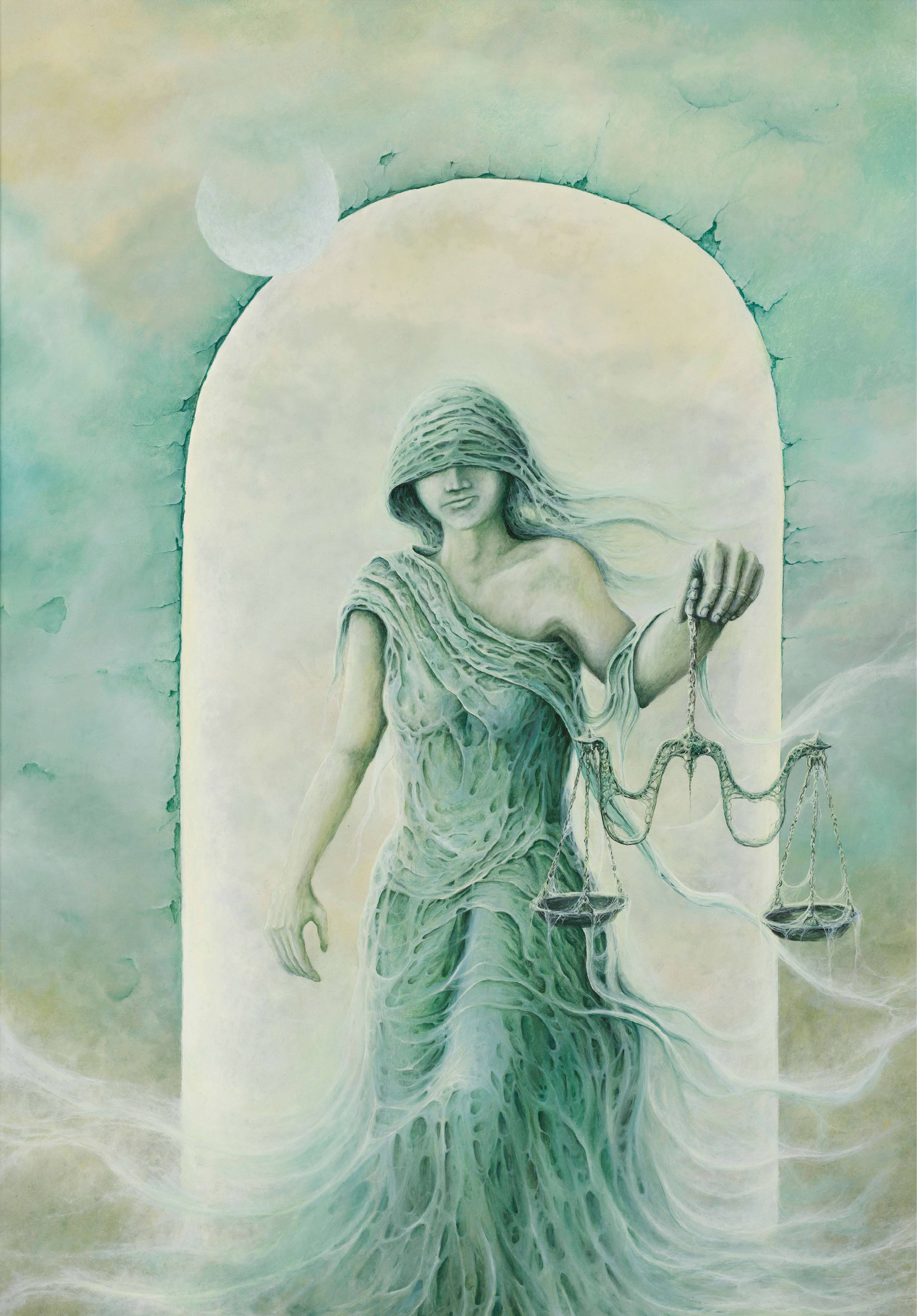 Na obrazie dominuje paleta delikatnych, mglistych zieleni i błękitów, tworzących niejako senne tło. Sylwetka kobiety w centrum przyciąga wzrok. Jest ona ubrana w zwiewną szatę, która zdaje się być spleciona z mgły. Jednocześnie unosi się i opada, tworząc dynamiczny efekt. Kompozycja skupia się na postaci, podkreślając jej tajemniczą aurę. Atmosfera obrazu jest pełna spokoju i refleksji, ale też jakiejś nieokreślonej niepewności. Coś jak echo magicznego momentu, zanim nagle się rozpłynie. Artysta użył miękkich pociągnięć pędzla, nadając całości subtelność i delikatność. Patrząc na te zbalansowane szale, można poczuć jakby czas stanął w miejscu. Dla dziecka mogłoby to wyglądać jak obrazek z bajki. "To pani, co ma wagi i dużo długiego sukienka!" - powiedziałby maluch. Interpretacja tego dzieła może wywoływać w nas różne emocje, od spokoju po niepokój. Zastanawiamy się, co symbolizują zamknięte oczy tej postaci? Czy to invisibility przed sądem życia? To wyjątkowe dzieło skłania do chwil zatrzymania się i refleksji nad sprawiedliwością oraz naszą rolą w jej poszukiwaniach. To taki "moment of truth" zamknięty w ramie.