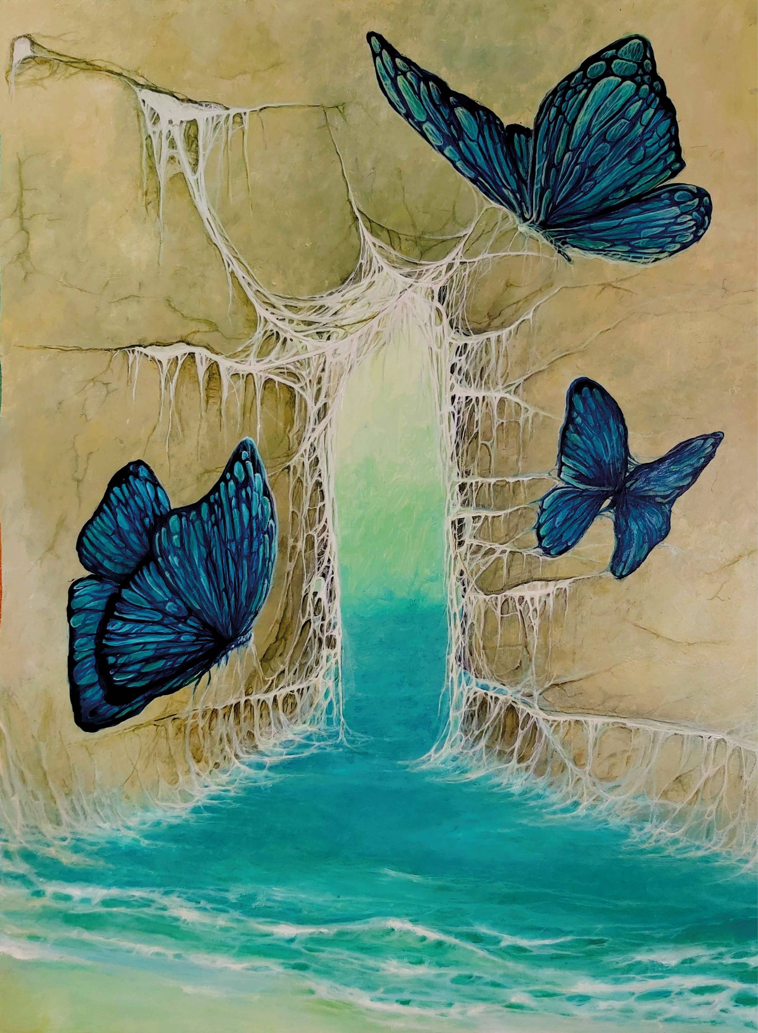 Obraz przenosi nas do magicznego świata, gdzie dominuje kolor niebieski i beżowy, tworząc harmonijną, niemal eteryczną kompozycję. Na pierwszym planie wiszą trzy motyle o lśniących, głęboko niebieskich skrzydłach. Ich obecność dodaje życiu całemu dziełu, nadając mu dynamiki oraz tajemnicy. Tło emanuje spokojem, przedstawiając złociste ściany przypominające piaski pustyni, z których wyłaniają się białe, delikatne, pajęczynowe struktury. W samym centrum obraz wzrok przyciąga świetliste przejście, jakby prowadzące do innego wymiaru. Nasze serca zaczynają bić szybciej, gdy wpatrujemy się w tę hipnotyzującą scenę. Czy to wejście do innego świata? Motyle, unoszące się lekko w powietrzu, przywodzą na myśl wolność i nadzieję. Jakby dodając magic touch. Artysta subtelnie łączy realizm z surrealizmem, używając delikatnych pociągnięć pędzla i miękkich przejść kolorystycznych. Technika ta tworzy iluzję ruchu i transformacji, a jednocześnie daje poczucie wieczności. Patrzę na to i myślę: „Fajnie było być motylem”. Obraz może wzbudzić w nas refleksje nad zmianą i możliwością odrodzenia. Czuje się w nim tęsknotę za nieznanym i równocześnie bezpieczeństwo oferowane przez znane elementy kompozycji. Dla mnie, niesie przesłanie o nadziei i przemianie, otwierając drzwi do nowych przeżyć i poszukiwań.