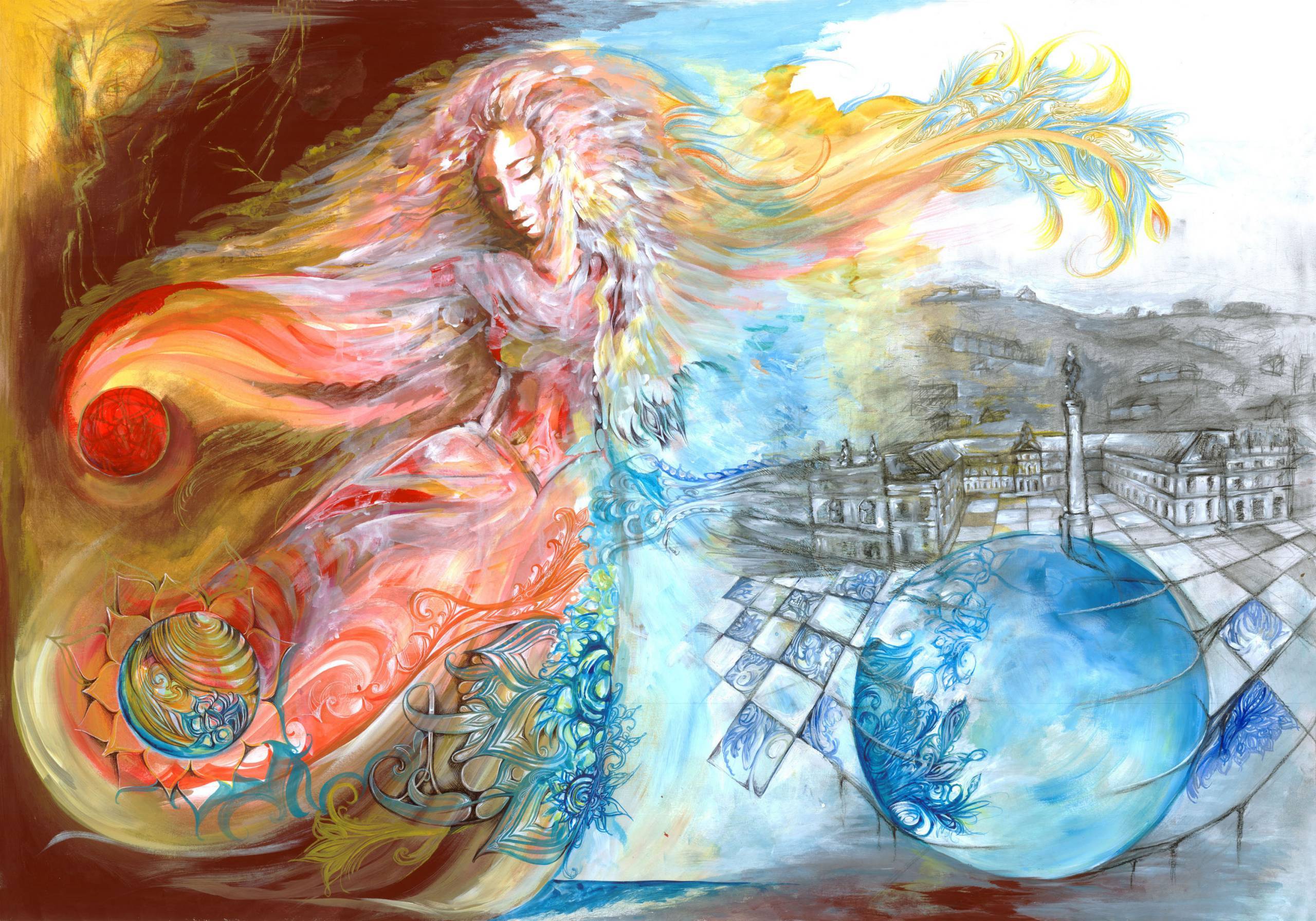 Obraz emanuje złożonym połączeniem kolorów, gdzie ciepłe odcienie czerwieni i pomarańczu płynnie łączą się z chłodnymi błękitami. Centralną postacią jest eteryczna kobieta o długich, rozwianych włosach, które wydają się być częścią wiatru przewiewającego przez płótno. Kompozycja zdaje się być w ciągłym ruchu, jakby harmonizowała ze zmieniającym się niebem i krajobrazem. Jest jak opowieść, która obtacza cię miękkim szalem emocji. Widzę ten obraz i czuję spokój, ale też pewną nieodgadnioną tajemnicę. Artysta użył technik mieszanych, łącząc delikatne akwarele z mocniejszymi liniami i teksturami, co nadaje dziełu trójwymiarowości. Wydaje się, że obraz wywołuje w widzu refleksję nad dualnością życia, jak to, że może być zarówno delikatne, jak i pełne energii. W lewym dolnym rogu dostrzec można symbolikę jakiejś struktury kosmicznej, co budzi we mnie poczucie pokory wobec wszechświata. It's just magical. Jak w bajce, umiesz sobie wyobrazić? Dzieciak powiedziałby: ta pani to wróżka! Atmosfera jest pełna marzeń, mieszanka snu i jawy. Płynność przejść kolorów i form sprawia, że obraz żyje i tętni emocjami, co daje widzowi możliwość zanurzenia się w własnych myślach i emocjach.