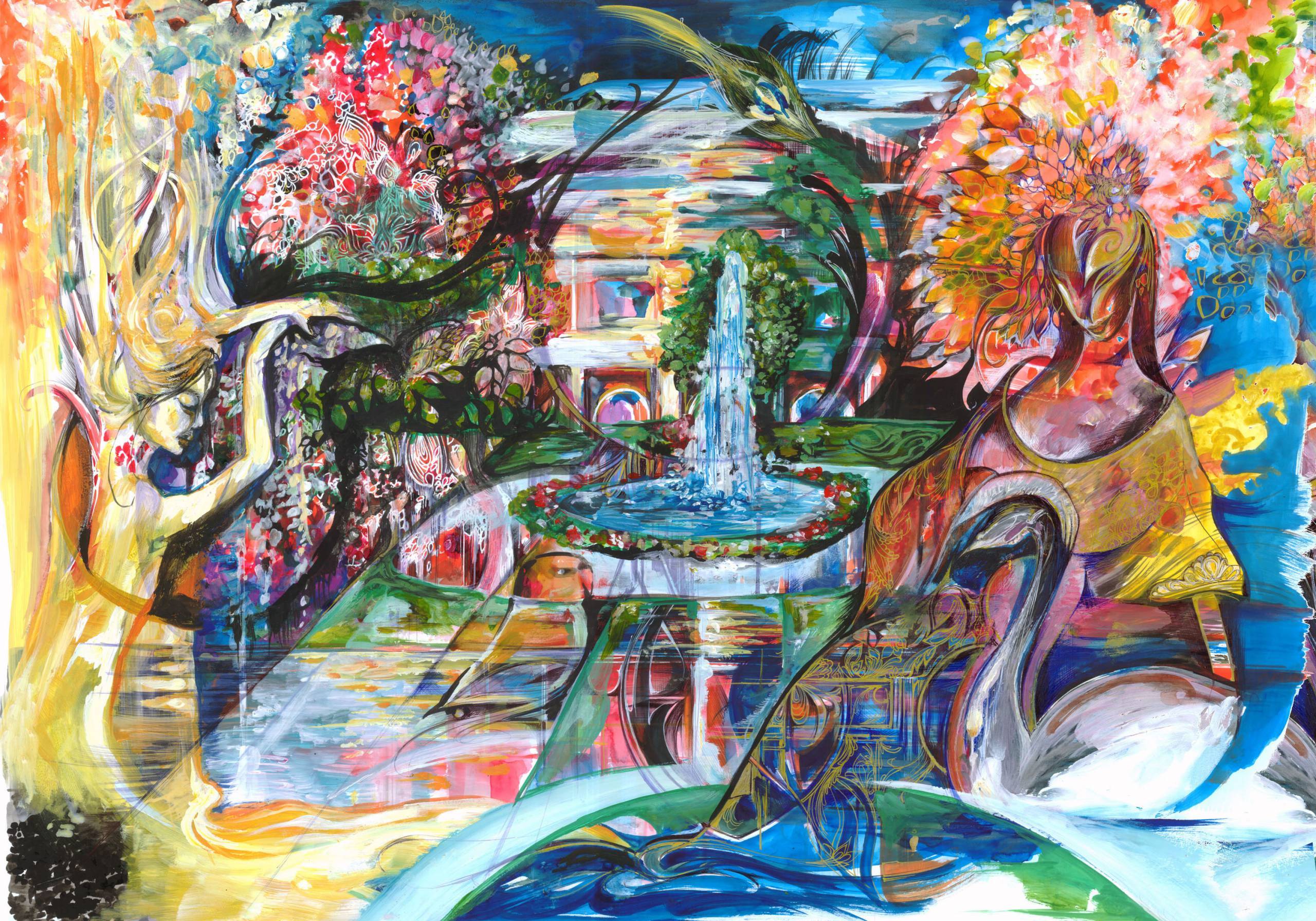 Ten obraz to eksplozja kolorów i kształtów, jakby wszystkie pory roku spotkały się w jednym miejscu. Dominują tu jaskrawe odcienie niebieskiego, zieleni i różu, które wirują i przenikają się nawzajem. Centralny punkt obrazu to fontanna, z której woda tryska w niebo, otoczona bujną roślinnością i kwiatami. Dwóch tajemniczych postaci o długich włosach i zawiłych szatach wydaje się ożywiać tę scenę, dodając jej dynamiki. Atmosfera jest jak z bajki, pełna magii i tajemnicy. Styl artystyczny wskazuje na surrealizm, gdzie rzeczywistość miesza się ze światem marzeń. Obraz wywołuje poczucie spokoju, ale także lekkiego niepokoju, jakby za każdą rośliną kryła się jakaś historia. Techniki użyte przez artystę, takie jak dynamiczne pociągnięcia pędzla i mieszanie barw, tworzą efekt "dreamlike", który przyciąga wzrok i hipnotyzuje. Patrząc na to dzieło, można poczuć się jak w magicznym ogrodzie, pełnym tajemnic. A ja się czuję, jakbym mógł tam wejść! To takie wow.