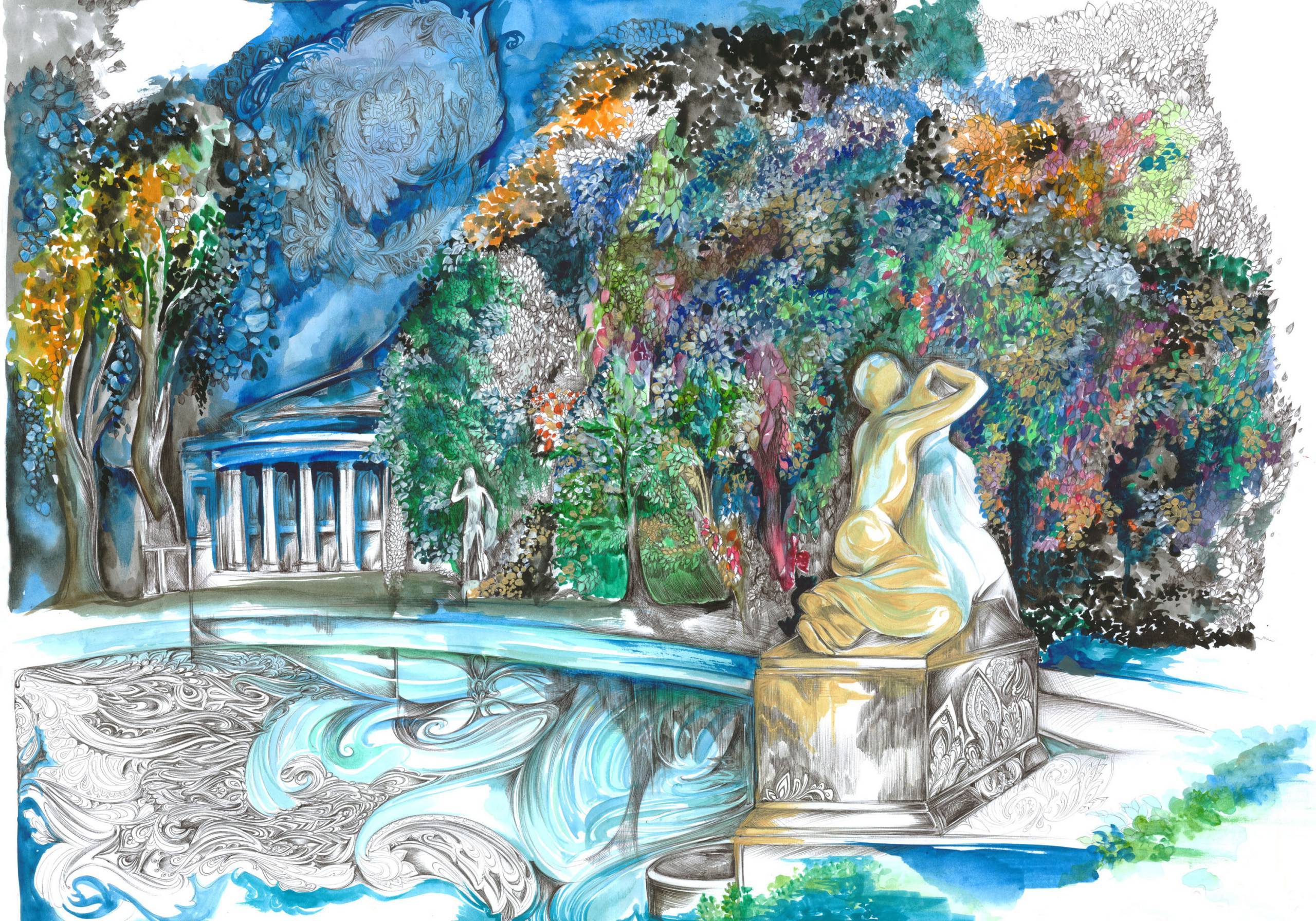 Na obrazie dominują barwy błękitu i zieleni, tworząc harmonię, która hipnotyzuje odbiorcę. W centrum znajduje się jasna rzeźba, kontrastująca z kolorowym, bujnym ogrodem. Liście drzew są pełne różnorodnych odcieni, od zielenie, przez fiolety, aż po pomarańczowe refleksy. Kompozycja wydaje się być dynamiczna i pełna ruchu, jakby wiatr delikatnie kołysał koronami drzew. Nastrój obrazu jest tajemniczy, a zarazem kojący, jakby zapraszał do zanurzenia się w magiczny świat sztuki. Styl dzieła przypomina akwarele z nutką impresjonizmu, gdzie miękkie pociągnięcia pędzla tworzą łagodną fakturę. Artysta użył techniki, by uchwycić esencję natury i architektury, łącząc je w harmonijną całość. Mogłoby się wydawać, że czas płynie tutaj wolniej. Super calming, right? Ten obraz sprawia, że czuję się jak w bajce. Dla małego dziecka mogłoby to być miejsce, gdzie mieszka elfy. Patrząc na to dzieło, człowiek zaczyna reflektować nad pięknem świata i przemijaniem czasu. Kolorowe liście przypominają o zmieniających się porach roku, a rzeźba o ludzkiej twórczości. Całość jest jak cudowna melodia, którą chcesz słuchać w nieskończoność.
