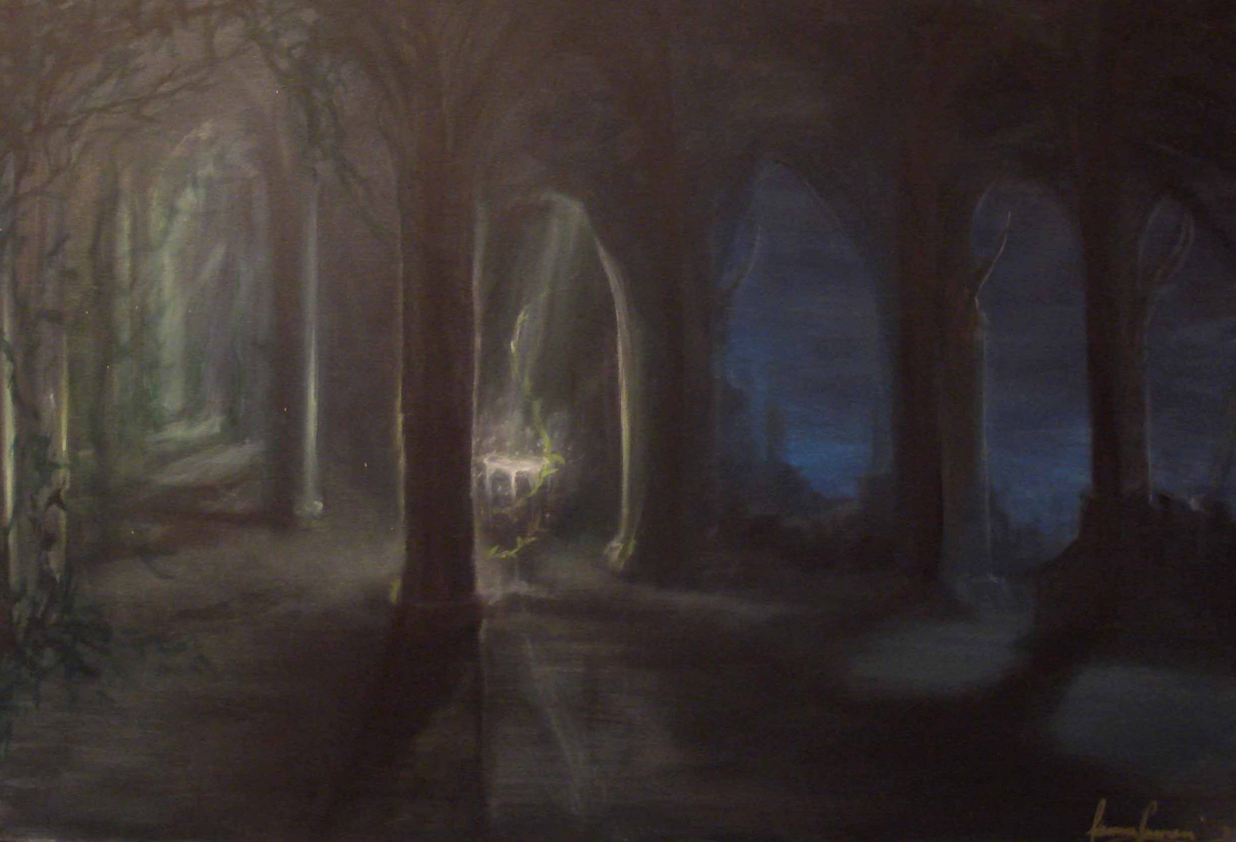 Na tym tajemniczym obrazie dominuje ciemna paleta kolorów, z subtelnymi nutami zieleni i niebieskiego, które rzucają zimne światło na otaczające sceny. Aranżacja kompozycji przywodzi na myśl opowieści z dawnych zamków, pełnych tajemniczych korytarzy i ukrytych zakątków. Artysta zastosował miękkie, rozmyte pociągnięcia pędzla, dzięki czemu dzieło nabiera nieco mglistego, niemalże eterycznego charakteru. Klimat jest wręcz mistyczny, emanujący ciszą i tajemnicą, jakby duchy dawno zapomnianych mieszkańców miały zaraz się pojawić. Wyobraźnia widza nie ma tu granic. Mroczna atmosfera obrazu może wywoływać uczucie niepokoju, ale jednocześnie fascynacji. Coś w rodzaju "ciekawości, co kryje się za rogiem". Techniki artystyczne sugerują wpływy romantyzmu i symbolizmu, a zawarty w nich mrok i głębia mogą przywoływać wrażenia senne, czasem nawet jak z innego świata. Dla dziecka obraz może być jak tajemny las. "To miejsce, gdzie mieszkają wróżki", powiedziałby malec, wpatrując się z fascynacją. Patrząc na ten obraz myślę o wszystkich niewidocznych historiach, które skrywają te mroczne postacie. Czy to magiczna kraina z fantasy tale? Gdyby przekształcić te barwy w dźwięki, byłaby to spokojna, zimowa melodia. Emocje wciągają jak w książce, której nie możesz odłożyć.