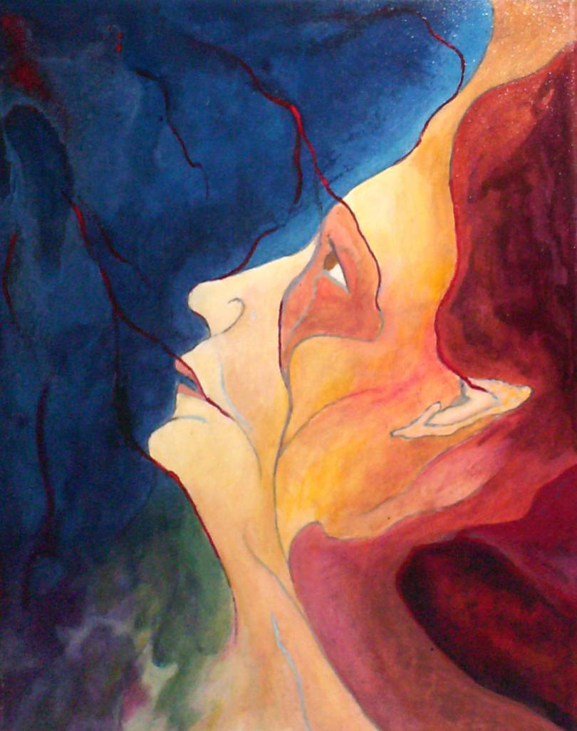 Na obrazie dominuje paleta intensywnych kolorów: głęboki błękit ściera się z ciepłymi odcieniami żółci i czerwieni. Tworzy to niezwykłą kompozycję, gdzie kształty twarzy wydają się wręcz zanurzać w abstrakcyjnych formach. Długie, czarne linie niczym cieniste ścieżki dodają dramatyzmu i wyrazu. Całość emanuje tajemniczą atmosferą, jakby artysta chciał zabrać nas w podróż do wnętrza ludzkiego umysłu. To takie trochę jak dream. Technika przypomina surrealizm, z nutą ekspresjonizmu, co ukazuje umiejętność łączenia świata realnego z wyobraźnią. Obraz może budzić refleksję nad złożonością emocji, a jego oglądającym nasuwać pytanie o tożsamość i introspekcję. "Ciekawe, co tam u tej pani w głowie się kręci?" - mogłoby zapytać dziecko. Patrząc na to dzieło, czuję pewną melancholię, ale także fascynację. Artysta w subtelny sposób łączy chaos z harmonią, co sprawia, że trudno oderwać wzrok.