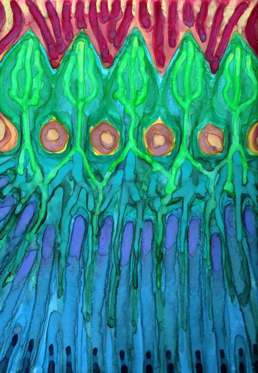 Obraz pełen intensywnych, żywych kolorów przyciąga wzrok od pierwszego spojrzenia. Dominuje zieleń i błękit, które w górnej części przenikają się z ciepłymi odcieniami czerwieni i fioletu. Kompozycja przypomina falujące, organiczne kształty, które można interpretować na wiele sposobów; może to być abstrakcyjny krajobraz, a może coś z kosmosu? Atmosfera jest dynamiczna, niemalże pulsująca, co sprawia, że obraz wydaje się żyć własnym życiem. Wykorzystana technika przypomina akwarele, gdzie przenikanie kolorów daje efekt fluidalności. Artysta z pewnością nie bał się eksperymentów. Emocje? No tu można popłynąć od zachwytu po zdziwienie, bo nie do końca wiadomo, co się tu dzieje. Ciekawe połączenia barw przywołują na myśl pełnię lata albo magiczne "dreams" z innego świata. Jeden z takich obrazów, gdzie bez względu na nastrój, zawsze zauważysz coś nowego. Jest w tym coś z dziecięcej fantazji – hej, to wygląda jak tęczowa zjeżdżalnia! A ta eksplozja kolorów wydaje się krzyczeć do widza, przypominając o beztrosce. Moim zdaniem, to obraz, który zasługuje na moment zatrzymania i kontemplacji.
