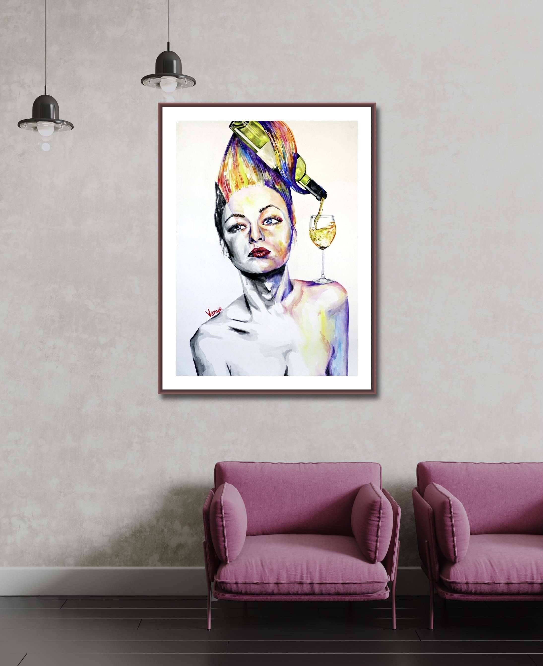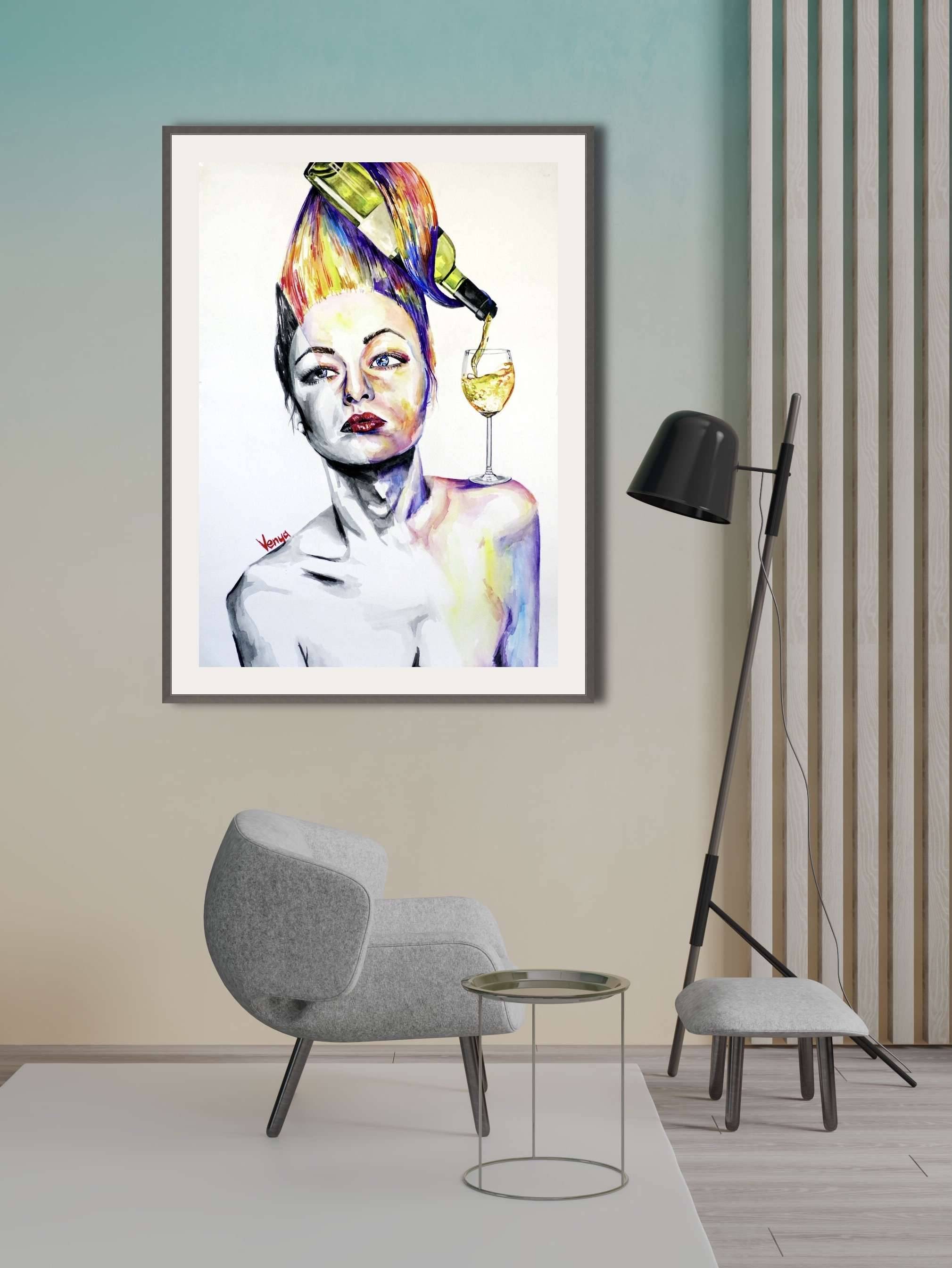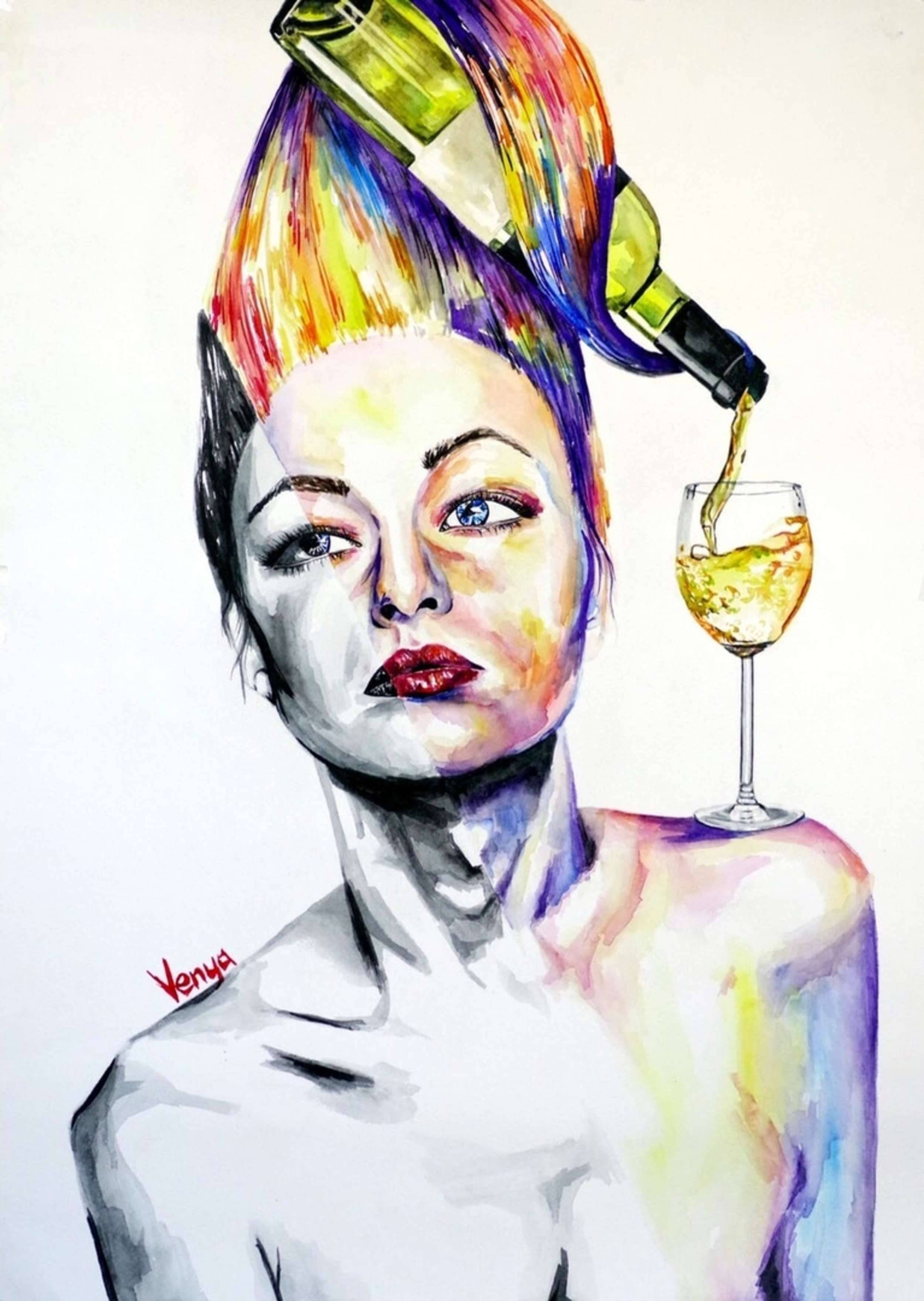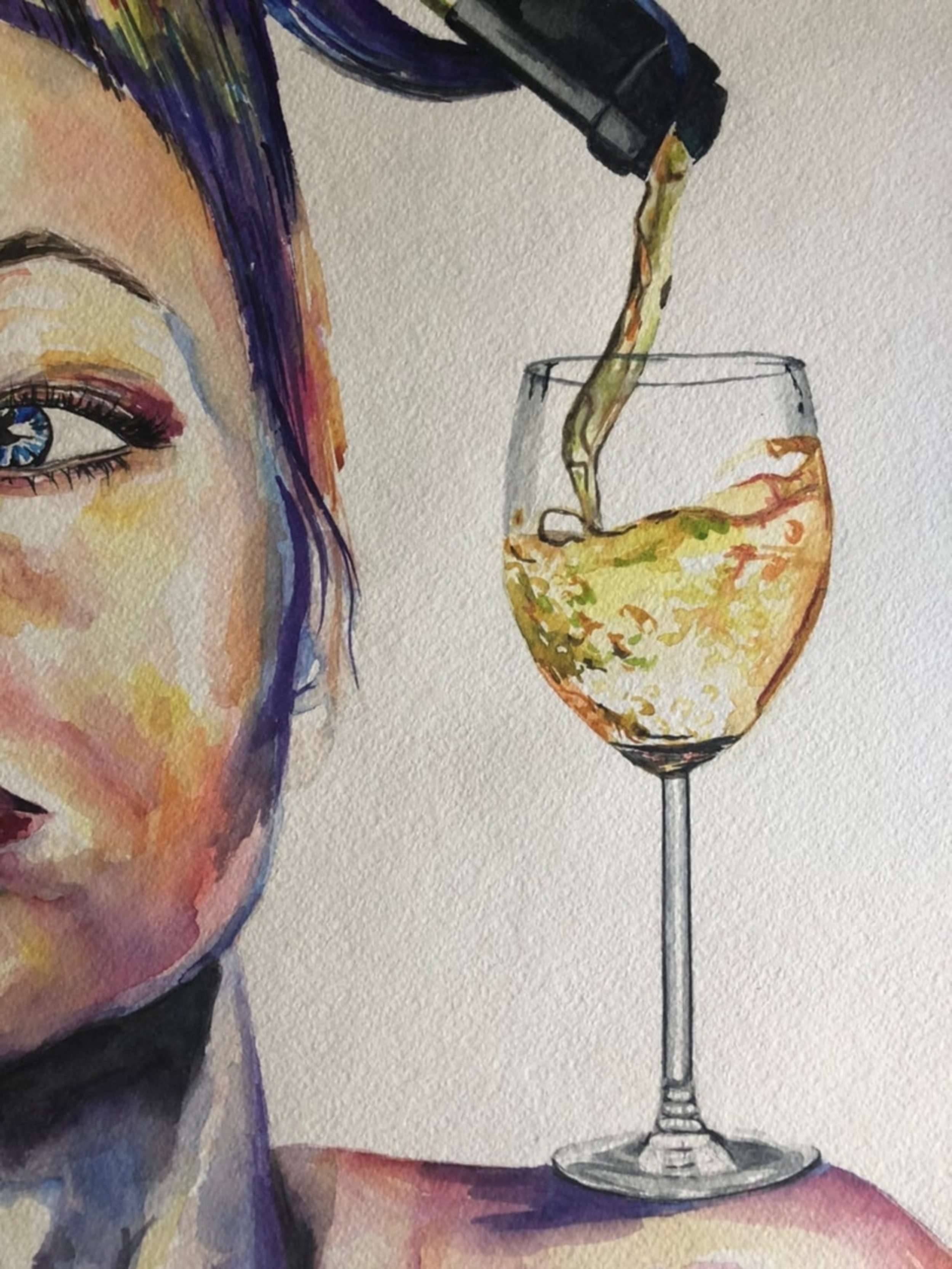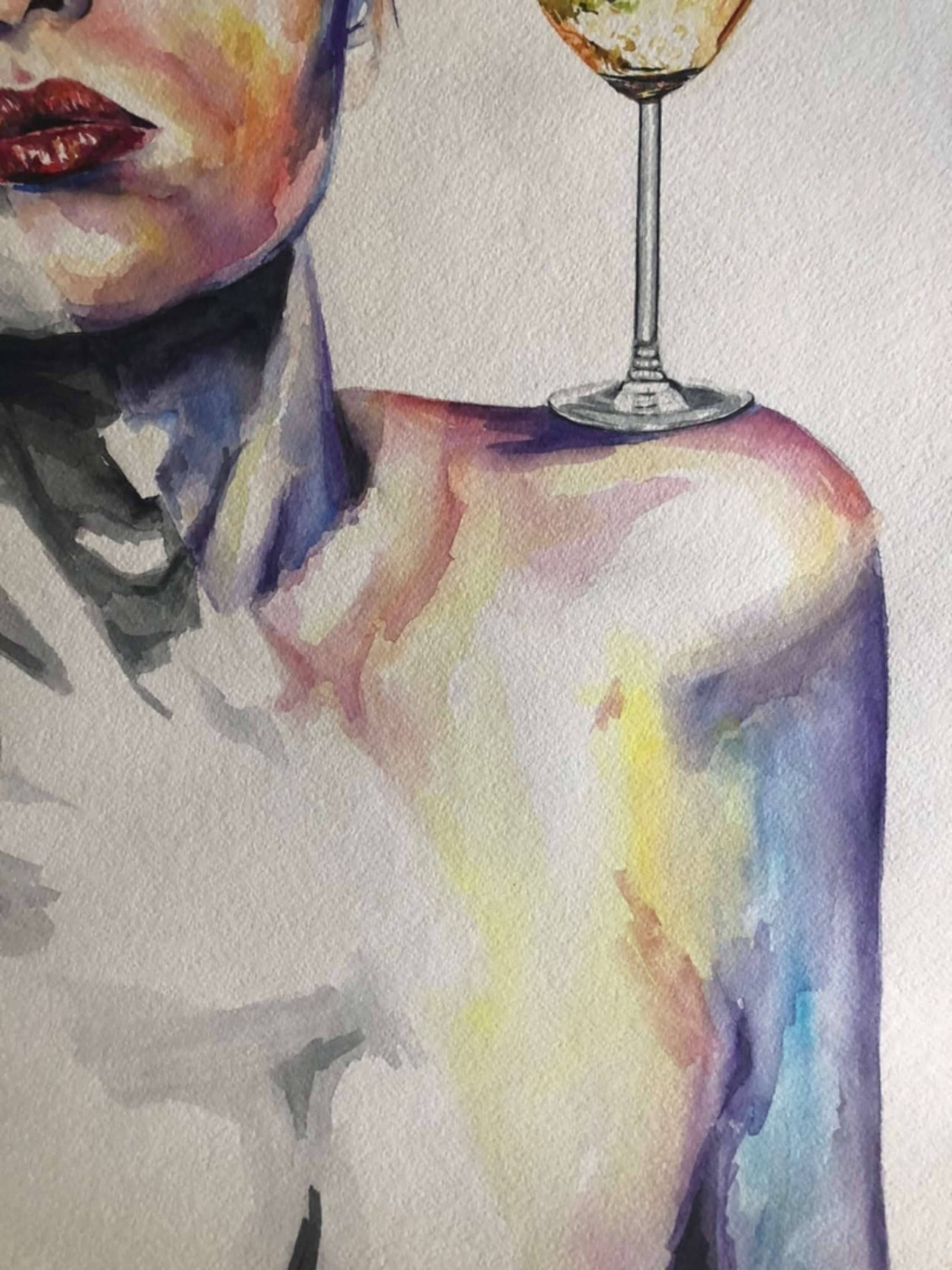 Tytuł to Królowa wina. Technika-malarstwo. Materiał-papier, akwarela. Rozmiar 60 / 80cm. Rok powstania 2017. Opisy-zdjęcie z mojej kolekcji damskiej. Jest ich tylko 5 i wszystkie są bardzo różne. Chciałam przekazać charakter indywidualnych kobiet. To zdjęcie opowiada o kobiecie, która jest nieco smutna, ale kieliszek dobrego wina czyni ją szczęśliwą. Zawsze jest wyjście - wystarczy je znaleźć.