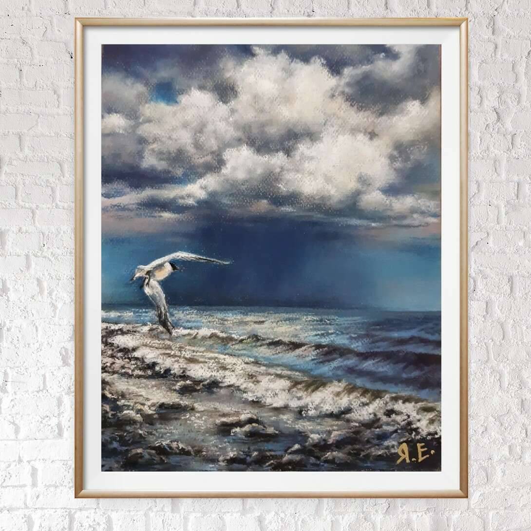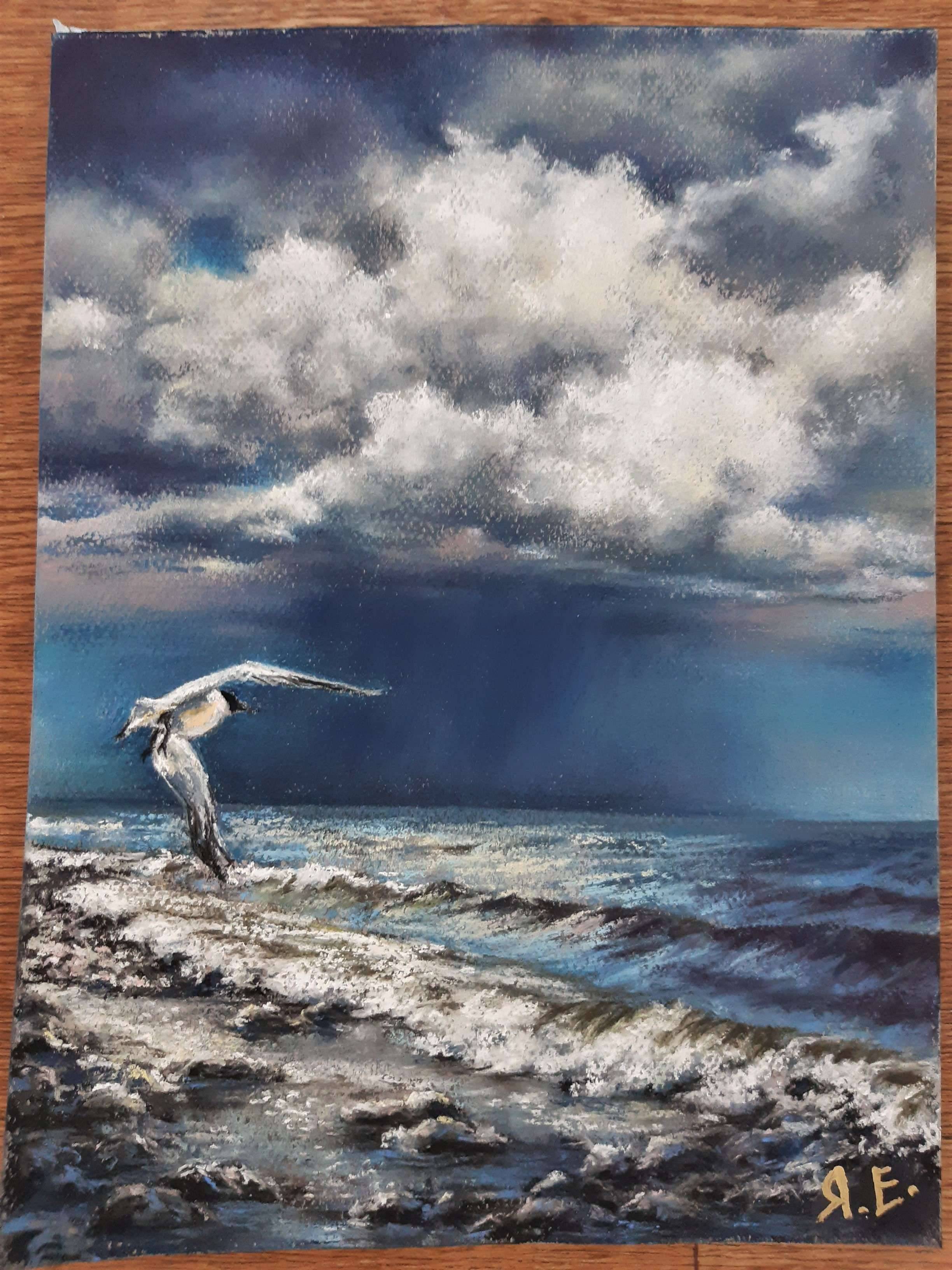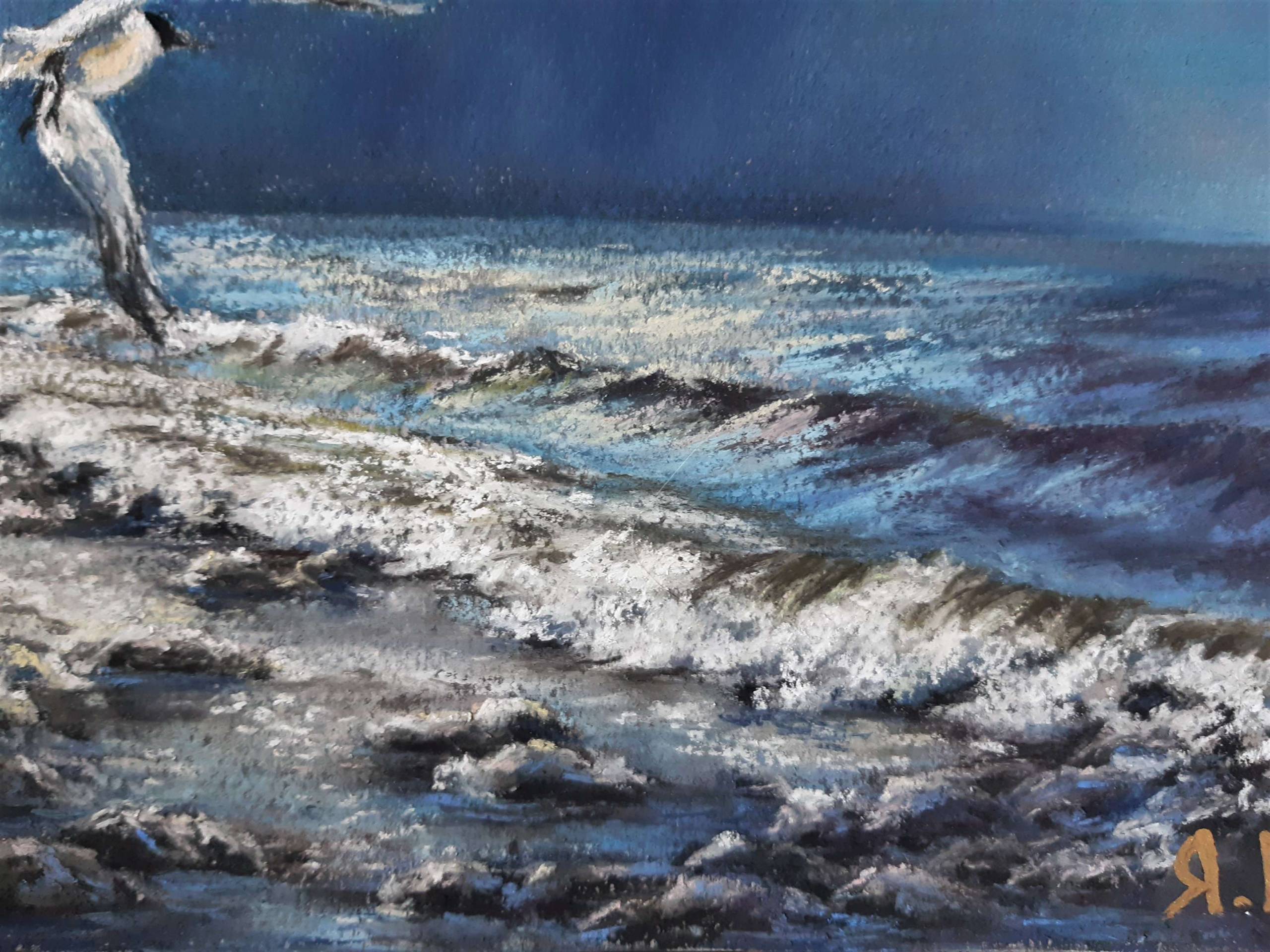 Yana Yeremenko - "Moment before" seascape with a seagull pastel drawing