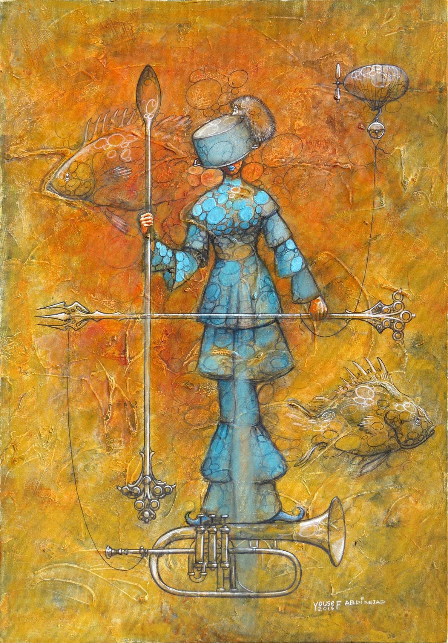 Obraz emanuje niezwykłą aurą surrealistycznego świata, w którym dominują ciepłe odcienie żółci i pomarańczy z kontrastowymi akcentami błękitu. Postać na środku jest ubrana w niebieski strój pokryty okręgami, co tworzy wrażenie bańki unoszącej się w kolorze. Jej hełm ozdobiony jest futrzanym paskiem, co nadaje całości kapryśny charakter. Trzyma w dłoniach przedmiot przypominający trójząb, który lawiruje przez płótno jakby zawieszony w czasie i przestrzeni. W tle unoszą się dziwne kształty ryb, które zdają się nieco niedopasowane, jakby wycięte z innej rzeczywistości. Look, to ujęcie wywołuje poczucie zadumy i delikatnej niepewności. Technika, z jakiej korzysta artysta, łączy w sobie elementy faktury z płynnymi liniami, co daje efekt miękkości i dynamiki jednocześnie. Może na pierwszy rzut oka wygląda trochę chaotycznie, ale ma w sobie coś magicznego. To dzieło zaprasza do refleksji, do zastanowienia nad własnym miejscem w świecie. Mamo, tam jest wielka ryba i fajna trąbka! Może zadziałać jak portal do krainy fantazji, gdzie ograniczenia ustępują miejsca nieskrępowanej wyobraźni.