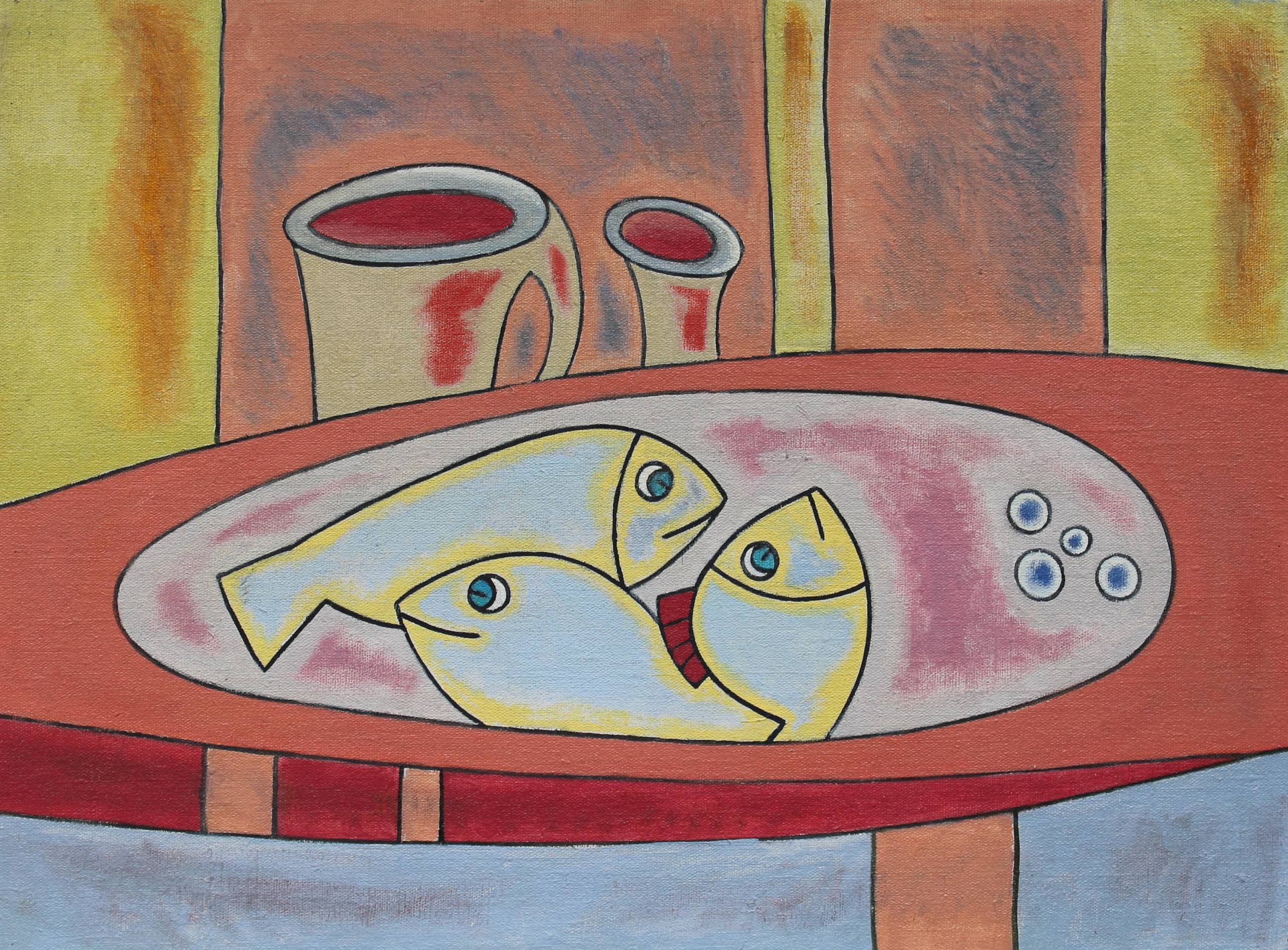Obraz emanuje niesamowitym urokiem dzięki odważnym odcieniom żółtego i czerwonego. Centrum kompozycji to owalny talerz z dwiema rybami, które zdają się rozmawiać, a ich oczka patrzą na nas z lekkim zawadiackim uśmiechem. Tło to mieszanka ciepłych kolorów, które tworzą spokojną, a jednocześnie nieco surrealistyczną atmosferę. Wygląda to jak sen, gdzie kuchnia zamienia się w magiczne miejsce pełne niezwykłych postaci. Artysta zastosował styl zbliżony do kubizmu, z wyraźnie zaznaczonymi liniami i płaskimi plamami barw. Mógł użyć pędzla, ale kto wie, może też palców, aby nadać dziełu taki wyjątkowy klimat. Techniki mieszają się tu z emocjonalnym przekazem, sprawiając, że obraz staje się "alive" w oczach widza. Kiedy na to patrzę, czuję dziwne połączenie spokoju i delikatnego niepokoju. Jakby ryby miały zaraz przemówić i opowiedzieć swoją historię. Możliwe, że to dzieło przywołuje wspomnienia wieczorów spędzonych w kuchni, gdzie każdy przedmiot miał swoją własną tajemnicę. Zastanawiam się, co te ryby by powiedziały, gdyby naprawdę mogły mówić! To trochę jak bajka, którą sam chciałbym sobie opowiedzieć przed snem.