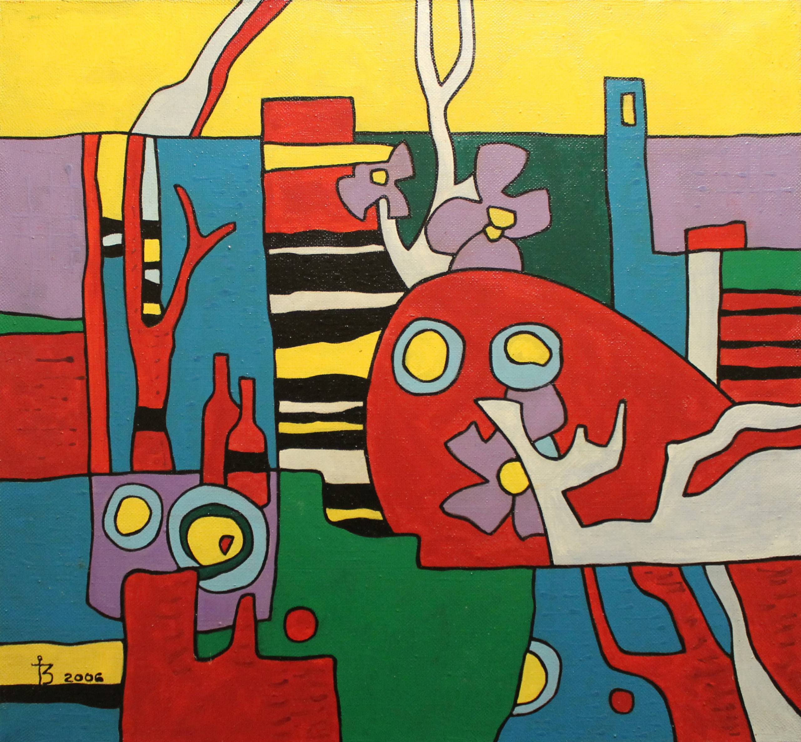 Obraz jest jak eksplozja kolorów, które ścigają się po płótnie. Żółty, czerwony, zielony – wszystko to wiruje i tańczy. Patrząc na dzieło, można się poczuć jak w kalejdoskopie pełnym abstrakcyjnych kształtów. Linie są odważne, raz proste, raz krzywe, i zdają się opowiadać historię bez słów. Dominują zgeometryzowane formy, które przypominają fragmenty miasta lub jakiejś tajemniczej machinie. Atmosfera jest żywa, wręcz pulsująca. Wyczuwalna jest energia, która emanuje z obrazu. To mieszanka ordered chaos, gdzie oko nie może się zatrzymać w jednym miejscu. Artysta użył techniki malarstwa akrylowego, podkreślając intensywność barw. Całość utrzymana jest w stylu kubistycznym, może nawet surrealistycznym. Obraz wzbudza ciekawość, chęć odgadnięcia, co kryje się za tymi plamami koloru. Emocje? Oj, dużo ich. Może pojawić się zachwyt, ale i zmieszanie. Dla kogoś to będzie może dziecięca zabawa klockami, dla innego zawiła kompozycja, która wymaga dłuższej zadumy. Wygląda jak coś, co mógłby naszkicować ktoś z wybujałą wyobraźnią – "To wygląda jak król lew na drzewie!" – mogłoby powiedzieć dziecko. Jest w tym obrazie coś, co sprawia, że człowiek chce przystanąć i dać się pochłonąć mocnym plamom. Najbardziej fascynuje mnie, jak wyraźnie widać indywidualizm artysty, jego unikalne spojrzenie na świat. Pozostaje to, by wpatrywać się i odkrywać nowe szczegóły. To dzieło, które nie ma końca.
