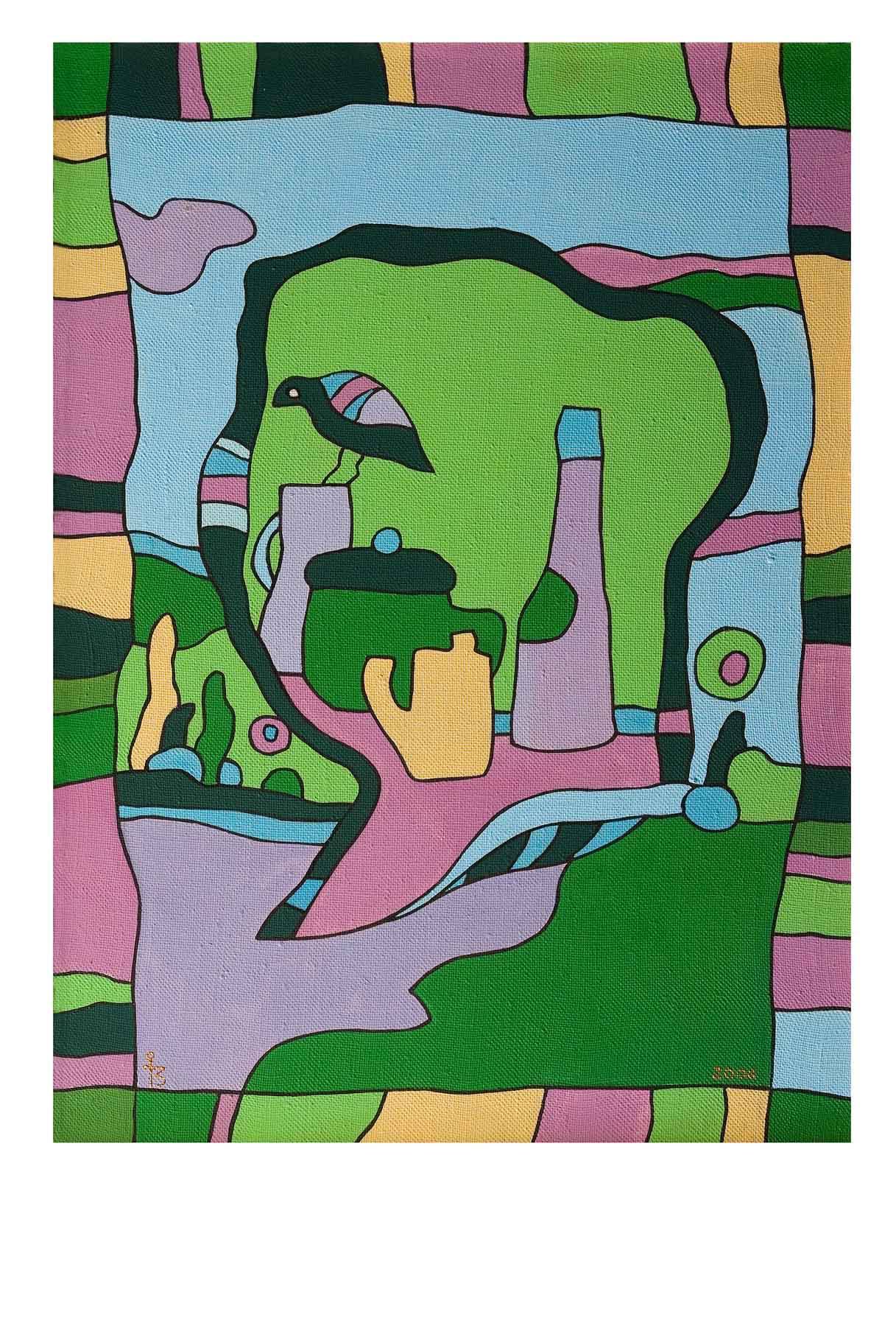 Na obrazie dominuje gra wesołych kolorów: zieleni, różu, niebieskiego i odrobiny żółci. Linie są wyraźne i odważne, niczym czarne kreski w rysunku malucha, który właśnie odkrył flamaster. Kompozycja wydaje się chaotyczna, ale po chwili widać harmonię. Centralnie usytuowana butelka i dzbanek przypomina kubistyczne martwe natury, a wśród nich siedzi ptak. To trochę jak kolorowy sen, w którym nagle wszystko nabiera sensu. Atmosfera jest spokojna, ale intrygująca. Czujesz jakby obraz kusił, by zajrzeć za kolorowe paski, poza to, co widoczne na pierwszy rzut oka. W obrazie kryje się humor, może nawet nuta absurdu. Styl artystyczny przypomina kubizm, ale z bardziej miękkim podejściem do formy. Kolory nie krzyczą, raczej śmieją się do widza. Emocje, jakie wywołuje, mogą być różnorodne. On sprawia, że w moim sercu robi się cieplej, bo przypomina mi dziecinne zabawy. Look! Ten obraz to śmiech w kolorach. Dla mnie to taka wesoła impresja z wiosennym powiewem, którą chciałoby się zabrać ze sobą na spacer.