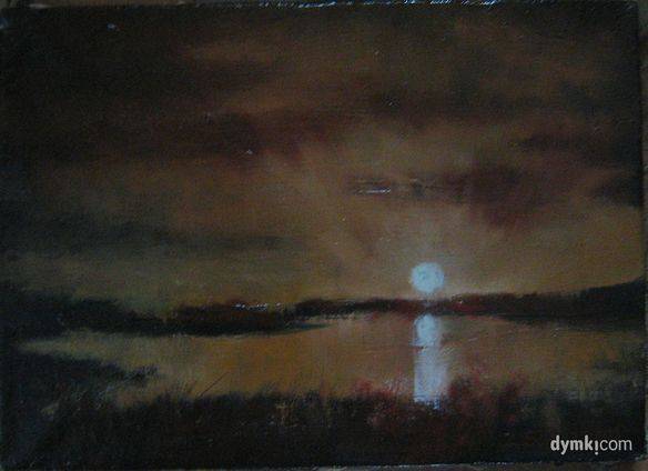 Obraz ukazuje tajemniczy krajobraz nocny, którego tłem jest gęste, niemal nieprzeniknione półmrok. Dominują tu ciemne, głębokie odcienie brązu i czerni, z subtelnymi refleksami bieli rozlewającej się po powierzchni wody. Kompozycja jest prosta, ale jednocześnie hipnotyzująca. Środkowy punkt obrazu stanowi świetlista kula, jakby księżyc, który rzuca jasny blask na spokojną taflę jeziora. Atmosfera jest mocno nostalgiczna, a może nawet nieco melancholijna. Czujesz, jakby czas zwolnił, jakby świat zatrzymał się w oczekiwaniu na coś nieokreślonego. Styl artysty jest swobodny, nieco impresjonistyczny, z mięsistym pociągnięciem pędzla, które dodaje głębi całemu przedstawieniu. Emocje? To coś jak magiczne odczucie spokoju po burzy, jakby ucieczka od codziennych zmartwień. Może przypomni ci to wakacje nad jeziorem? Widok, który od razu rozjaśnia dzień. "Wow, ale fajnie!" mogłoby powiedzieć dziecko patrząc na to piękno. Ten obraz może wywoływać wachlarz interpretacji. Dla jednych to scena z półsnu, dla innych symbol wewnętrznego spokoju. Wiesz, to ten moment, kiedy czujesz – "serenity," a miękkie barwy otulają cię jak koc w zimny wieczór. Obcując z tym dziełem, łatwo zatracić się w marzeniach.