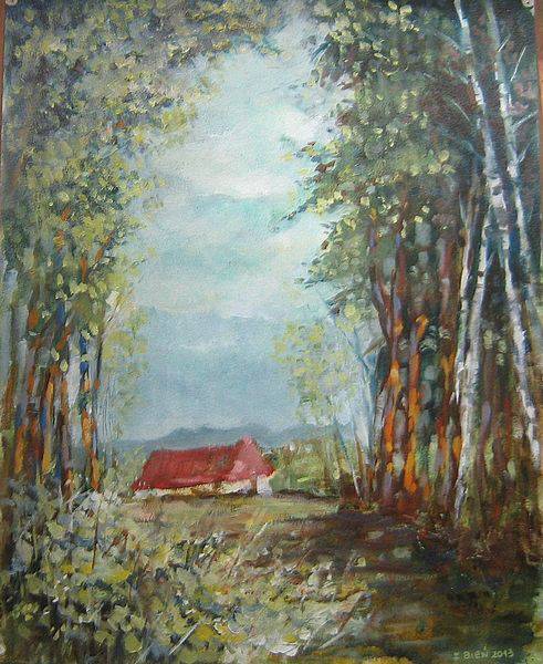 Na obrazie widzimy malowniczą scenę przedstawiającą urokliwy domek położony wśród majestatycznych drzew. Kolory to głównie delikatne odcienie zieleni i błękitu, które kontrastują z ciepłym, czerwonym dachem domku. Kompozycja jest przemyślana, z wyrazistym pierwszym planem, gdzie drzewa tworzą naturalną ramę dla domku w oddali. Scena emanuje spokojem i nostalgią, przypominając beztroskie chwile spędzone na wsi. Światło pada subtelnie, podkreślając detale i dodając obrazu idyllicznego klimatu. Styl artysty nawiązuje do realizmu z elementami impresjonizmu. Widoczne są swobodne pociągnięcia pędzla, nadające obrazowi dynamikę i lekkość. To takie "wow", prawda? Forest wydaje się niemal żywy. Taka technika pozwala poczuć szum liści i zapach świeżej ziemi. Obraz może wywoływać u odbiorcy uczucie tęsknoty za naturą, za prostymi czasami, kiedy życie było mniej skomplikowane. Jest w nim coś, co sprawia, że na chwilę zapominasz o codzienności. Wyobrażam sobie, jak siadam tam pod drzewem i odpoczywam. Tak myśli siedmiolatka byłyby prosta: "Czy tam mieszkają wróżki?" Ten obraz ma w sobie coś magicznego, coś, co sprawia, że chce się do niego wracać. Z każdym spojrzeniem można odkryć coś nowego, a jednak znajomego. I to w nim jest najpiękniejsze.