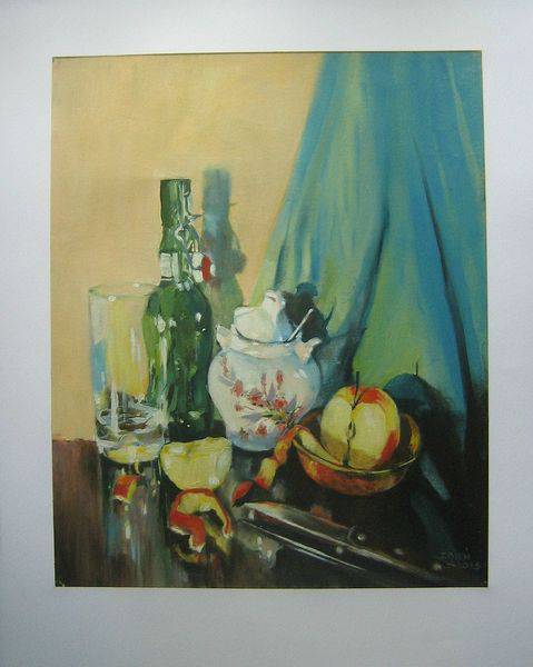 Na obrazie widzimy charakterystyczną martwą naturę, która pobrzmiewa spokojem i nostalgicznością dawnej epoki. W centrum kompozycji wyróżnia się szmaragdowa butelka, która swoją smukłą sylwetką przyciąga wzrok na równi z przezroczystą szklanką obok niej. Delikatne refleksy światła tańczące na ich powierzchniach dodają obrazowi wyjątkowego blasku. Obok, kontrastując z zielenią, stoi filiżanka z misternym, kwiecistym wzorem, przypominająca nam o delikatności dawnych porcelanowych dzieł. Kawałki jabłek leżą na talerzyku, jakby czekały, aż ktoś je zje. A granatowa tkanina w tle dodaje całości głębi, sprawiając, że przedmioty stają się bardziej namacalne. Artyści umiejętnie operując pastelowymi kolorami i subtelnymi cieniami, tworzą aurę tajemnicy. Trochę, jakbyśmy oglądali kuzynkę obrazu z muzeum. Może czujesz to samo? Ten styl przypomina techniki impresjonistyczne, zachowując jednak precyzję klasycznego malarstwa. Odbiorca może mieć różne interpretacje – może zamarzyć o spotkaniu przy stole w małej kawiarence? Dzieło z pewnością wywołuje ciepłe uczucia, wspomnienie domowego spokoju. I jedno dziecko by powiedziało: wow jabłka i kubek! Artysta uchwycił esencję codzienności, tworząc coś bardzo relatable.