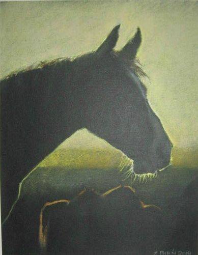 Na obrazie widzimy majestatycznego konia, którego sylwetka wyłania się na tle zachodzącego słońca. Dominują ciepłe odcienie ciemnego brązu i złota, które przenikają się na granicy horyzontu. Prosta, ale niepokojąco piękna kompozycja sprawia, że obraz emanuje spokojem i tajemniczością. Kontury konia są miękkie, jakby rozmyte, dając wrażenie ruchu w nieruchomości. To prawdziwy majstersztyk czułości i delikatności. Styl artystyczny wydaje się być bliski impresjonizmowi, z nutą ekspresji i subtelnego cieniowania. Pędzle artysty, jakby nieco chaotyczne, nadały dziełu dynamizmu i poezji. Ten obraz może wywołać w widzu refleksję nad ucieczką od zgiełku codzienności. "Wow, zobacz jaki piękny koń" – mogłoby wykrzyknąć dziecko widzące to dzieło. Osobiście czuję się jakbym przeniósł się w inny wymiar, gdzie czas płynie wolniej, a zmysły stają się wyostrzone. Obraz jest uroczyście spokojny, a jednocześnie tętniący życiem. It's a breath of fresh air – zupełnie jakby natura przemówiła cichym głosem. Kolory, gra światłem i cieniem działają hipnotycznie, zachęcając do chwili zadumy i wewnętrznego spokoju. To dzieło sztuki, które porusza najgłębsze struny duszy.