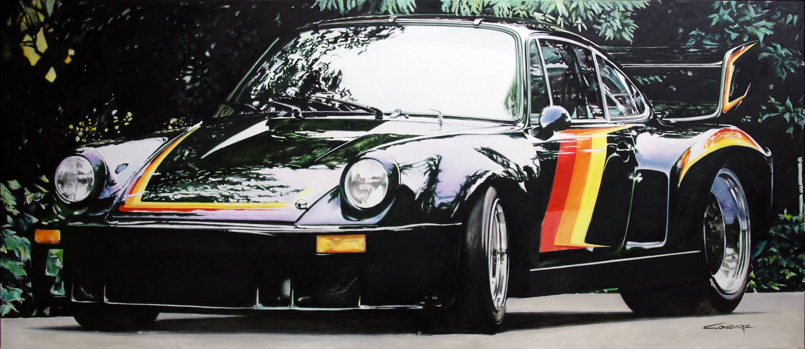 Odpoczynek II. 2011. Olej na płótnie 95x220 cm. Odpoczywający pod drzewami Porsche RSR 3.0 z 1978 roku, specjalnie przystosowany do jazdy drogowej, w oryginalnym wykończeniu i malowaniu firmy Creative Car Craft