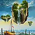 Na obrazie widzimy magiczną scenę pełną niecodziennych elementów, które zdają się wykraczać poza granice rzeczywistości. Dominują tutaj jaskrawe kolory, od głębokiego błękitu nieba po soczystą zieleń drzew osadzonych na unoszących się wyspach. Centralnym punktem jest majestatyczna wyspa z wodospadem, który zdaje się zawisać w powietrzu, a u jej podnóża stoi drewniana łódź, delikatnie kołysząc się na falach. To trochę jak z bajki. Obraz emanuje spokojem, ale też budzi pewne poczucie tajemnicy i zaciekawienia - floating islands to coś, co od razu przyciąga wzrok. Styl jest surrealistyczny, z delikatnymi, ale wyrazistymi pociągnięciami pędzla, które dodają głębi i tekstury. Artysta umiejętnie bawi się percepcją przestrzeni, tworząc nieoczywistą i fantazyjną kompozycję. Patrząc na to dzieło, można poczuć się jak odkrywca nieznanego świata. Dla mnie to takie trochę jak marzenie senne, w którym wszystko jest możliwe. Myślę, że każdy, kto spojrzy na ten obraz, poczuje lekki powiew nieznanego, a może nawet zada sobie pytanie: co by było, gdyby ziemia naprawdę tak wyglądała?