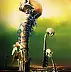 Na obrazie widzimy surrealistyczną wizję czaszek wstępujących na spiralne konstrukcje. Tło obrazu pulsuje intensywnymi odcieniami zieleni i żółci, tworząc aurę tajemniczości i niepokoju. Większa czaszka na pierwszym planie dominuje, opleciona niebieskimi wężami, które kontrastują z jej kościaną barwą. Oto wieża zbudowana z czaszek, które niczym wiecznie trwające pomniki przełamują ziemię. Nastrój obrazu jest ciężki, a zarazem fascynujący, budząc mieszankę grozy i zachwytu. Stylistyka dzieła utrzymana jest w duchu surrealizmu, z silnym naciskiem na wyrafinowane detale i intensywne kolory. Artysta wykorzystuje technikę, która łączy realistyczne detale z onirycznymi kształtami. To jak sen, gdzie wszystko może się zdarzyć. Te obrazy mogą wzbudzać różne emocje, od lęku po refleksję nad kruchością życia. Wywołują skojarzenia z przemijaniem i naturą czasu. Siedmiolatka powiedziałaby, ale to straszne. Może to obraz o świecie, który przeminął? Zastanawiam się nad sensem tych konstrukcji. Jest w tym coś unearthly, a zarazem niepokojąco znajomego. Ten obraz jakby krzyczy do nas o nieuchronnym kole historii.