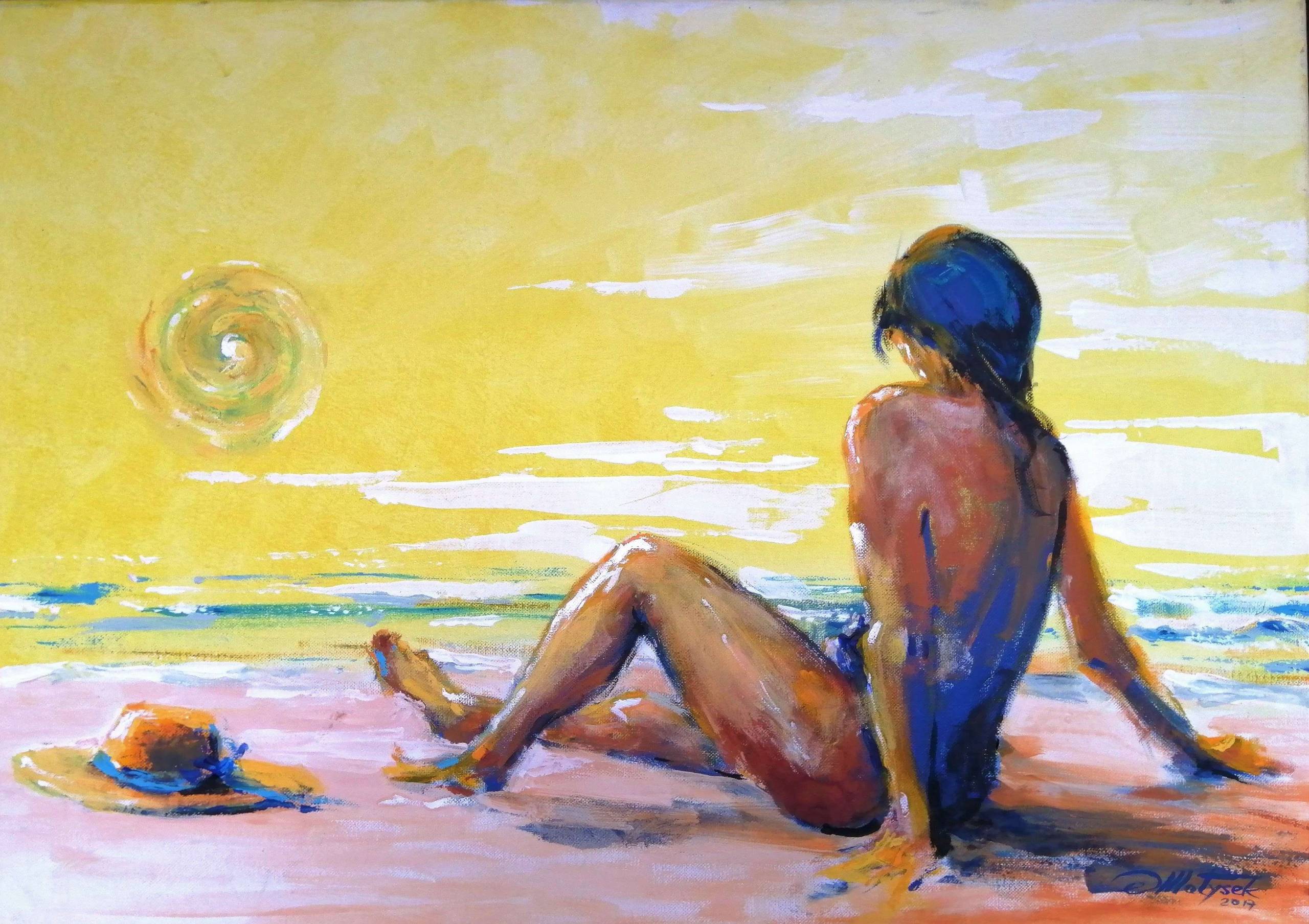 Na obrazie widzimy kobietę siedzącą na plaży, obróconą tyłem do widza, wpatrującą się w horyzont. Jej skóra błyszczy odcieniami bursztynu i różu, a ciemne włosy kontrastują z jasnym, żółtym niebem. Na piasku obok leży kapelusz, dodający scenie odrobinę "chillowego" klimatu wakacji. Słońce malowane jako spiralna kula ciepła hipnotyzuje. Tło jest zdominowane przez pastelowy żółty, tworzący atmosferę spokoju i beztroski. Styl obrazu przypomina impresjonizm. Szybkie, dynamiczne pociągnięcia pędzla nadają obrazowi lekkości i wrażenie ruchu. Kolory są intensywne, choć delikatnie rozmyte, co dodaje dziełu onirycznego charakteru. Czujesz niemal jakbyś tam był, czując na skórze ciepło słońca i słysząc szum fal. "Feels like summer," pomyślisz, tęskniąc za dniami spędzonymi nad morzem. Obraz wywołuje radość i nostalgie za letnimi chwilami. Może skłonić do refleksji nad ulotnością czasu. Dla dziecka: "Widzę panią, co bawi się na plaży i jest super!" Obok spokojna linia horyzontu zdaje się obiecywać niekończący się odpoczynek i ucieczkę od codziennych trosk. To prawdziwe zaproszenie do świata spokoju, gdzie czas płynie inaczej.