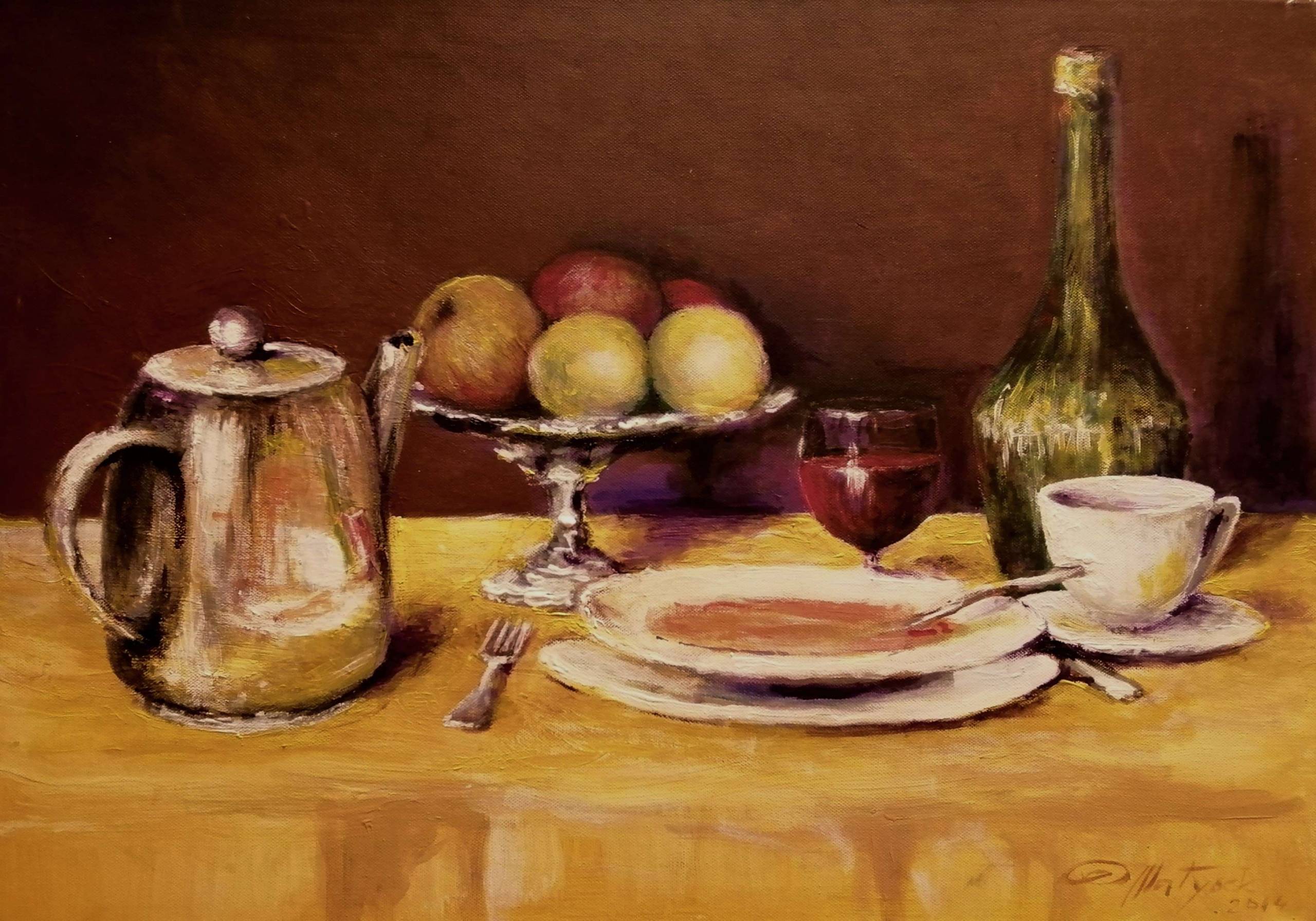 Na obrazie widzimy martwą naturę, której kompozycja jest pełna elegancji i prostoty. Dominują tu ciepłe, przytulne kolory: złote odcienie tła kontrastują z metalicznym połyskiem czajnika i delikatnymi barwami owoców. Jabłka i gruszki dumnie spoczywają na kryształowej paterze, obok której stoi kieliszek wina i filiżanka. Wygląda to trochę jak scenka z bajki, jakby zaraz miała się rozpocząć uczta dla małych elfów. Atmosfera obrazu jest spokojna, sielska, wręcz medytacyjna. Artysta użył techniki olejnej, która pozwoliła mu uchwycić subtelne refleksy światła i fakturę przedmiotów. Każdy pociągnięcie pędzla wydaje się przemyślane, a kolorystyka buduje nastrój nostalgii. Dla mnie, patrząc na to, czuć jakby czas zwolnił. Elementy klasyczne, choć proste, mogą w odbiorcy wywołać poczucie spokoju i docenienie małych rzeczy. A te jabłka pewnie są pyszne! Mógłbyś to powiesić na ścianie i zawsze czuć taki "homey" vibe.