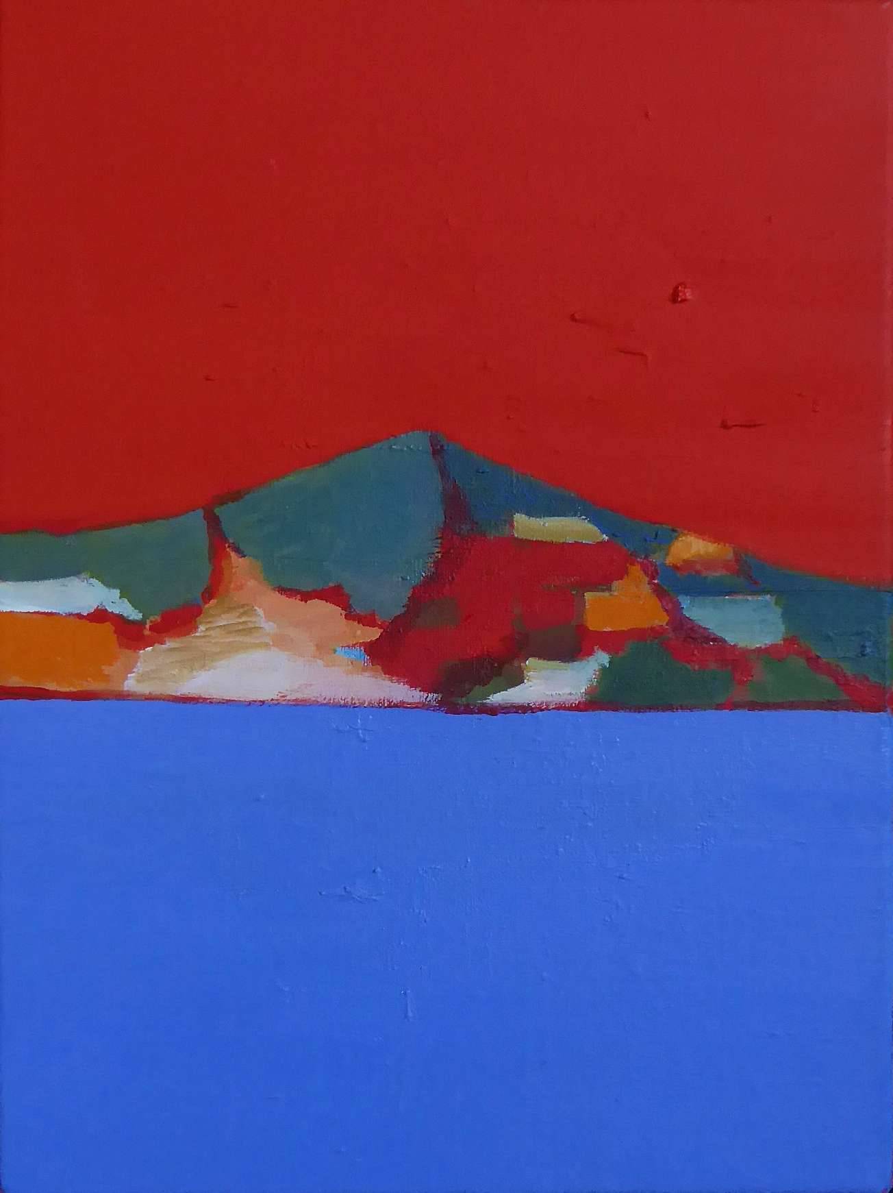 Na obrazie dostrzegamy intensywne kolory, które przyciągają wzrok od pierwszego spojrzenia. Dominują tu czerwienie i błękity, które tworzą wyraźny kontrast i nadają całości niemal elektryzującego charakteru. Kompozycja jest prosta, a jednak intrygująca – centralnie umieszczony kształt przypomina górę lub wyspę, otoczoną pasmami nieco rozmytych barw. Ta abstrakcyjna forma zachęca do refleksji i snucia własnych interpretacji. Obraz emanuje spokojem i jednocześnie pewnym napięciem, jakby za chwilę coś miało się wydarzyć. Styl artysty jest wyrazisty i śmiały. Pociągnięcia pędzlem są zdecydowane, co dodaje dynamiki. Technika, której używa, to prawdopodobnie olej na płótnie, ale kto wie – może akryl? To choice jest interesujące dla obserwatora, który zastanawia się nad procesem twórczym. Obraz może wywoływać uczucie nostalgii lub tęsknoty za miejscem, którego nigdy nie odwiedziliśmy. Może też budzić ciekawość – co takiego artysta chciał nam przekazać? Wyobraźnia odbiorcy pracuje na pełnych obrotach. Wyciągamy własne wnioski, a jednocześnie poddajemy się emocjom, które dzieło wzbudza. Czerwone niebo wydaje się być nieco tajemnicze, podczas gdy błękit może symbolizować spokój wód. "To wygląda jak góra na niebie!", mogłoby powiedzieć dziecko. I ma rację! To prostota dziecięcej obserwacji pozwala nam dostrzec to, co najważniejsze – piękno formy i koloru. Patrząc na ten obraz, można na chwilę zapomnieć o codzienności i zatopić się w snach na jawie.