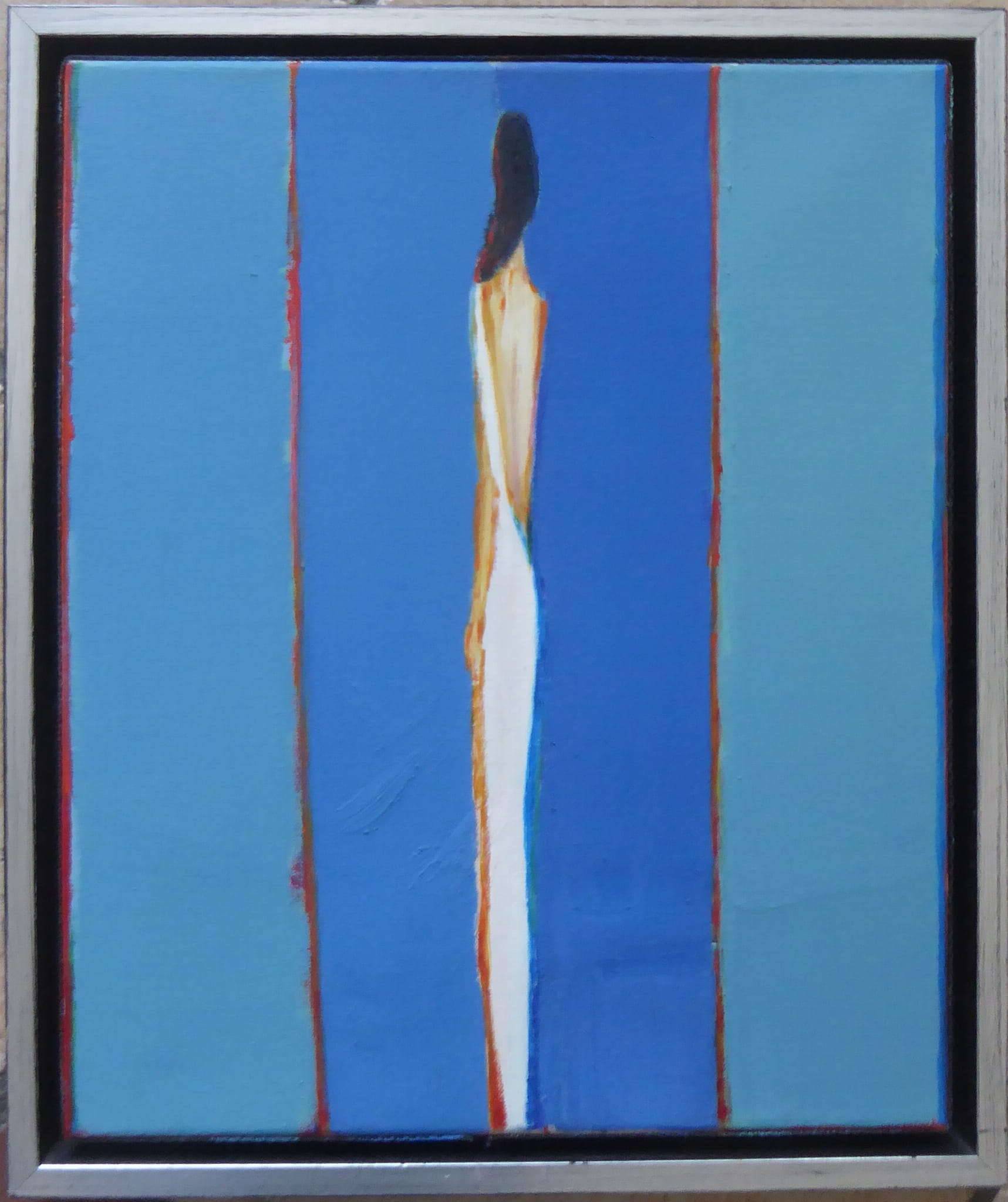 Obraz emanuje spokojem i pewnego rodzaju zagadkowością. Dominuje na nim niebieski kolor, podzielony różnymi odcieniami, przypominający bezchmurne niebo lub spokojne morze. Centralna postać, wydłużona i smukła, zdaje się unosić lub dryfować pomiędzy pionowymi, abstrakcyjnymi pasami. To pewna tajemnica, która kusi i przyciąga wzrok. Artysta zastosował kontrastowe zestawienie z bielą i pomarańczem, dodając kompozycji żywiołowości. Malowanie pędzlem wygląda na gładkie, a jednocześnie odczuwa się jego fakturę. Czyż nie jest to magiczne? Nastrój obrazu można określić jako kontemplacyjny i refleksyjny, prowokując do zadumy nad samotnością i przestrzenią. Look at this! Może ktoś widzi w tej postaci swoją samotną wędrówkę przez życie. Gdy patrzę na ten obraz, czuję spokój, ale i pewną tęsknotę. To, jakby ta smukła sylwetka miała coś do przekazania, coś, co tylko ona wie. Dla dziecka, byłaby to opowieść o wróżce unoszącej się na błękitnym tle.
