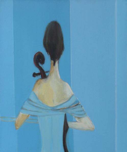 Na obrazie widać postać kobiety, która stoi tyłem w minimalistycznej, niemal monochromatycznej scenerii zdominowanej przez różne odcienie błękitu. Jej smukła sylwetka kontrastuje z ciemniejszym brązowym kształtem instrumentu, który trzyma przy ramieniu. Włosy kobiety są ciemne, zebrane w prosty, elegancki sposób, co dodaje całemu obrazowi subtelnego uroku. Kompozycja obrazu jest prosta, ale niezwykle wymowna, a dominujący błękit nadaje całości chłodny, spokojny nastrój. Artysta wykorzystał delikatne pociągnięcia pędzla, co nadało obrazowi subtelną teksturę. To trochę takie dreamy, jakby postać była zanurzona w myślach lub wspomnieniach. Obraz może wywoływać uczucie nostalgii i spokoju, ale też jakiejś takiej tajemnicy. Wyobrażam sobie muzykę, która zaraz popłynie z tego obrazu. "Ja też chcę umieć grać!" pomyślałby ktoś młodszy. Prostota formy i kolorystyka mogą sugerować poszukiwanie wewnętrznego spokoju lub chwilę wytchnienia od zgiełku dnia codziennego. Ten obraz to taka little escape, gdzie można się zatrzymać, pomyśleć i po prostu być tu i teraz.