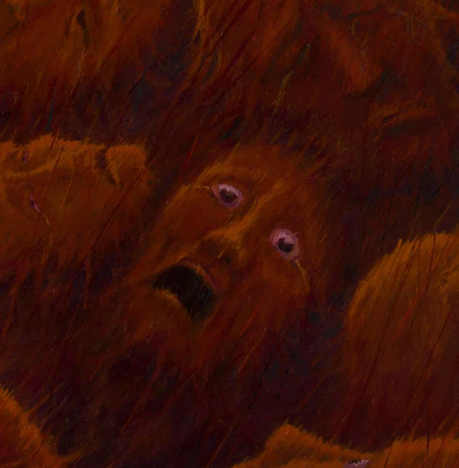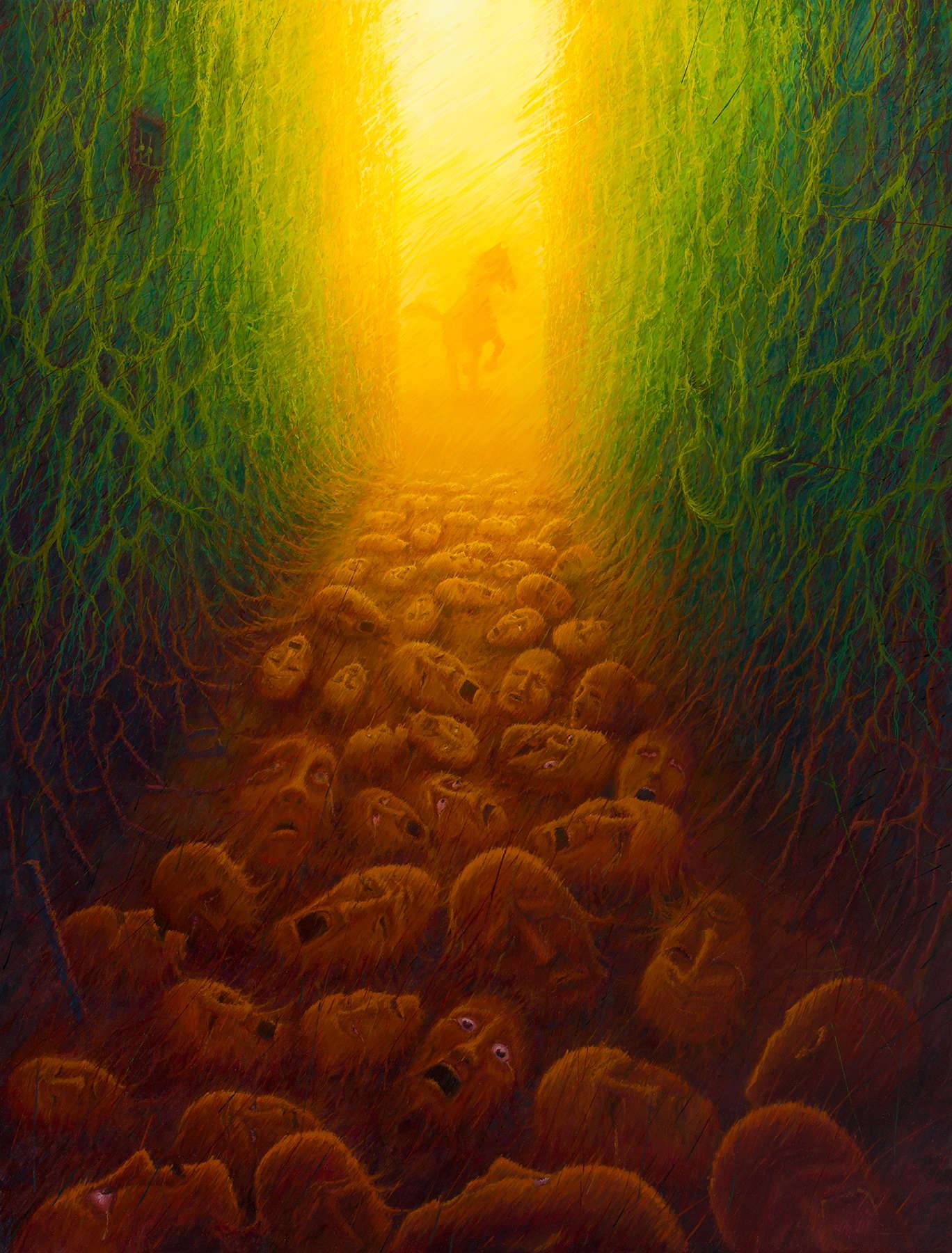 Na obrazie dominuje intensywna kolorystyka zieleni i żółci, które tworzą kontrastowy labirynt, prowadzący wzrok ku jasno oświetlonej postaci konia. Kompozycja dzieła jest zbudowana z dynamizmu pionowych linii, które przyciągają uwagę do centralnego punktu. Ciemne, przygaszone odcienie pomarańczy na dole obrazów przedstawiają ludzkie twarze, pełne emocji i niepokoju, które zdają się wystawać z ziemi. Atmosfera obrazu jest tajemnicza, niemal surrealistyczna, jakbyśmy oglądali scenę z innego świata. Styl artystyczny przypomina techniki impresjonistyczne, z nieregularnymi pociągnięciami pędzla dodającymi tekstury i głębi. Można powiedzieć, że obraz wywołuje uczucie niepokoju i refleksji na temat ludzkiej kondycji. Zastanawiam się, co chciał powiedzieć artysta. Dlaczego te twarze wyglądają tak zagubione? Obraz sprawia wrażenie, jakbyśmy znajdowali się na krawędzi krainy snu i rzeczywistości. Dla dziecka wszystko tu jest magiczne - "Konia galopuje w magicznym tunelu!". Obraz można by opisać jako "mesmerizing", ponieważ ciągnie za sobą nasze myśli w nieznane. Ten oniryczny świat przynosi ze sobą wiele pytań i wywołuje morze emocji, zachęcając do dłuższego zastanowienia się nad jego znaczeniem.