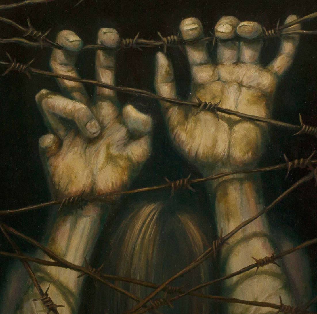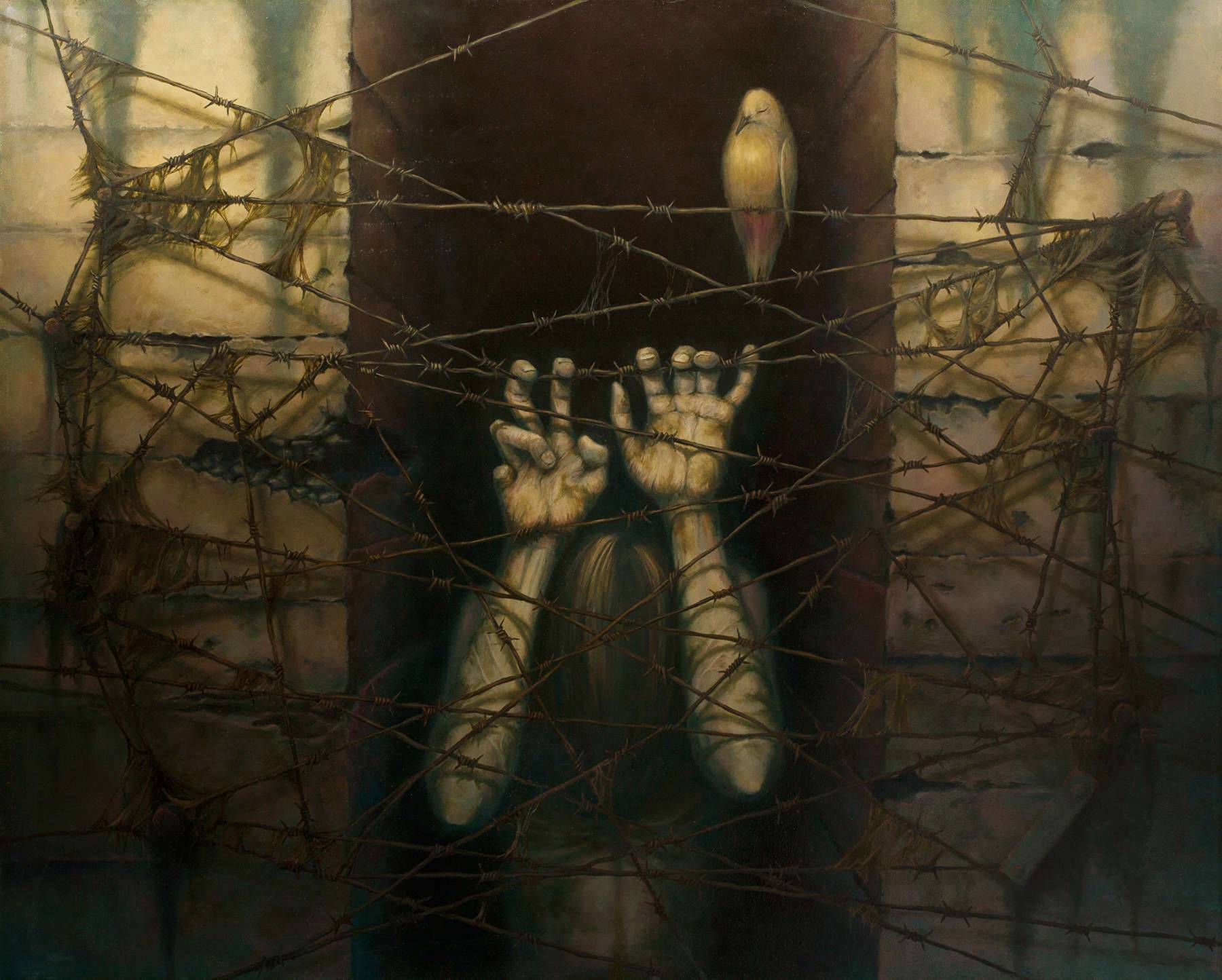 Obraz emanuje tajemniczością i niepokojem, pełen jest bogatych, ciemnych barw, które otulają postać uwięzioną za drutem kolczastym. Kolory są stonowane, dominują ciemne zielenie, browne i żółcie, co dodaje mrocznego klimatu. Centralnie położona sylwetka postaci, z unoszącymi się do góry rękoma, zdaje się szukać wyjścia. Obok niej siedzi mały ptak - jego obecność jest jakby symboliczną nadzieją na wolność. Kompozycja obrazu jest złożona, pełna kontrastów między organicznymi liniami drutów a geometrycznym tłem. Styl artystyczny przywodzi na myśl surrealizm z elementami low-key lighting, gdzie cienie i światło budują nastrój. Artysta zastosował techniki dające wrażenie realności, ale wprowadzając subtelne przesunięcia i złamania perspektywy, podkreślają surrealistyczny efekt. Obraz może wywoływać emocje osamotnienia, zamknięcia, ale także przebłyski nadziei. To trochę tak, jakby ktoś czekał na cud. Może to, co na pierwszy rzut oka wydaje się mroczne, skrywa wewnętrzne światło. Ktoś może stwierdzić, że wszystko tu krzyczy freedom, choć niepozornie i z cicha. Dla mnie osobiście, to takie "wow", które sprawia, że zastanawiam się nad granicami, które sami sobie stawiamy. Małe dziecko powiedziałoby pewnie: "A czy ptaszek pomoże tej pani?". Obraz jest trudny do jednoznacznej oceny, jego różnorodność pozwala na wiele interpretacji, każde spojrzenie przynosi nową refleksję.