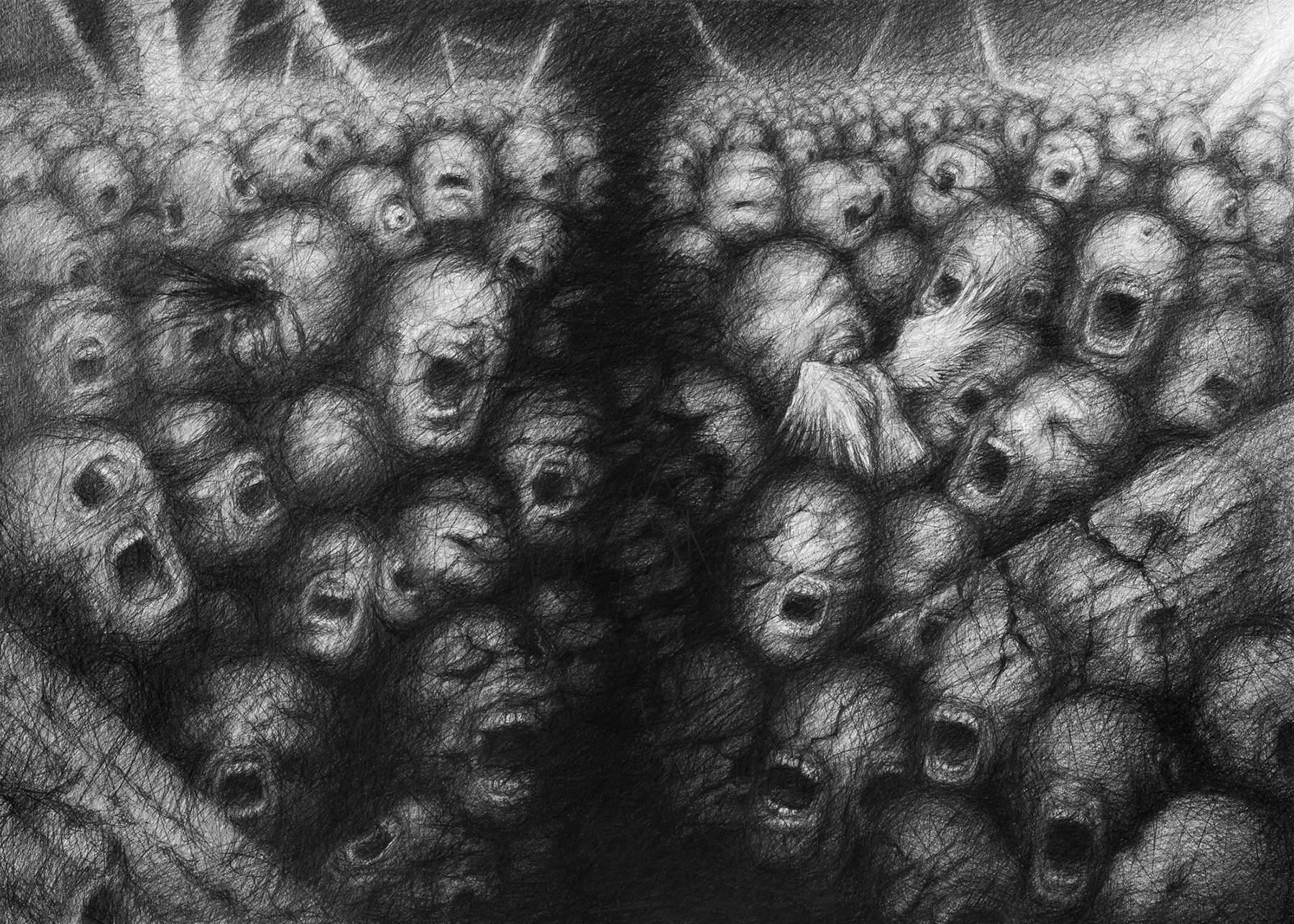 Na tym dynamicznym obrazie widzimy gęstą masę głów, wyrażających skrajne emocje. Dominują tu odcienie szarości i czerni, tworząc mroczny, niemal apokaliptyczny klimat. Kompozycja jest chaotyczna, pełna nieregularnych linii i zawirowań, które potęgują poczucie klaustrofobii. Atmosfera obrazu jest przytłaczająca, jakby oglądający wciągnięci byli w wir zdesperowanych krzyków. Styl artysty zdaje się celowo niedopowiedziany, surowy, z użyciem technik przypominających szkicowanie węglem. Widz może poczuć niepokój, a nawet strach, patrząc na te nieludzkie, wrzeszczące twarze. Może przypominać to horror, w którym trudno złapać oddech. Ten obraz może sprawić, że poczujesz się jak w środku koszmaru. "Scary", chciałoby się powiedzieć. Wyobrażam sobie, że siedmioletnie dziecko mogło by powiedzieć: "Ojej, dlaczego oni tak krzyczą?". To właśnie jest sztuka, która nie daje spokoju, skłania do refleksji nad ludzkimi emocjami i kondycją świata.