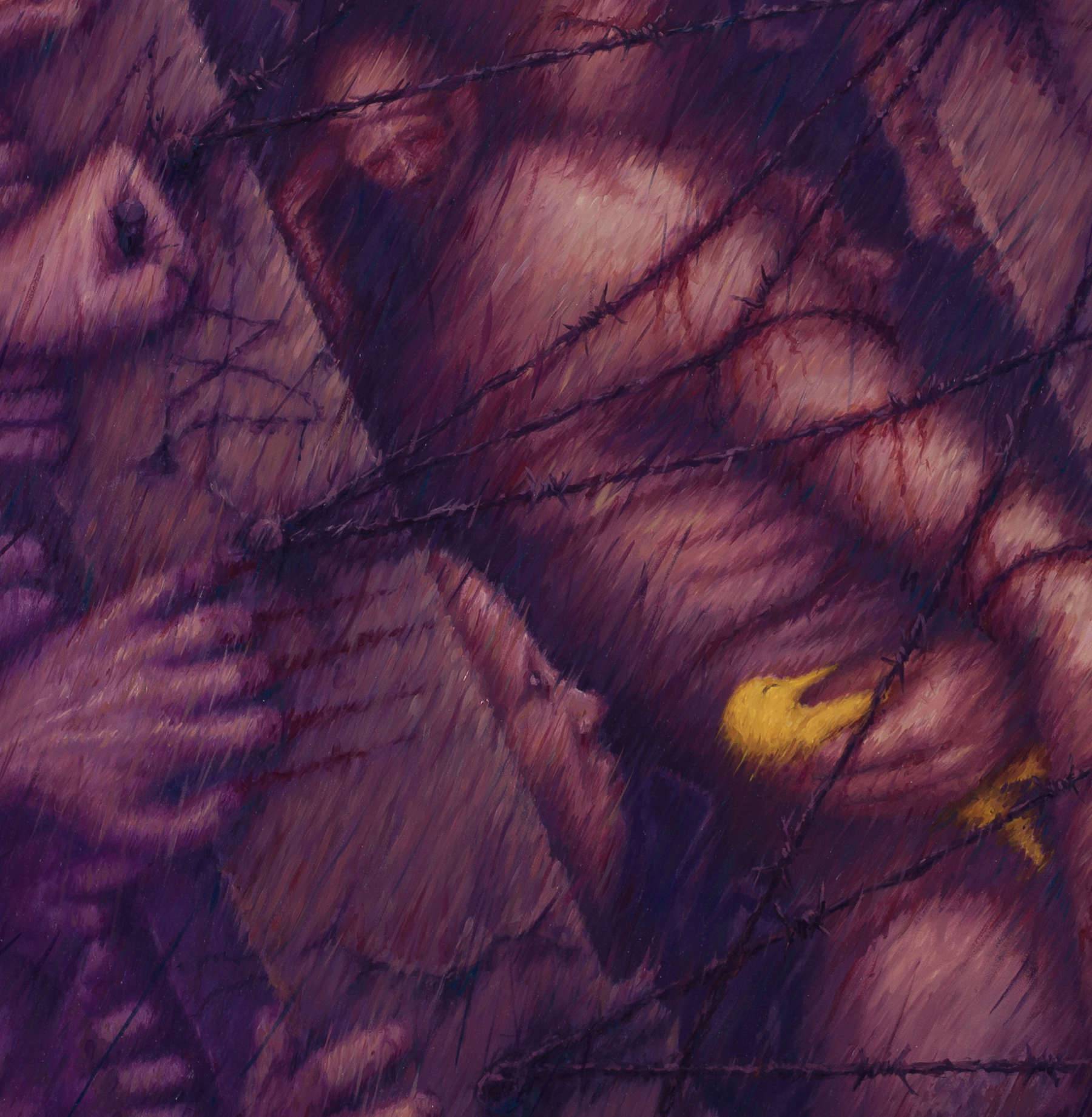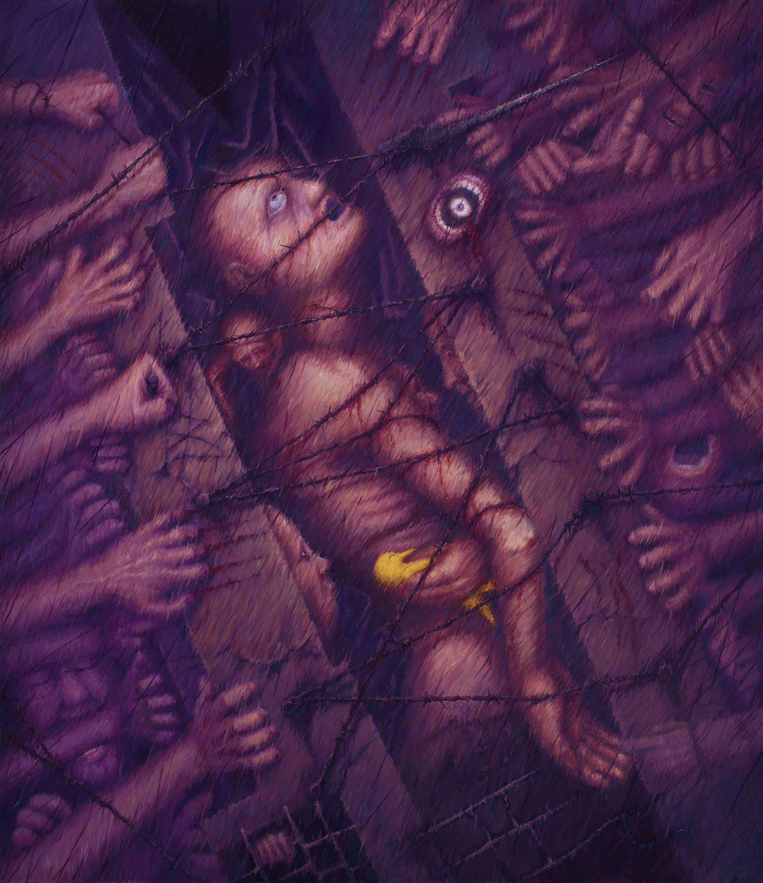 Obraz emanuje intensywnym napięciem, które tworzę nieziemskie i skrętawe linie koloru fioletowego oraz purpury. Przerażający motyw postaci otoczonej morzem dłoni budzi niepokój, jakby świat ciasno się zamykał. Centralnie umieszczona postać z wyrazem trwogi w oczach, otoczona drutem kolczastym, symbolizuje zamknięcie i izolację. Te detale nadają mu aurę tajemniczości, którą trudno jednoznacznie zinterpretować. Artystyczny styl obrazu pełen jest surowości i wyrazistości, temperowane przypalonymi, mrocznymi barwami. Technika artysty, wyraźnie używającego długich, szarpanych pociągnięć pędzla, dodaje dramatyzmu i głębokości całemu dziełu. "Wow!", mówi małe dziecko patrzące na takie dziwy. Emocje, jakie budzi, to mieszanka fascynacji i przerażenia. Obraz ten może symbolizować walkę z własnymi demonami czy złowrogą mocą świata zewnętrznego, czającą się za rogiem. Refleksja nad tym wszystkim skłania ku introspekcji, a także nad przemijaniem i siłą jednostki w nieprzejednanym świecie. Mimo chaosu i grozy, można poczuć nutę determinacji, jakby przebłysk "freedom" mimo wszystko.
