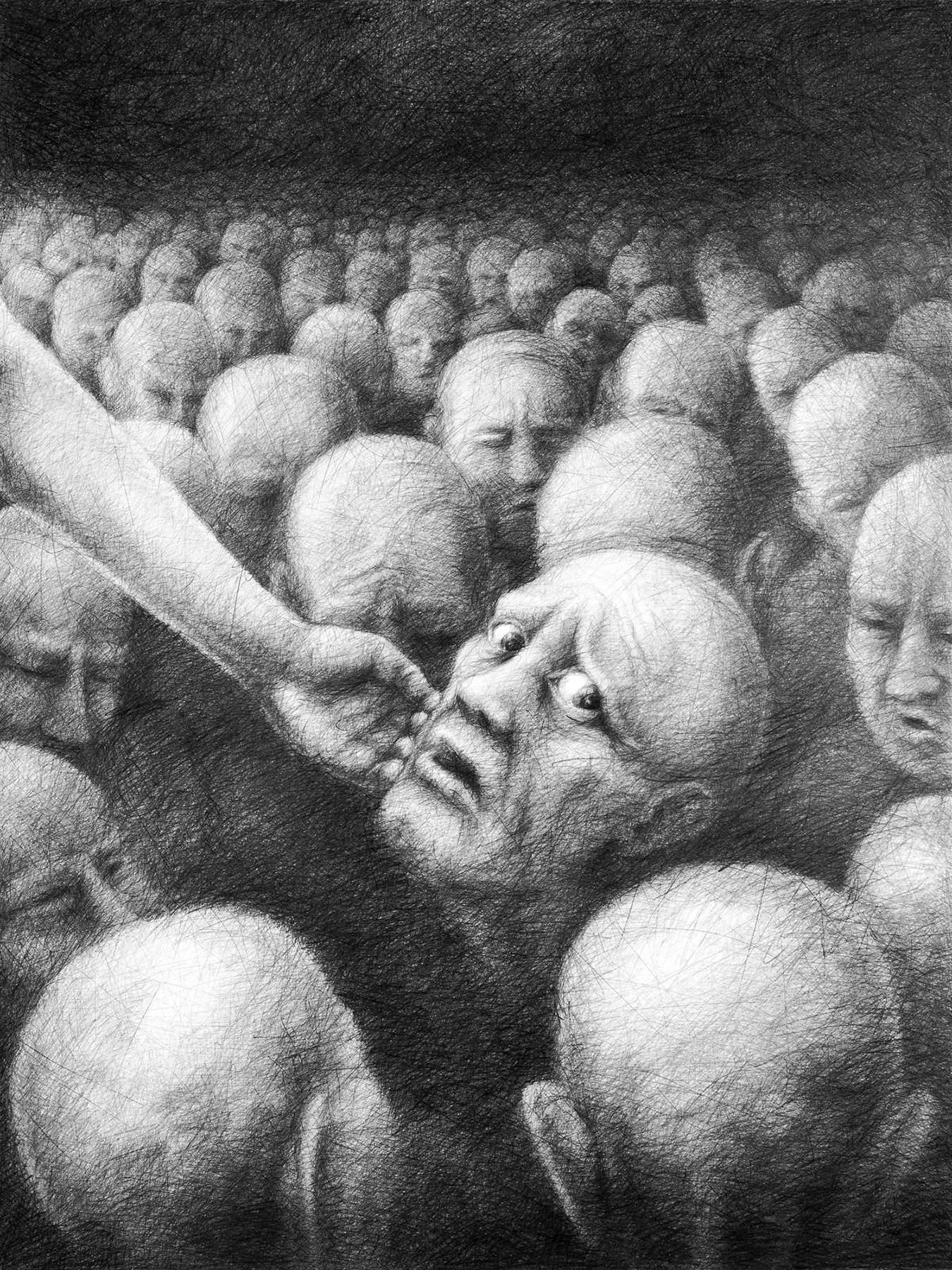 Na obrazie widać mnóstwo twarzy – rysowane w odcieniach szarości, skręcone i napięte. W centrum jedna z nich wyróżnia się, jakby właśnie doznała olśnienia lub szoku. Ogromna ręka delikatnie dotyka jej policzka, co nadaje scenie zupełnie niespodziewany kontrast między tłumem a momentem osobistej interakcji. Atmosfera jest ciężka, pełna niepokoju i zagadek. Artysta zastosował chaotyczny miks kreski i cienia, które potęgują uczucie zamknięcia. Szczerze mówiąc, patrząc na to, mam ciarki na plecach. Ta praca przemawia do mnie jak echo egzystencjalnych pytań, które kiedyś sobie zadawałem. Why are we here? Może artysta eksperymentował z symbolismem i próbował uchwycić uczucie samotności w tłumie. Fajnie by było zobaczyć coś bardziej kolorowego, ale to na pewno skłania do myślenia. Mamo, ale oni są dziwni! Styl jest intensywnie ekspresjonistyczny, z pewną dawką surrealizmu, która może sprawić, że zaczynamy się zastanawiać, co jest rzeczywistością.