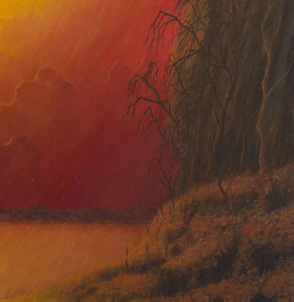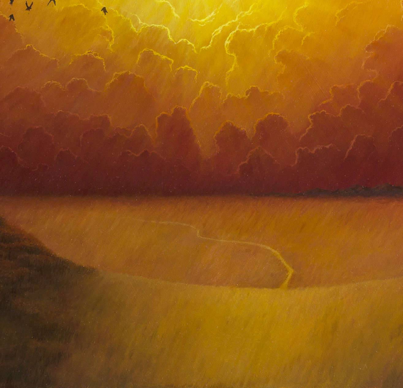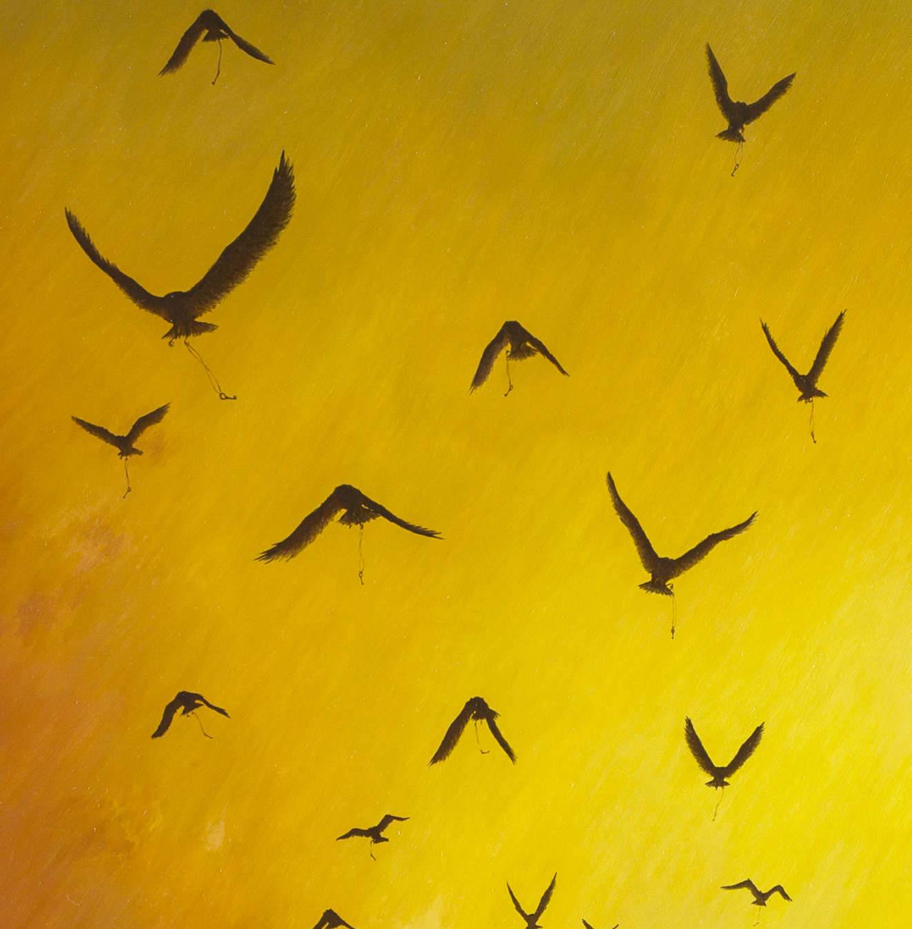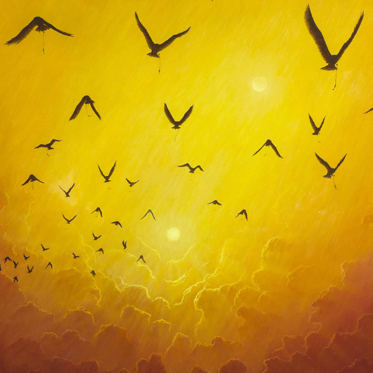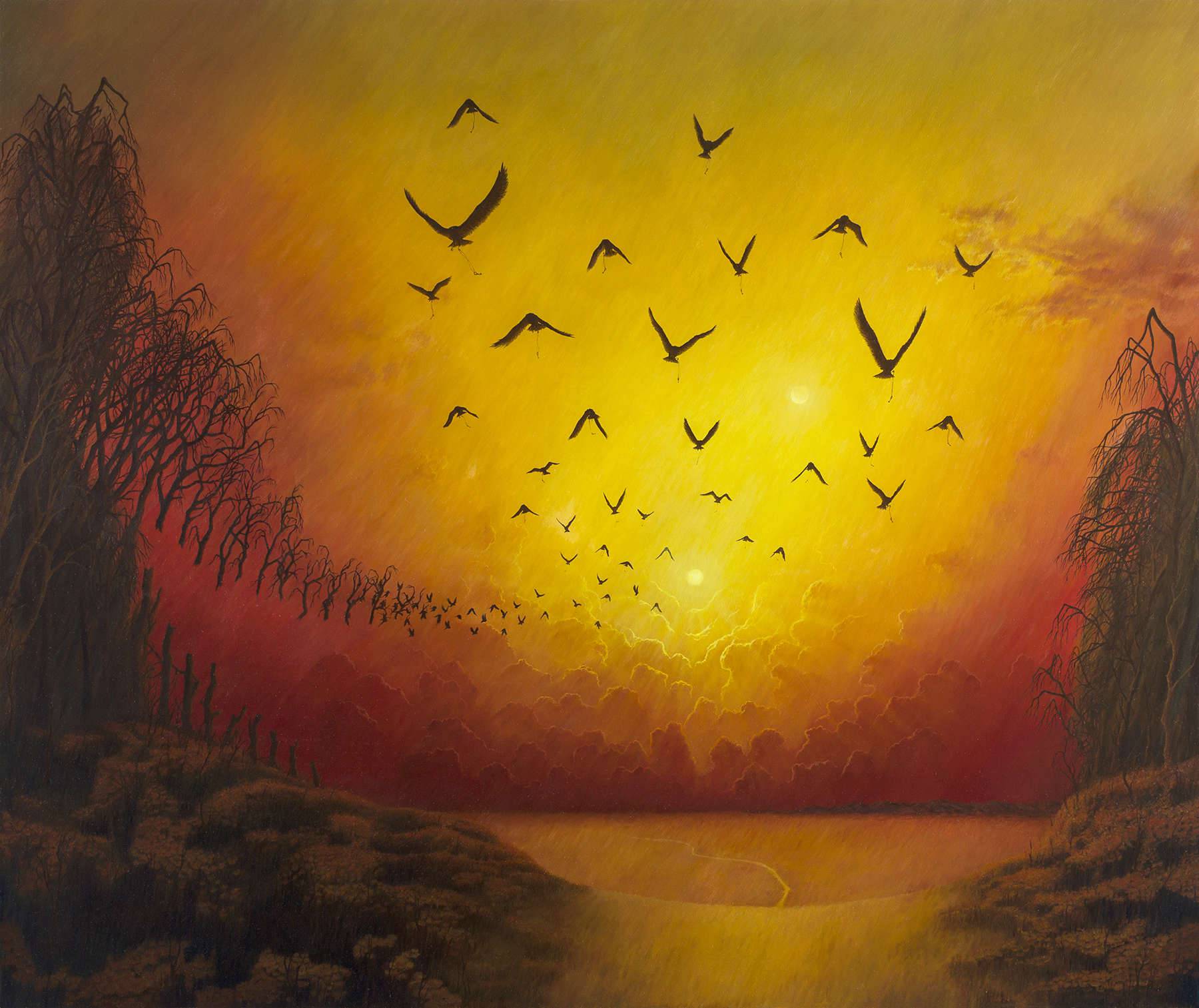 Obraz emanuje magią zachodzącego słońca, gdzie złote i czerwone kolory dominują całe tło. Lśniący żółty gradient nieba płynnie przechodzi w ciepły pomarańcz, prawie jak marshmallow w ogniu. Ptaki, uformowane w delikatne sylwetki, unoszą się ku niebu, tworząc narrację o wolności. Wyglądają jak czarne paciorki na sznurku, przeszywające powietrze z niesamowitą gracją. Drzewa po bokach obrazu są bezlistne, tworząc kontrast z żywymi barwami nieba. Ich poskręcane gałęzie dodają nuty niepokoju, ale i tajemnicy. Atmosfera tego dzieła wciąga, jest tajemnicza i nostalgiczna. Czuje się tu whisper of the wind, który delikatnie głaszcze krajobraz. Styl artystyczny w warstwie technicznej łączy impresjonizm z surrealizmem, co sprawia, że obraz jest zarówno rzeczywisty, jak i marzycielski. Dla mnie, to jak śnienie na jawie, chwila zatrzymana między dniem a nocą. Patrząc na to, czuję spokój, jakbym był częścią czegoś większego. "Ptaki lecą do domu!" powiedziałoby dziecko patrząc na to dzieło. To obraz, który mówi do serca, przypomina o prostocie i pięknie świata, jaki nas otacza.