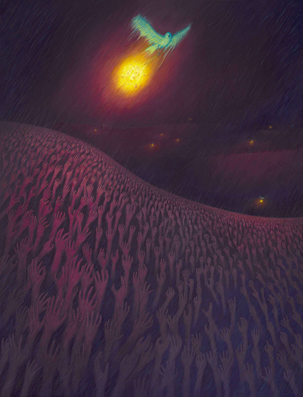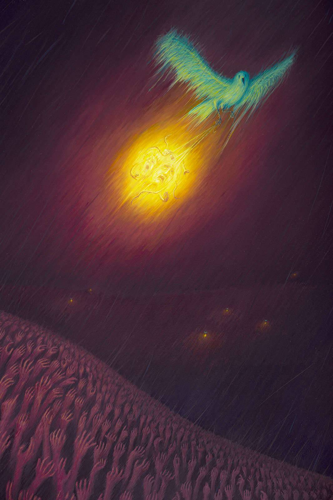 Na obrazie widzimy niezwykłe połączenie żywych kolorów i dynamicznych kształtów. Na pierwszym planie roi się morze wyciągniętych rąk, jakby próbujących dosięgnąć czegoś nieosiągalnego. Ich ciemnoróżowe odcienie kontrastują z ciemnym, granatowym tłem, które podkreśla dramatyzm sceny. Nad tym chaosem unosi się niebiańskie, świetliste stworzenie, które otacza złocista aura. Może to ptak, może duch? Nie wiadomo. Ale wygląda jakby przynosiło nadzieję. Atmosfera jest napięta, pełna emocji i oczekiwania. Nagle przypomniał mi się cytat z książki: "Hope lights eternal". Styl artystyczny to mieszanka surrealizmu i ekspresjonizmu. Użyte techniki – śmiałe pociągnięcia pędzlem i intensywna paleta barw – dodają całości niepokojącego uroku. Rany boskie, jakie to piękne! Patrząc na ten obraz, można poczuć dziwne napięcie, jakby świat zaraz miał się skończyć, ale z drugiej strony... może to początek czegoś nowego? Obraz może budzić niepokój, ale i fascynację. Wyciągnięte ręce zdają się mówić: „Chcemy tam być!”, podczas gdy ptak/duch emanuje spokojem. Także myślę sobie, że może to symbol walki o nadzieję, o coś lepszego. A mój mały brat mógłby powiedzieć: "Chciałbym tam polecieć!". Połączenie światła i ciemności tworzy efekt znanego kontrastu, co przyciąga wzrok i nie pozwala odejść.