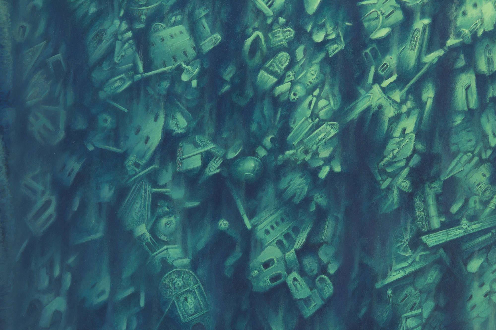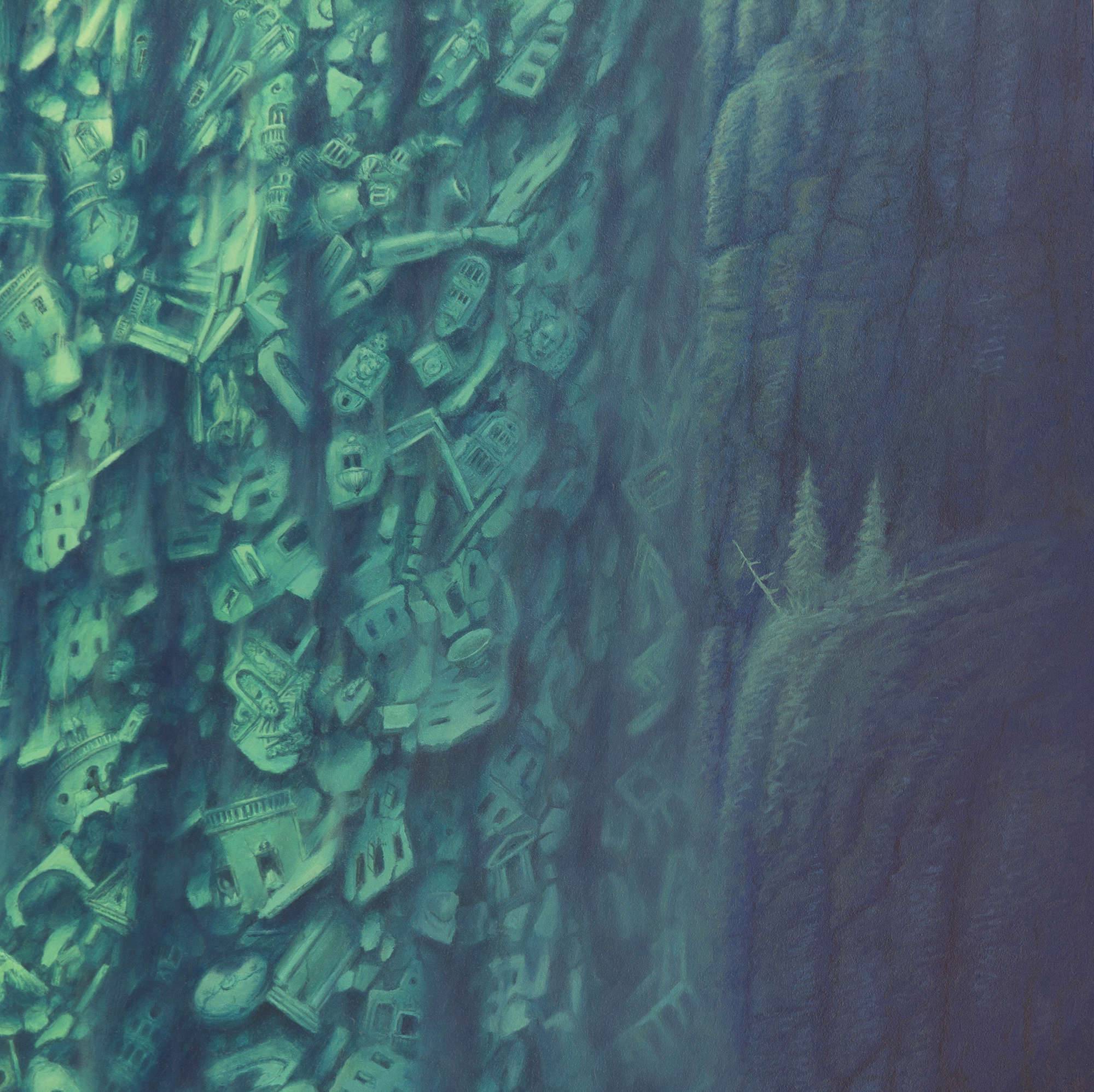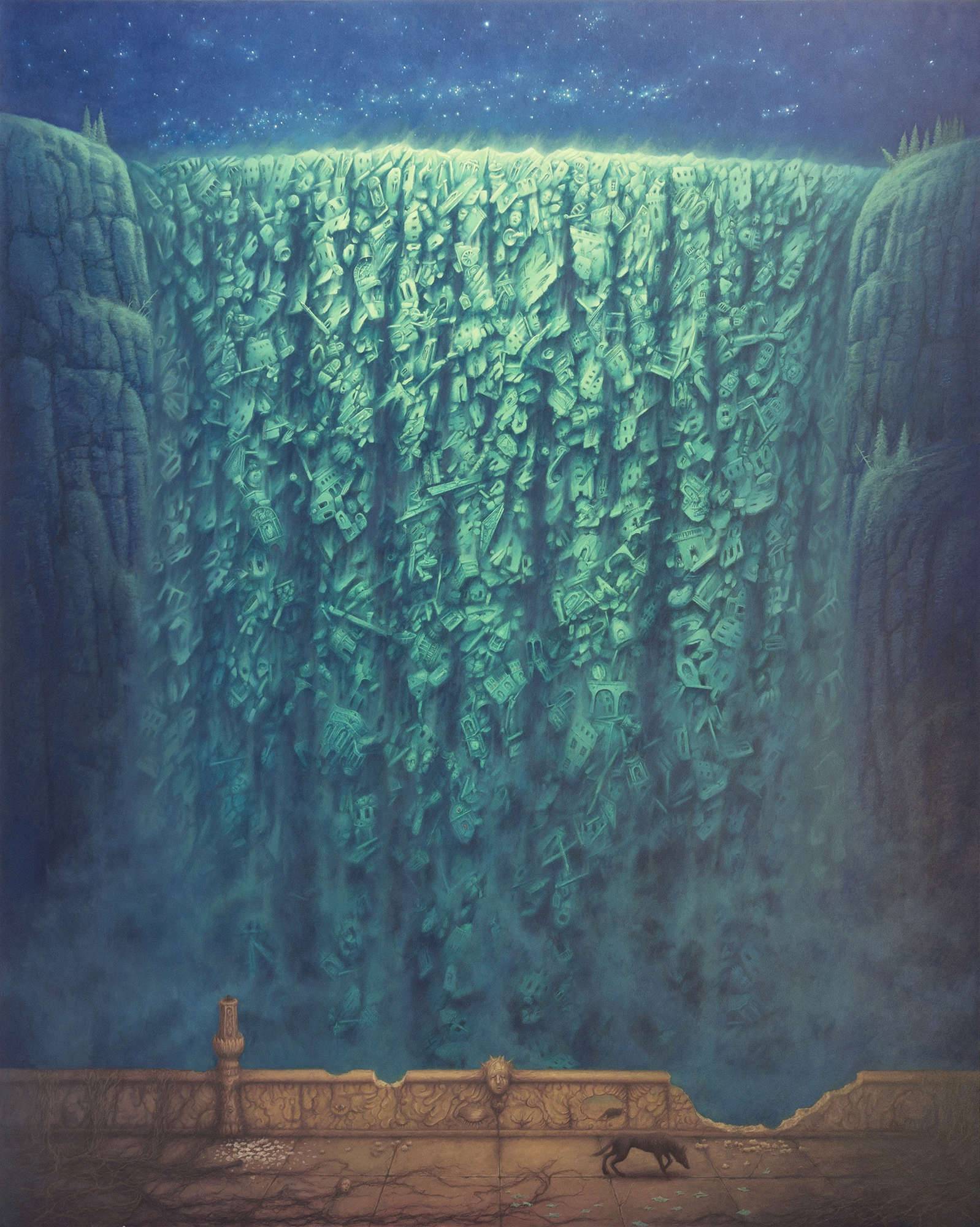 Obraz przedstawia tajemniczą scenerię przypominającą wodospad zbudowany z czegoś więcej niż tylko wody. Zielonkawe i niebieskie odcienie tworzą hipnotyzującą iluzję. Twarze i kształty chaotycznie układają się w pionowy labirynt. Cała kompozycja przywodzi na myśl surrealistyczny sen pełen zagadek. W tle widać rozgwieżdżone niebo, które dodaje całości nieco magicznego, wręcz onirycznego klimatu. Styl obrazu jest wyjątkowo detaliczny, każdy element wydaje się być tam umieszczony celowo. Artysta wykorzystuje techniki gry cieniami i światłem, tworząc trójwymiarowy efekt głębi. Atmosfera dzieła jest pełna napięcia i melancholii. Patrząc na to, można poczuć lekki dreszcz niepewności. To jakby patrzeć na granicę znanego świata. Może to symbol upływu czasu, może przemijania, kto wie. Wow, super obrazek, powiedziałoby dziecko, wskazując na kotka spacerującego na dole. Osobiste refleksje? No cóż, można przypuszczać, że ten wodospad symbolizuje nasze marzenia czy wspomnienia zatracane w czasie. Czy nie jest to trochę crazy? Jednak jednocześnie kusi, by odkrywać dalej. Obraz pobudza wyobraźnię, zachęca do własnych interpretacji i refleksji.