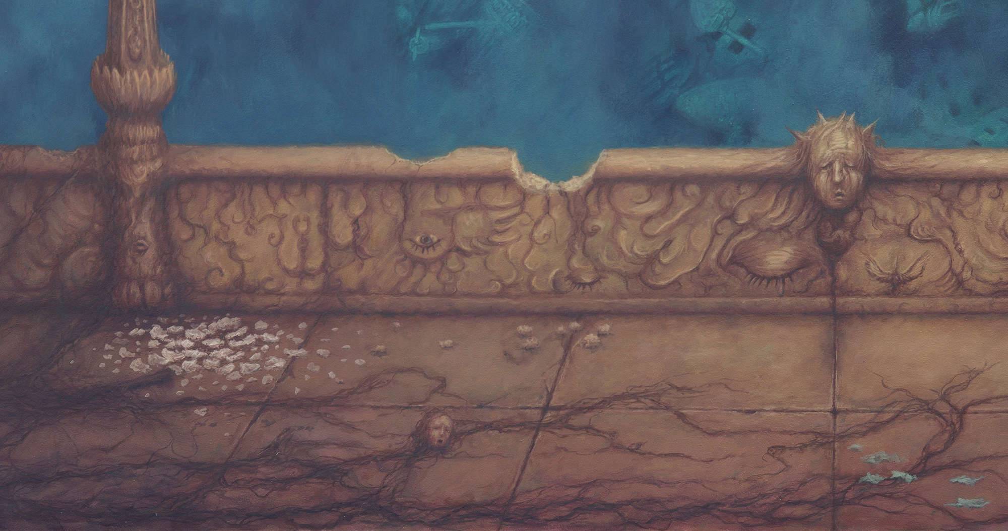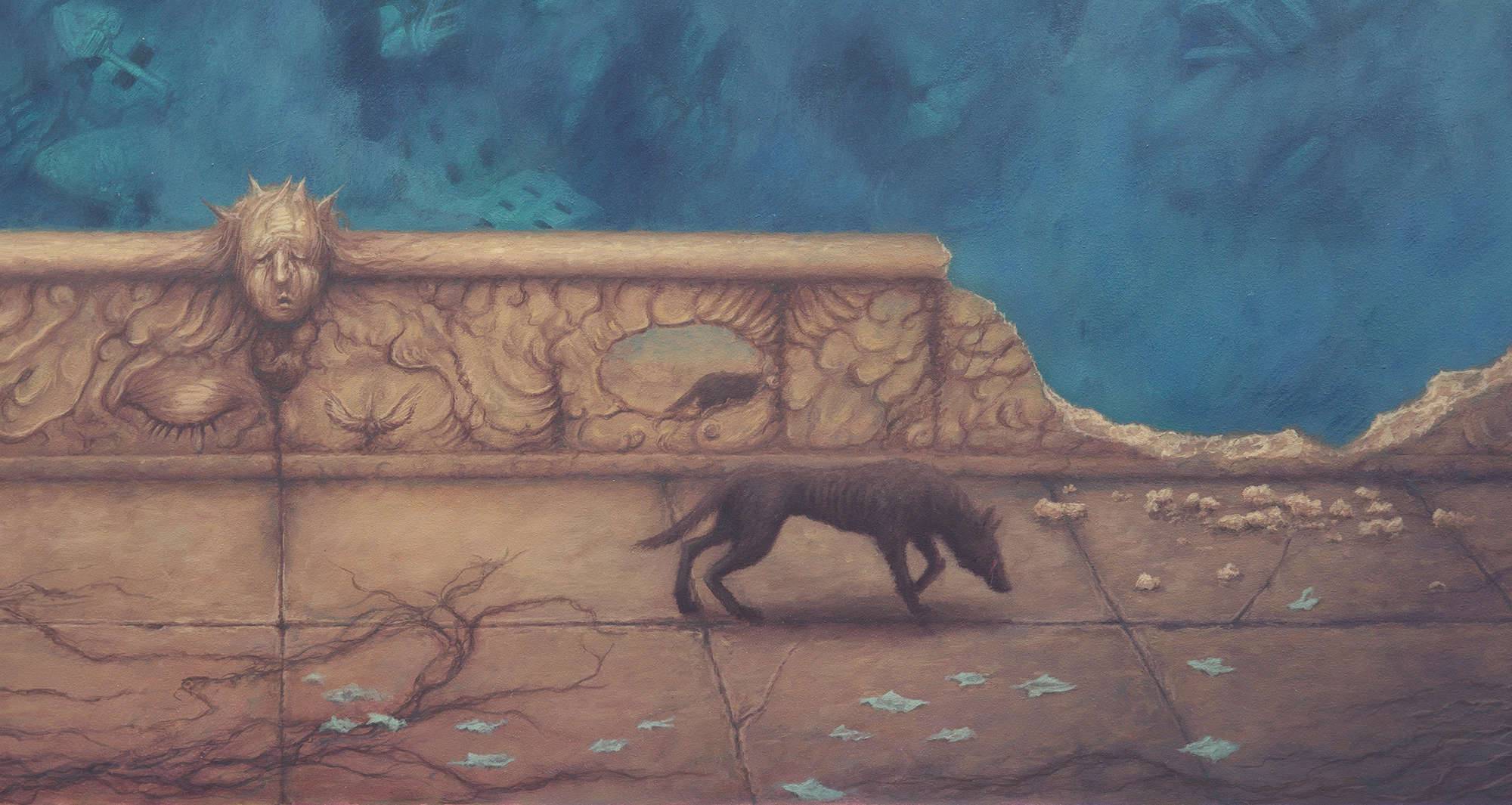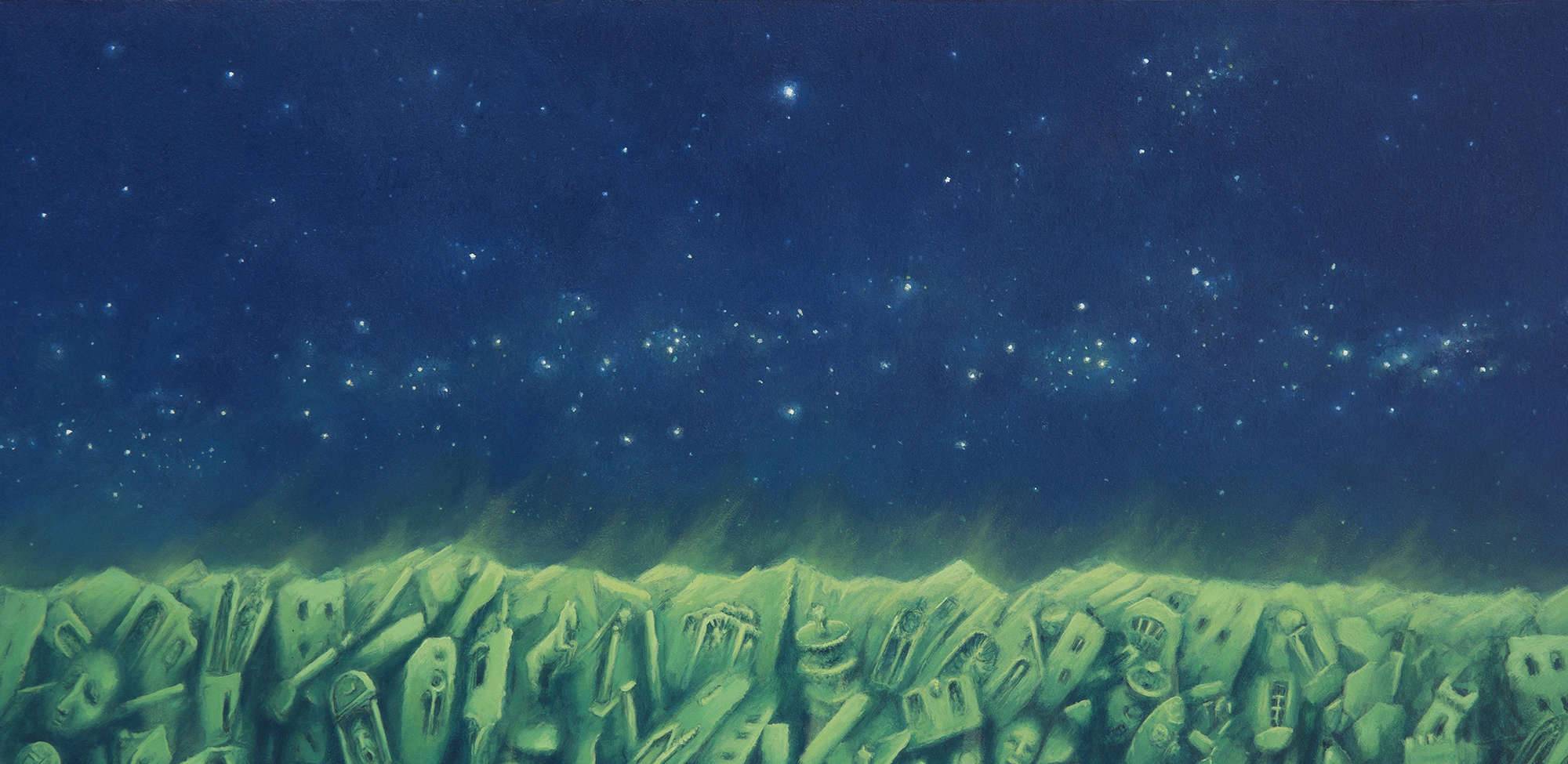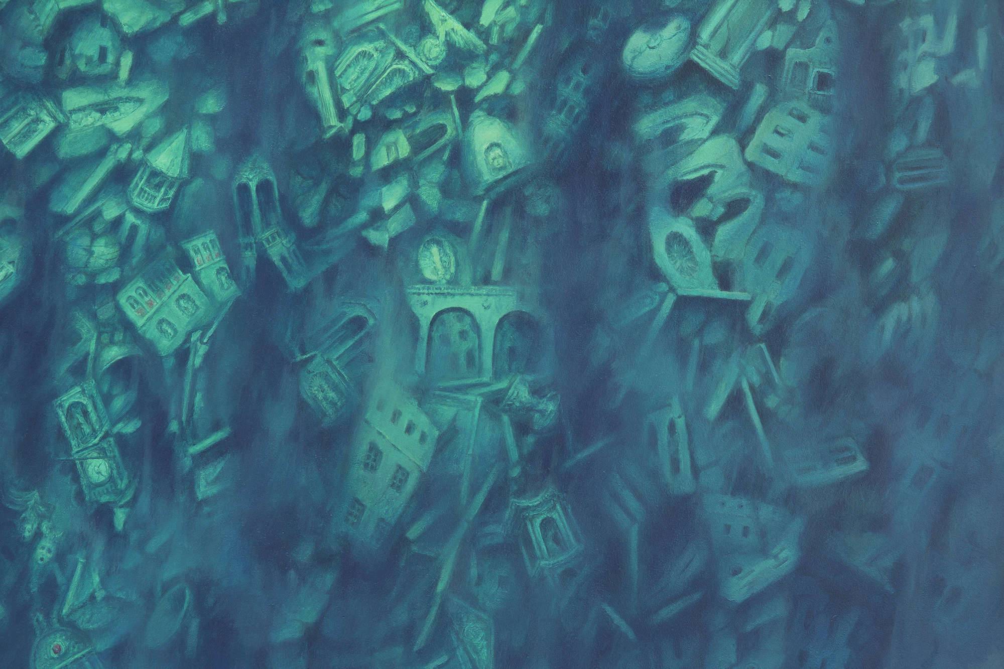 Obraz przedstawia tajemniczą scenerię przypominającą wodospad zbudowany z czegoś więcej niż tylko wody. Zielonkawe i niebieskie odcienie tworzą hipnotyzującą iluzję. Twarze i kształty chaotycznie układają się w pionowy labirynt. Cała kompozycja przywodzi na myśl surrealistyczny sen pełen zagadek. W tle widać rozgwieżdżone niebo, które dodaje całości nieco magicznego, wręcz onirycznego klimatu. Styl obrazu jest wyjątkowo detaliczny, każdy element wydaje się być tam umieszczony celowo. Artysta wykorzystuje techniki gry cieniami i światłem, tworząc trójwymiarowy efekt głębi. Atmosfera dzieła jest pełna napięcia i melancholii. Patrząc na to, można poczuć lekki dreszcz niepewności. To jakby patrzeć na granicę znanego świata. Może to symbol upływu czasu, może przemijania, kto wie. Wow, super obrazek, powiedziałoby dziecko, wskazując na kotka spacerującego na dole. Osobiste refleksje? No cóż, można przypuszczać, że ten wodospad symbolizuje nasze marzenia czy wspomnienia zatracane w czasie. Czy nie jest to trochę crazy? Jednak jednocześnie kusi, by odkrywać dalej. Obraz pobudza wyobraźnię, zachęca do własnych interpretacji i refleksji.