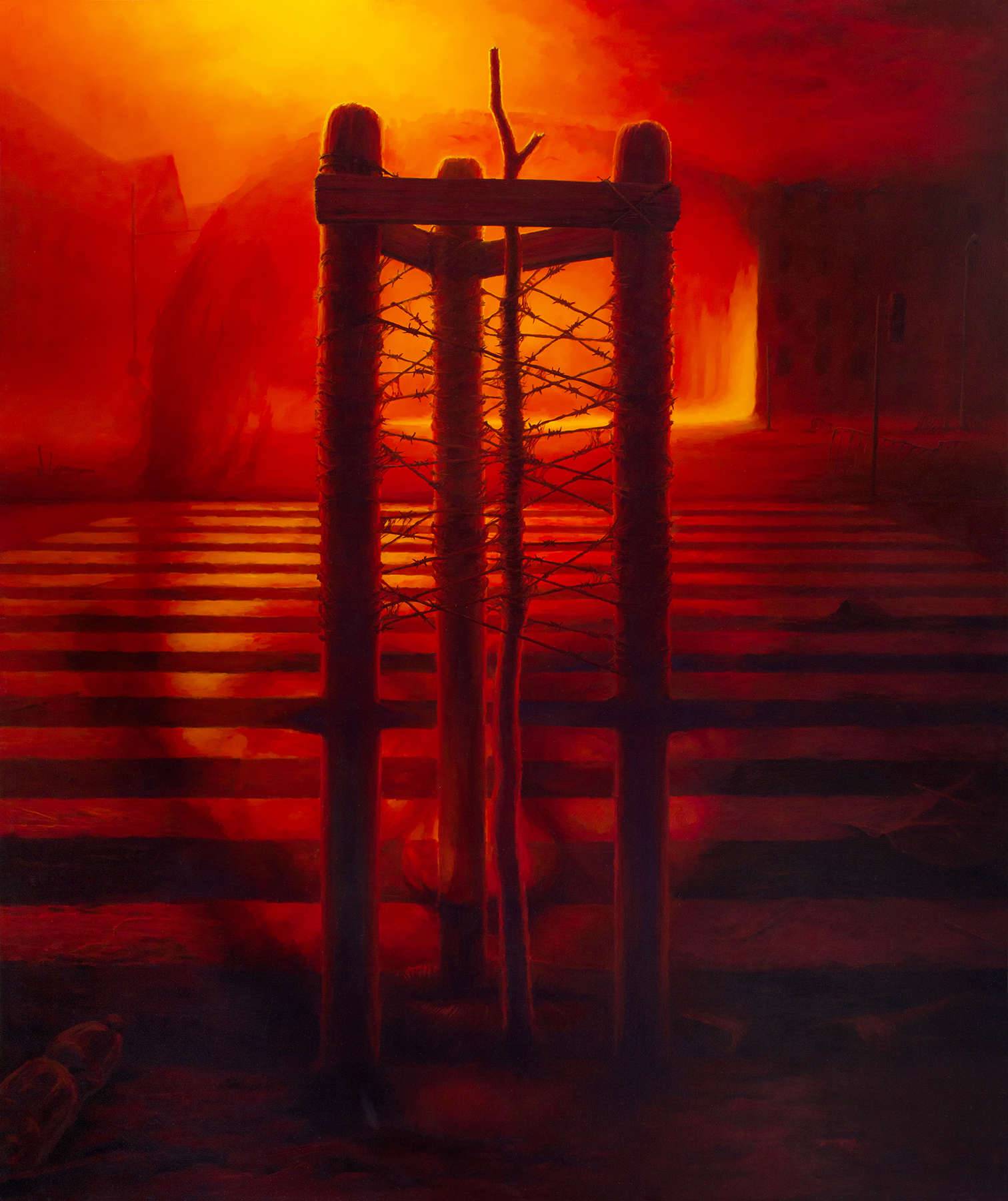 Na obrazie dominują odcienie czerwieni i pomarańczu, tworząc intensywną, niemal apokaliptyczną atmosferę. Centralnym elementem jest konstrukcja przypominająca drewniane pale, opleciona drutem kolczastym. Tło jest rozmyte, z zanikającymi kształtami budynków, co zwiększa poczucie niepokoju i tajemniczości. Światło, które wydobywa się zza konstrukcji, przypomina ogień lub zachód słońca, nadając scenie dramatyzmu i cieplejszego tonu. Obraz emanuje napięciem, wydaje się, że zaraz coś się wydarzy. Artysta wykorzystał kontrasty kolorów i światłocienia, aby przyciągnąć uwagę widza. Technika malarska jest wyrazista, z dynamicznymi pociągnięciami pędzla, które dodają energii całemu dziełu. Nastrój jest pełen niepewności, jakby cały świat zatrzymał się na chwilę w oczekiwaniu. Czy to koniec czy początek czegoś nowego? Może po prostu bajka, którą opowiada obraz. Użycie koloru czerwonego podkreśla emocjonalny chaos i napięcie, nie pozostawia miejsca na obojętność. Ten obraz na pewno skłania do refleksji i wywołuje mieszane emocje. W końcu każdy może w nim dostrzec coś innego, a jego magiczny "glow" sprawia, że aż chce się patrzeć dłużej, szukając ukrytych sensów.