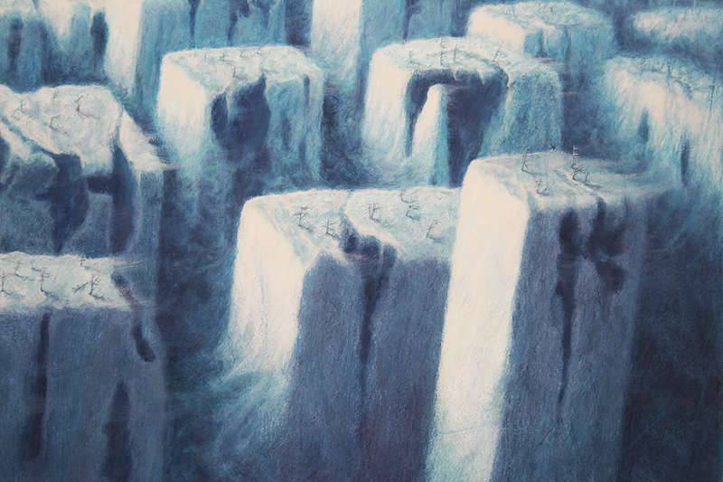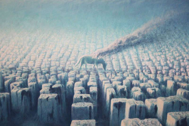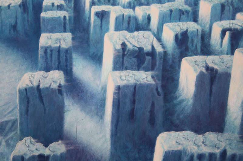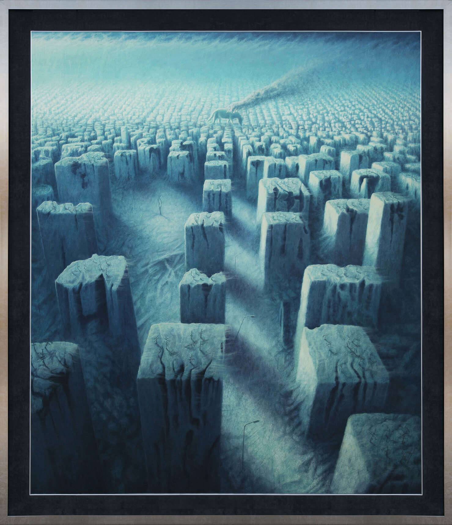 Obraz przedstawia mistyczny krajobraz, składający się z nieskończonego morza potężnych kolumn. Ich monumentalne formy w odcieniach szarości i błękitu przyciągają wzrok, tworząc iluzję przestrzeni, która zdaje się nie mieć końca. Kompozycja budzi wrażenie przerażającej izolacji. Mimo to, delikatne muśnięcia pędzla i subtelne przejścia barw nadają scenie harmonicznej spokoju. Atmosfera obrazu jest chłodna i tajemnicza, jakby wyrwana z odległego snu. Przez tę surrealistyczną podróż przechodzi samotna postać. To przypomina świat, gdzie czas stanął w miejscu, a ciszę można dosłownie usłyszeć. Styl artystyczny zdradza wpływy surrealizmu. Detaliczne, niemal fotorealistyczne oddanie szczegółów wprowadza odbiorcę w stan zadumy. Scena wywołuje różnorodne emocje: z jednej strony fascynację niesamowitym pejzażem, z drugiej niepokój wynikający z nieznanego przeznaczenia postaci. Wow, to wygląda jak ogromne mrowisko! Obraz skłania do refleksji nad samotnością oraz poszukiwaniem znaczenia w chaosie świata. Każda kolumna wydaje się mieć swoją historię, a centralna postać – swoją misję. Te przemyślenia mogą przywołać w widzu poczucie journey, która nie zawsze ma widoczny cel, ale zawsze prowadzi do nowego odkrycia.