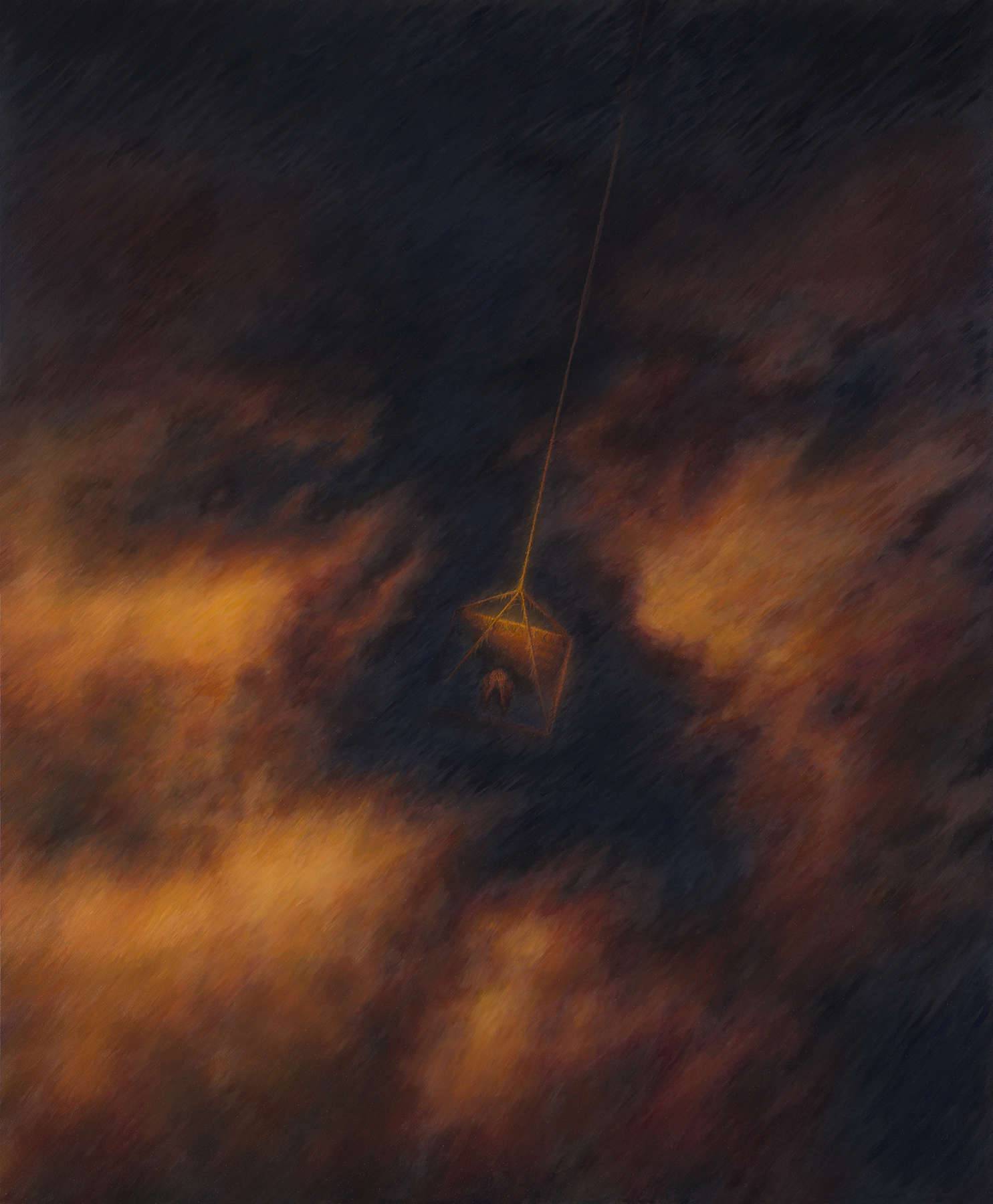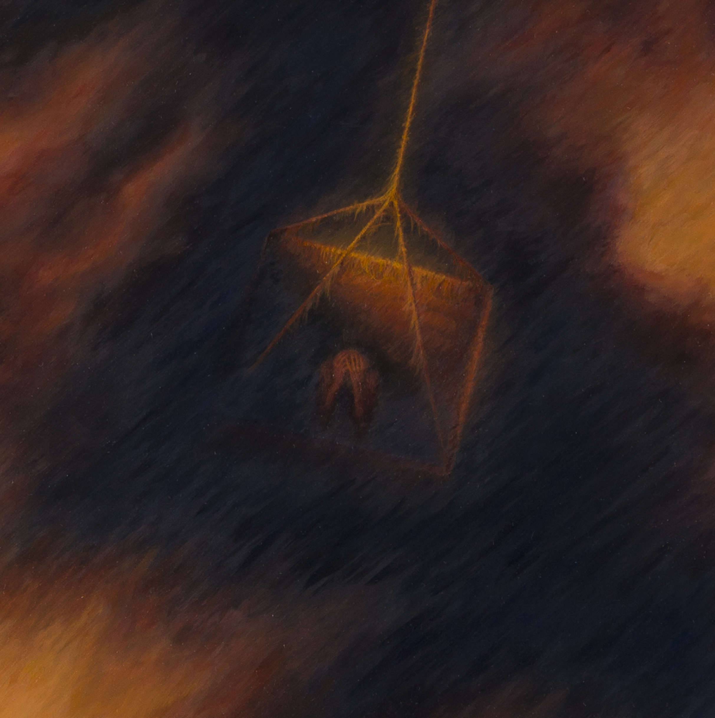 Na obrazie widzimy ciemne, burzowe chmury, które oplatają całe tło swoimi dramatycznymi odcieniami brązów i czerni. Jest tam coś takiego jak zawieszona, złota konstrukcja, która błyszczy niczym jewel w samym środku chaosu. Linie są miękkie, jakby artysta używał techniki pasteli lub delikatnych pociągnięć pędzla, co dodaje całości tajemniczej mglistości. Atmosfera jest pełna napięcia i tajemnicy, jakby zaraz miało się wydarzyć coś wielkiego. Można poczuć się trochę jak w epicentrum burzy, gdzie czas zdaje się zatrzymywać. Ten obraz aż krzyczy emocjami. Czujemy niepewność, trochę strach, ale i nadzieję - że może ta złota konstrukcja to symbol bezpieczeństwa. Wyobraźnia pracuje, a dziecko powiedziałoby pewnie: "To latawiec w chmurach!" Bo przecież nie wszystko musi być takie poważne. To dzieło sztuki przyciąga wzrok i zmusza do refleksji. Czy to samotność? Ucieczka? Artysta sprytnie bawi się światłem i cieniem, tworząc prawdziwy rollercoaster emocji. Coś takiego jak podróż do nieznanego, a może do głębi samego siebie.