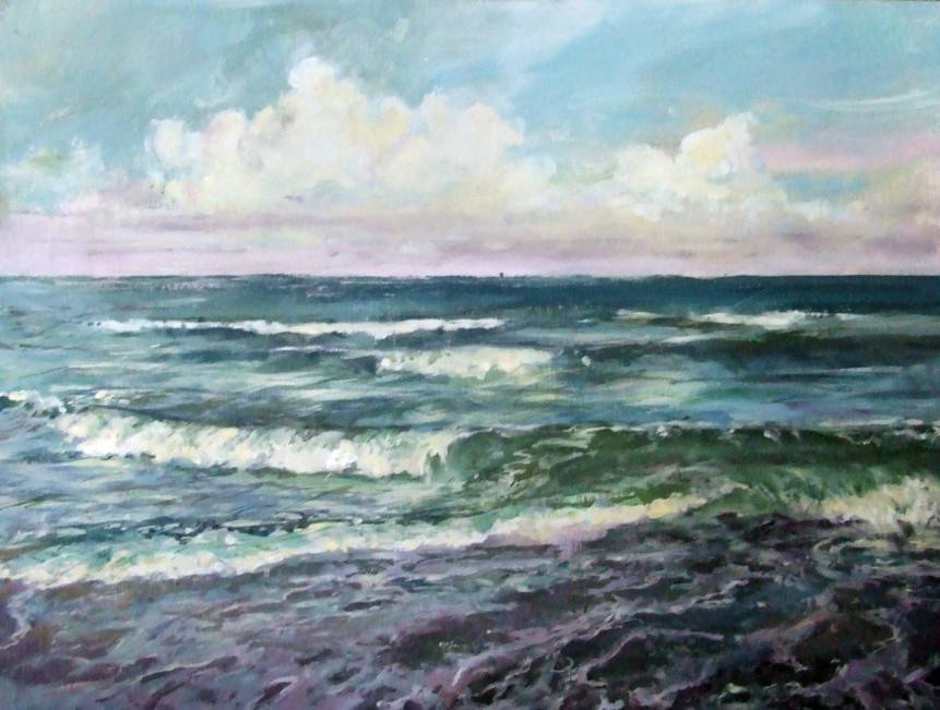 Ten obraz przedstawia niesamowite morze, które pulsuje życiem. Są tam niebieskie, zielone i białe odcienie fal, które zdają się nieskończone. Niebo jest delikatnie zachmurzone, z puchatymi chmurami rozciągającymi się na horyzoncie. Kompozycja obrazu prowadzi wzrok w głąb, ku tajemniczym wodom. Atmosfera emanuje spokojem i refleksją, ale też pewną surowością natury. Artysta używa subtelnych pociągnięć pędzla i mieszania kolorów, by oddać dynamikę fal. Styl jest nieco impresjonistyczny, choć całość zachowuje realistyczną nutę. Czujesz, jak morska bryza muśnie twoją twarz. Obraz może wywoływać uczucia nostalgii za spokojnymi dniami przy plaży, a także fascynację nieokiełznanymi siłami natury. "Na morzu jest duuużo wody i fale" – tak pewnie powiedziałoby dziecko. Patrząc na to malowidło, można poczuć ulgę i wolność, jakby wszystkie troski odpłynęły z falami. Refleksje pojawiają się samoistnie, water becomes the essence of life. W takim pejzażu można by się zagubić, zapomnieć o codzienności i zanurzyć w chwilowym zatraceniu.