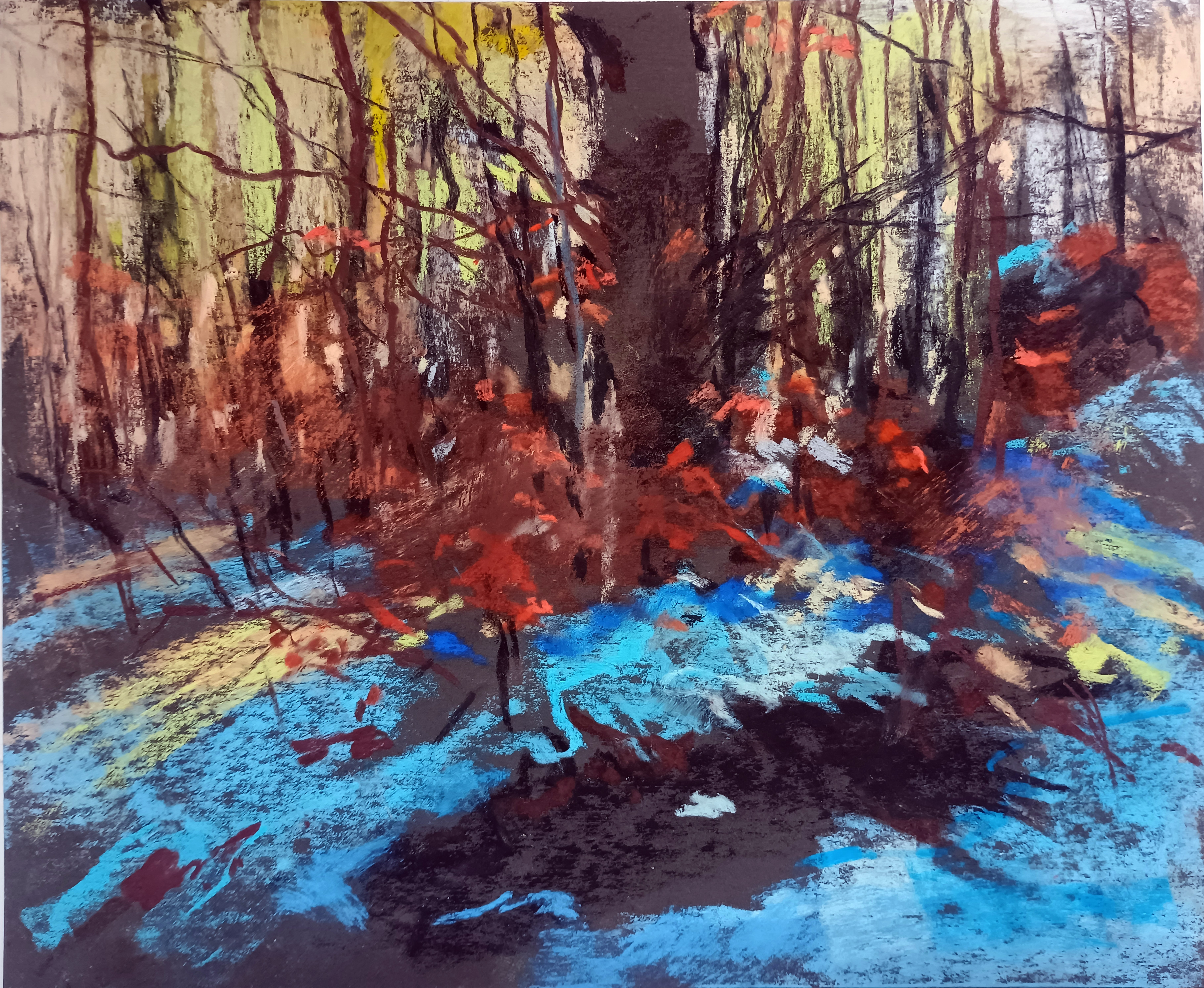 Przed nami obraz pełen energii i dramatyzmu, jak gdyby ktoś uchwycił fragment lasu w wirze emocji. Dominują intensywne kolory - ciepłe brązy i czerwienie mieszają się z chłodnymi niebieskimi i zielenie. Ta paleta kolorów tworzy dynamiczny kontrast, który przyciąga wzrok. Kompozycja jest chaotyczna, ale w tym chaosie jest pewna harmonia. Linie drzew wychodzą w nieokreślone kierunki, jakby chciały wyjść poza granice płótna. Nastrój jest żywiołowy, pełen niepokoju i tajemnicy. Artysta wykorzystał techniki mieszane, prawdopodobnie farby akrylowe, żeby zbudować tę wielowarstwową powierzchnię. Kiedy patrzę na ten obraz, czuję powiew wiatru i obecność nadchodzącej burzy. Może nawet slyszę szelest liści! To dzieło może wywoływać w widzu uczucie zagubienia, ale też fascynacji. Można zauważyć „wildness” kompozycji, która prowokuje do zastanowienia się nad chaosem natury i tym, jak człowiek próbuje go uporządkować. A może to po prostu skrawki przyrody widziane oczami dziecka, które błoto i liście traktuje jak największe skarby świata. Lubię te nieoczywiste emocje, które wywołuje. Taki obraz przypomina mi dawny spacer po lesie. Spacer, gdzie to, co znane, miesza się z nieznanym. Gdzie każdy krok może być odkryciem. Coś pięknego.