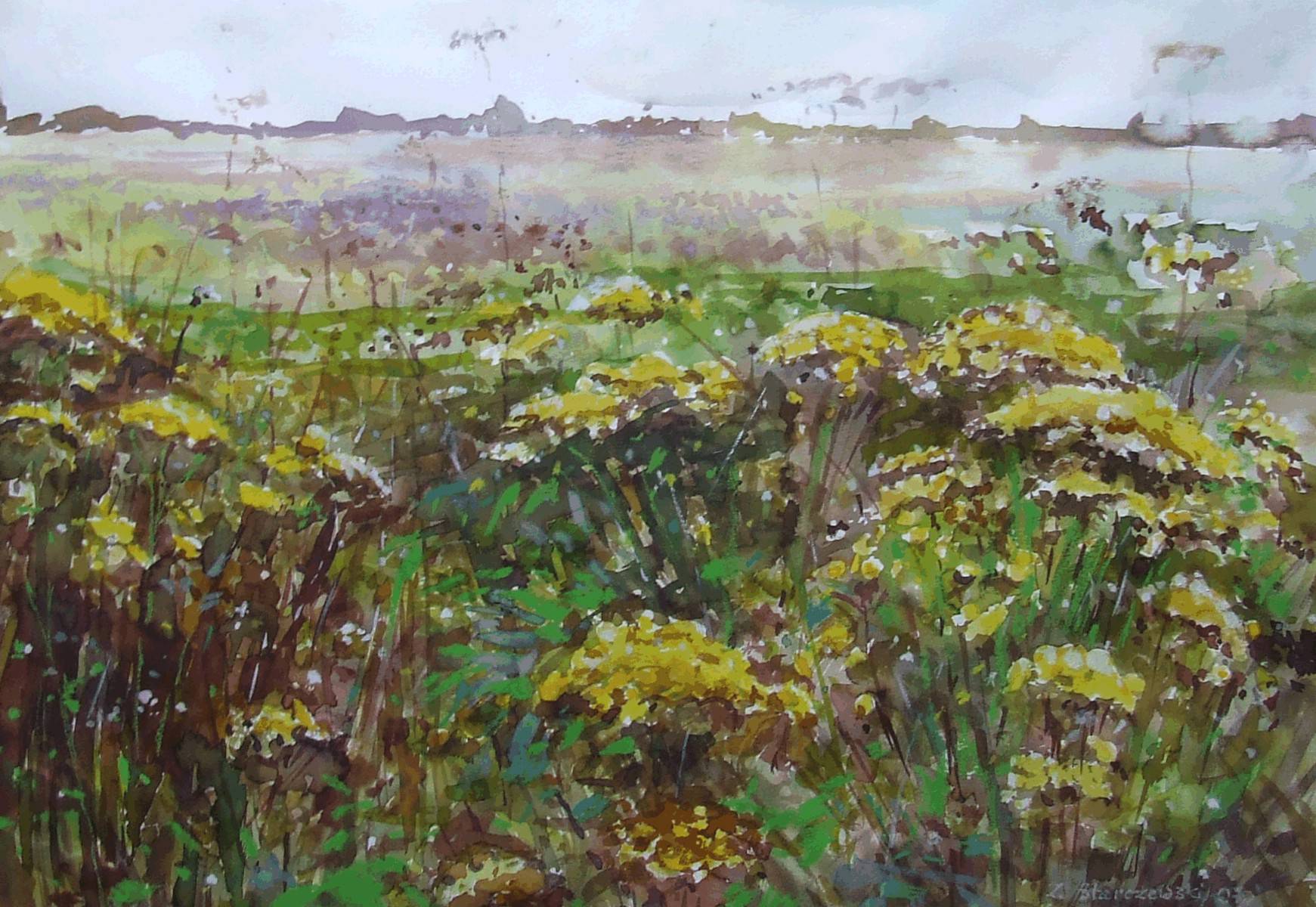 Obraz wprowadza nas w świat bujnej łąki, pełnej zieleni i żółci. Pola i kwitnące rośliny zdają się niemal ruchome, jakby tylko czekały, by popłynąć w letnim wietrze. Tonacja zielono-żółtych barw łagodnie przeplata się z delikatnymi odcieniami fioletu i brązu, tworząc harmonijną całość. Artysta stosuje tu technikę akwareli, która dodaje kompozycji lekkości i transparentności. W powietrzu czuć spokój i ciszę, jakby czas zatrzymał się w tym miejscu. Dziwne, ale to takie "peaceful". Chaotyczny układ roślin wydaje się nieco dziki, ale właśnie to przyciąga spojrzenie i nie pozwala oderwać wzroku. Nastrój jest senny, trochę nostalgiczy. Obraz przypomina o beztroskich chwilach spędzonych na wsi, przywołując ciepłe wspomnienia. Patrząc na niego, można poczuć zapach trawy i ciepło słońca. "Jakbym biegła po łące i się śmiała!" - powiedziałoby dziecko, zafascynowane tym widokiem. Kompozycja wywołuje emocje swobody i radości, a także tęsknotę za prostotą natury.