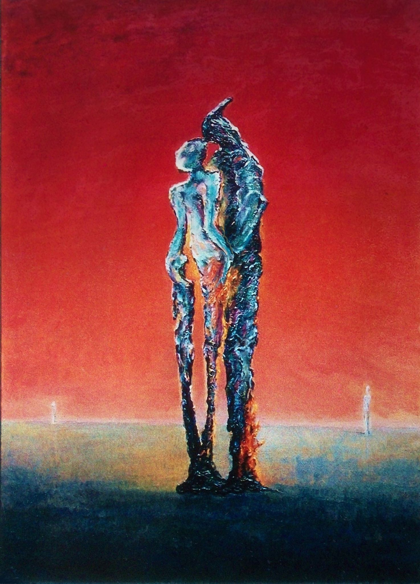 Samotność i tęsknota. Gorąca pustynia. Kochankowie. Surrealna para jak z wosku, tęskniąca za sobą i topiąca się. Na około nie wiadoma otwarta przestrzeń, a to wszystko pod alarmująco intensywnym karmazynowym niebem. Interesuące, co najmniej.